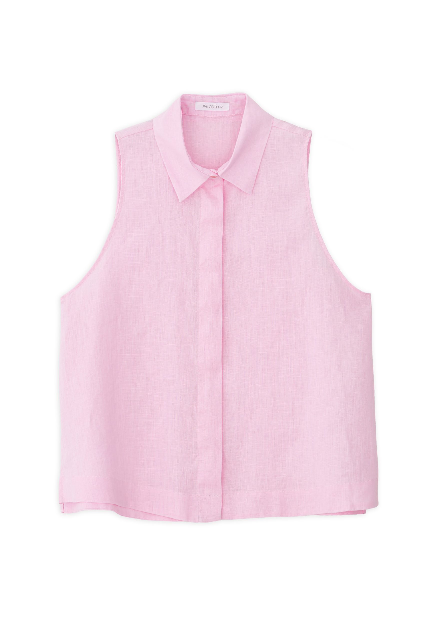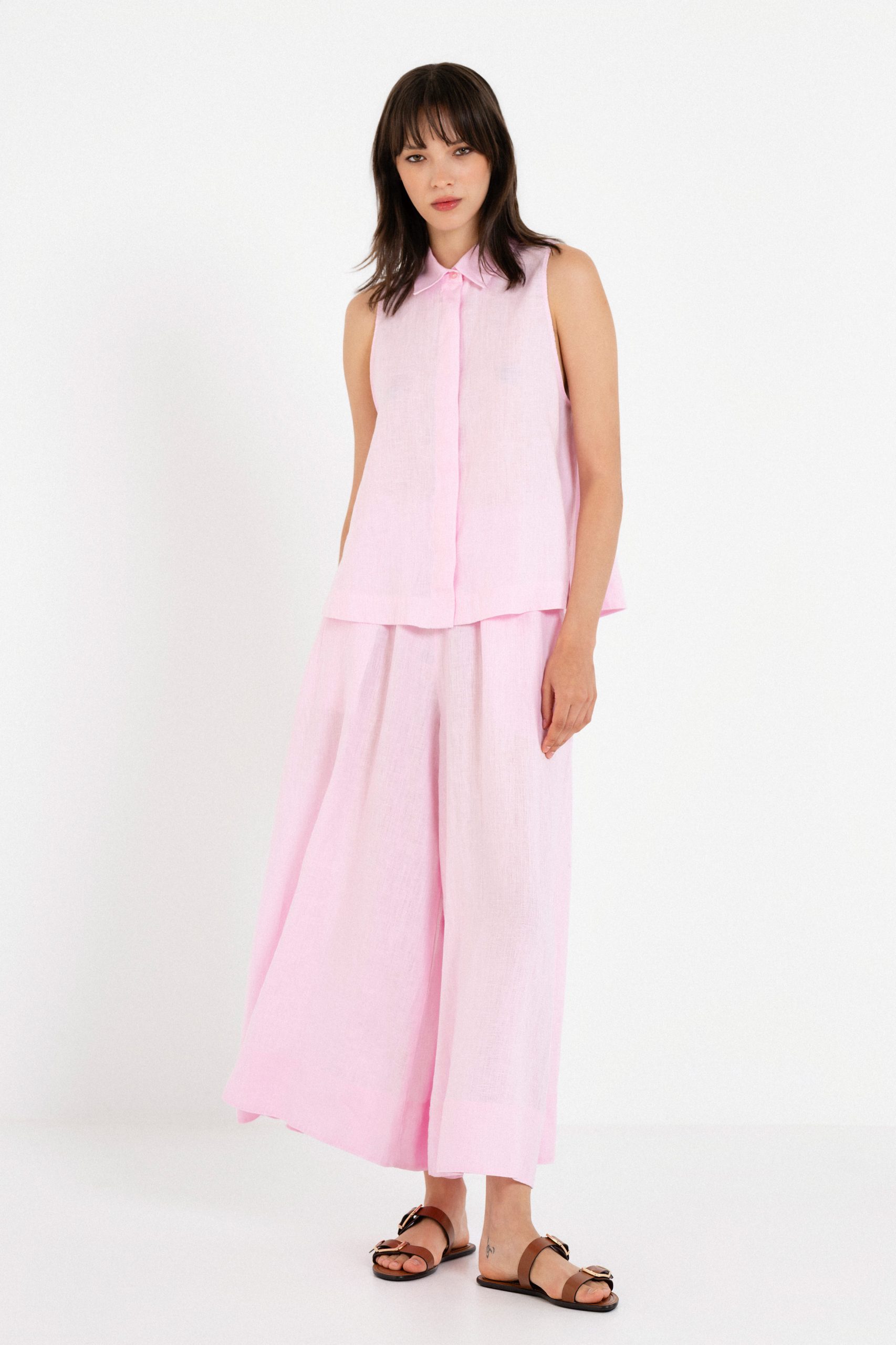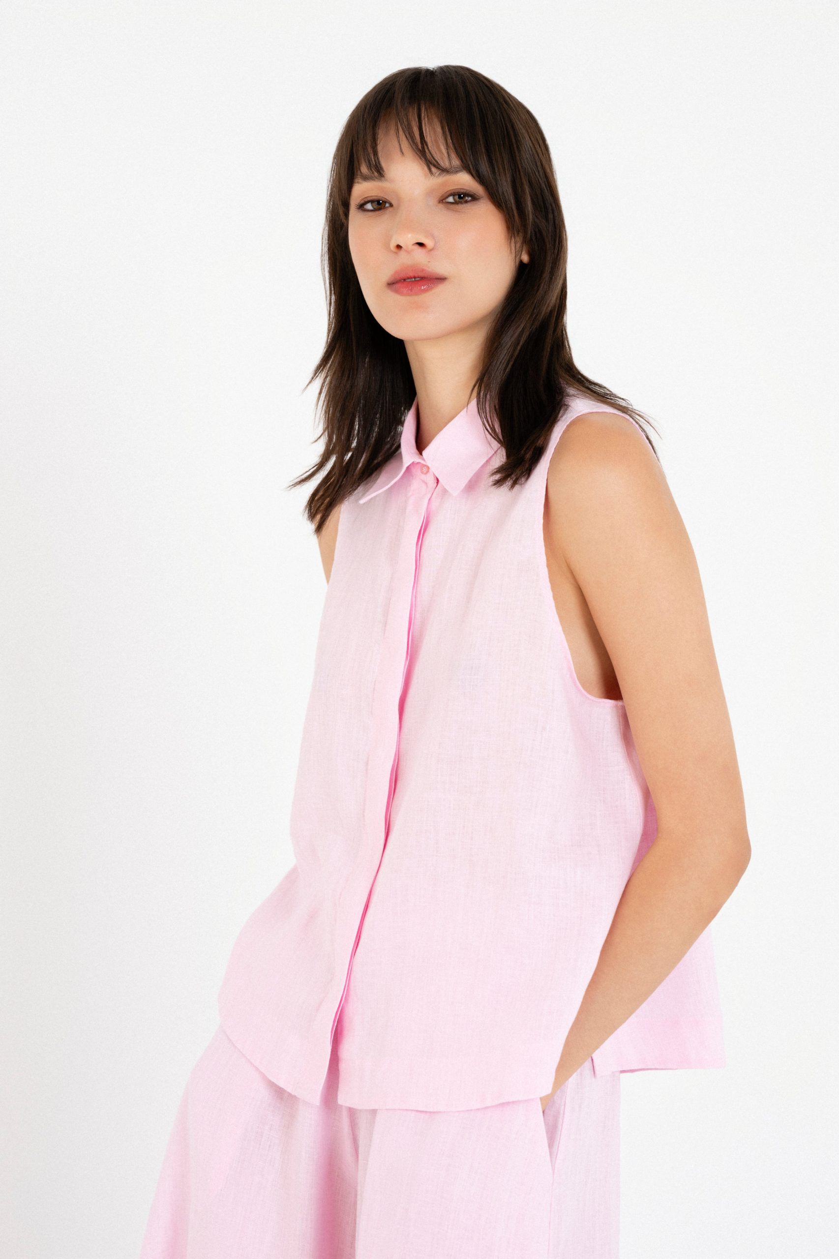 Λινό αμάνικο πουκάμισο με κλασικό γιακά. Διαθέτει άνετη εφαρμογή και κρυφά κουμπιά για το κλείσιμο.