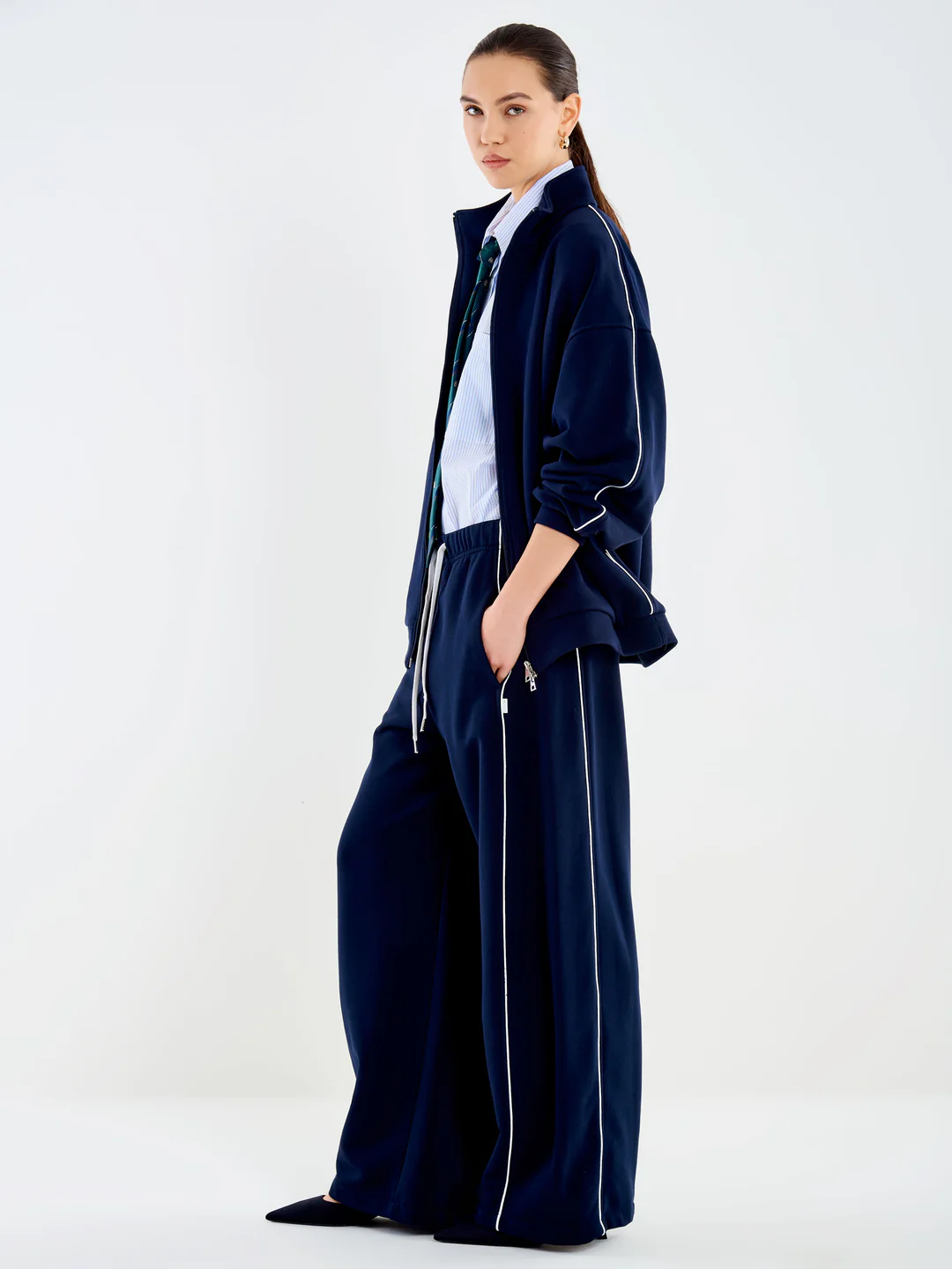 Παντελόνι palazzo με φαρδιά γραμμή και ριγέ σε αντίθεση. Διαθέτει κορδόνι περίσφιξης και ελαστική ζώνη. Πλαϊνές τσέπες με σχισμές.
