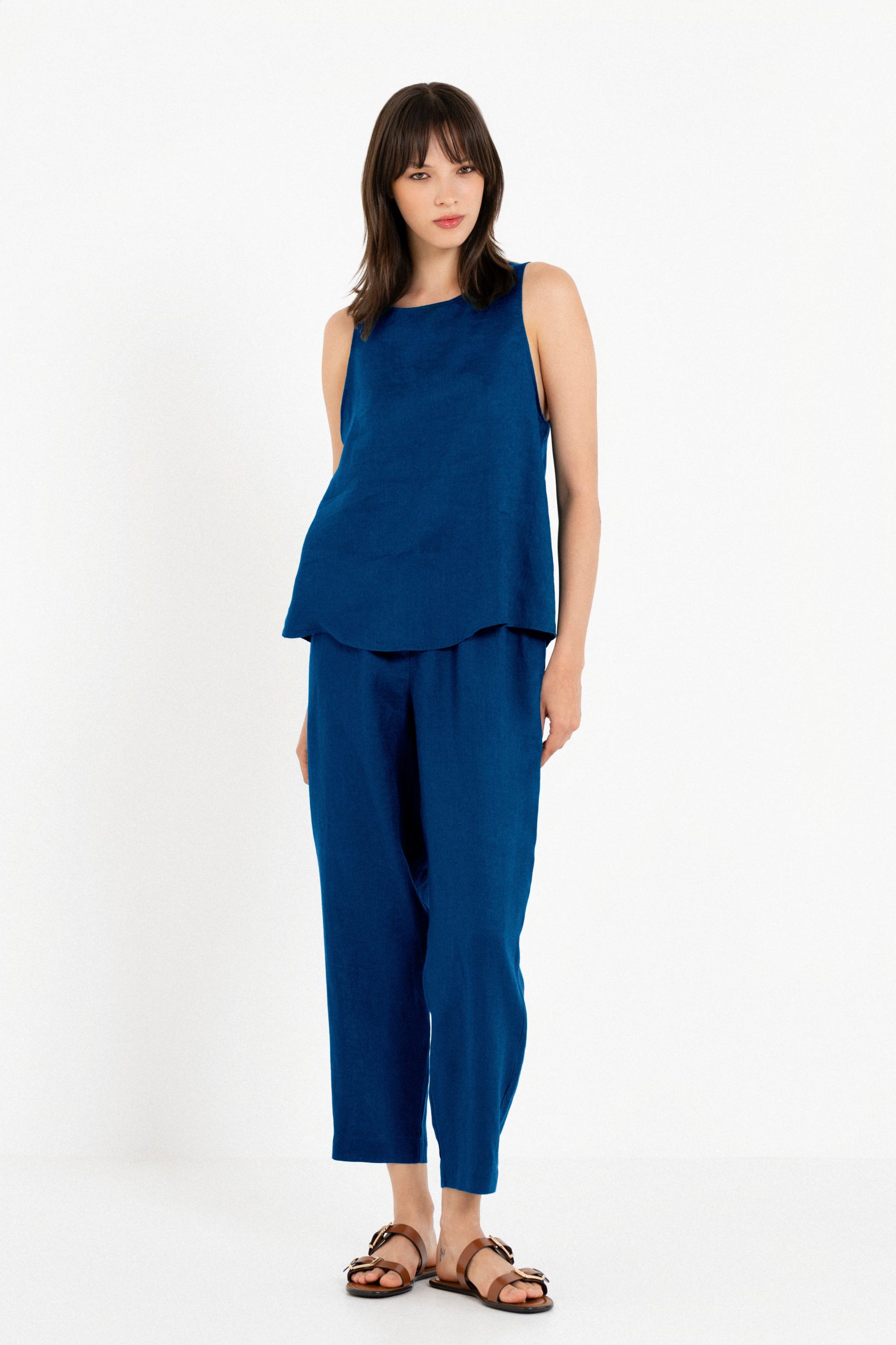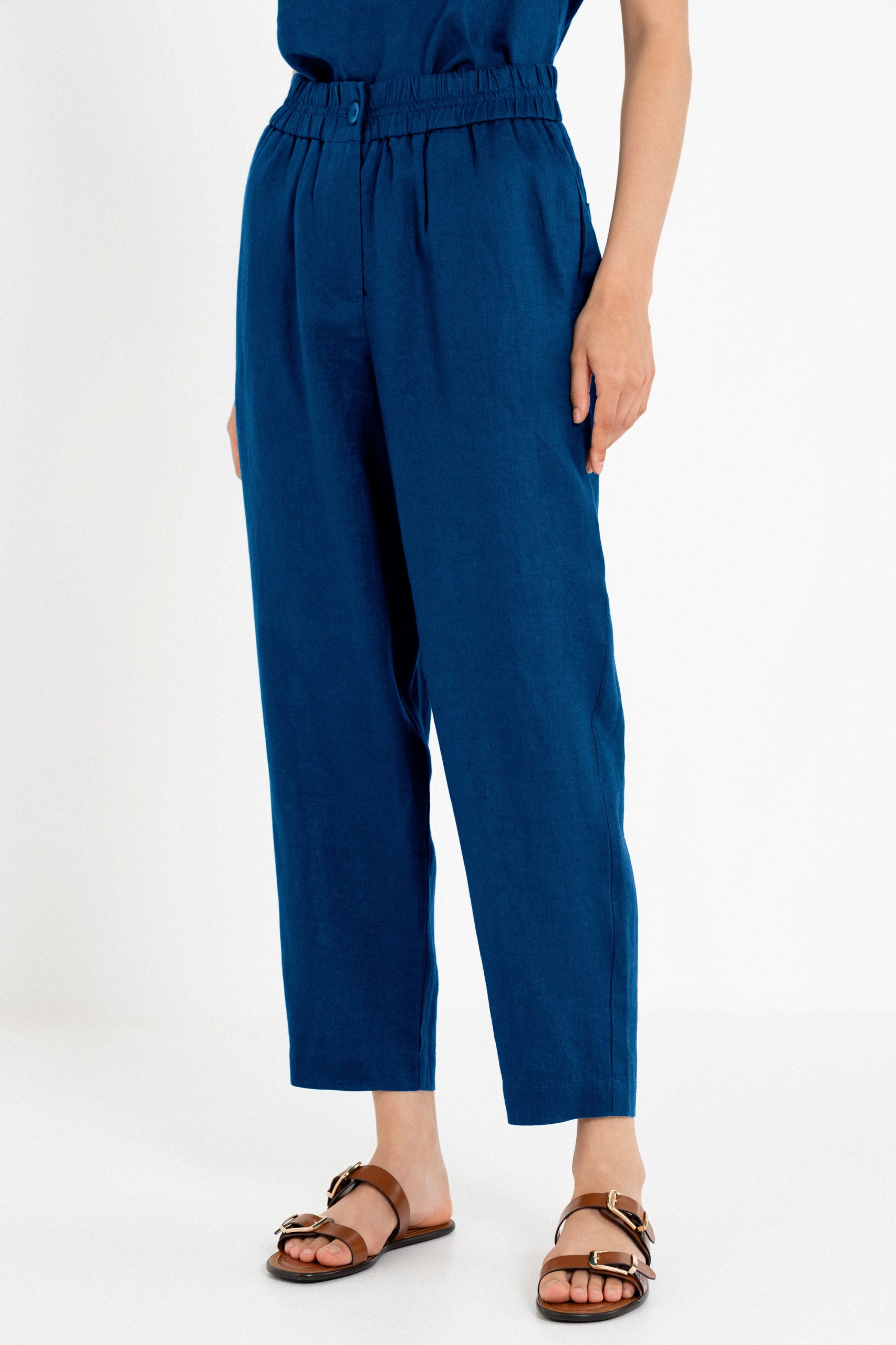 Παντελόνι σε ίσια, χαλαρή γραμμή που συνδυάζει άνεση και κομψότητα. Διαθέτει ελαστική μέση με διακριτικό κουμπί μπροστά και φερμουάρ για το κλείσιμο.