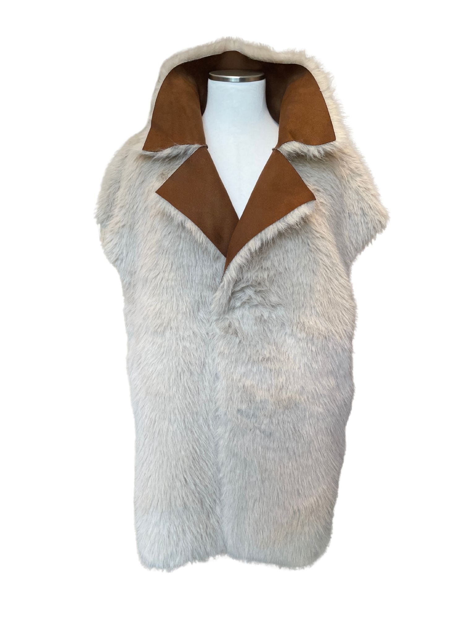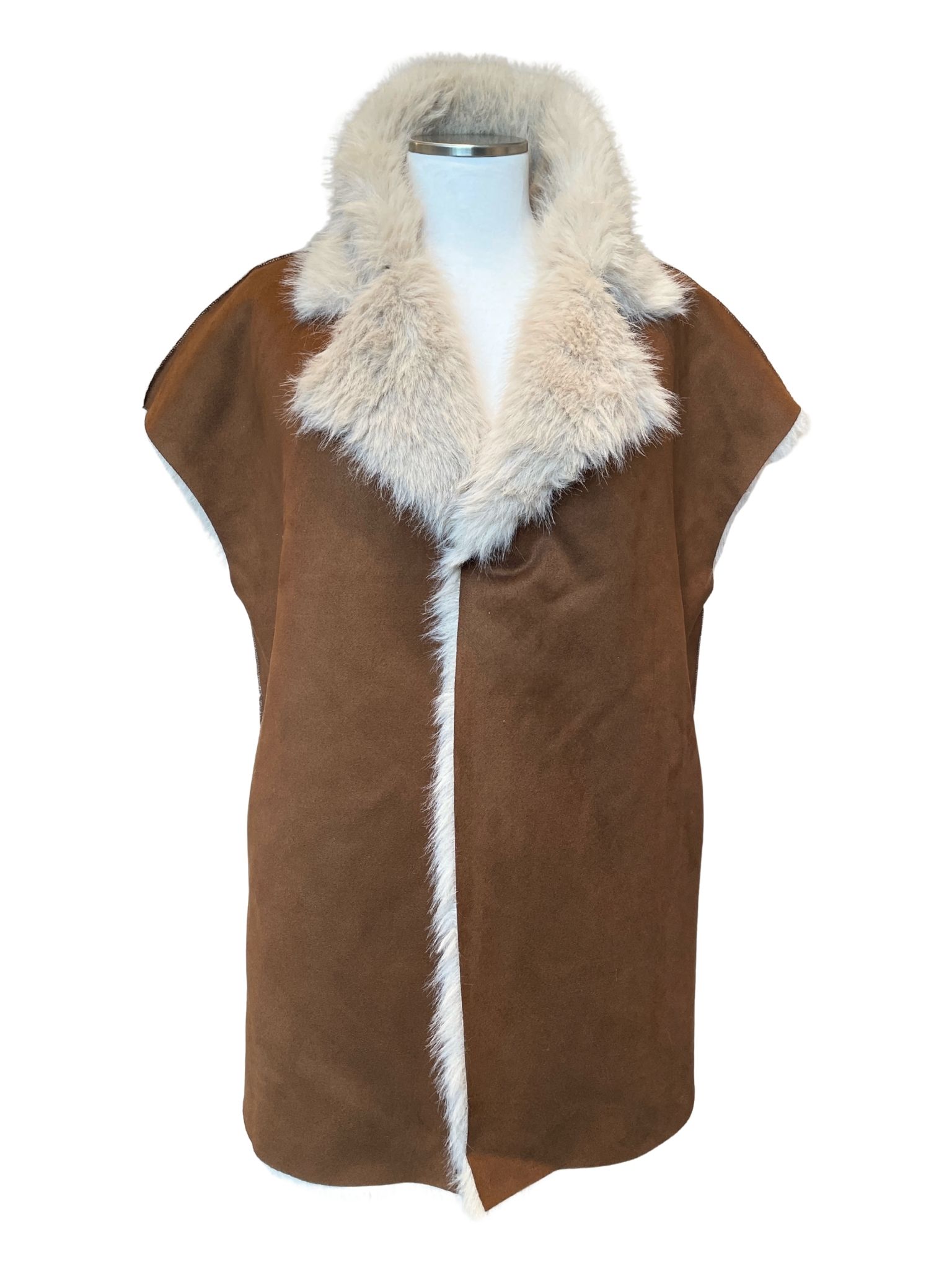 Αμάνικο double face γιλέκο χωρίς κουμπιά ή φερμουάρ με ψηλό γιακά και απαλή υφή. Είναι κατασκευασμένο από οικολογική γούνα εξαιρετικής ποιότητας. Από την άλλη η suede υφή σε καφέ απόχρωση χαρίζει πιο casual και minimal ύφος.