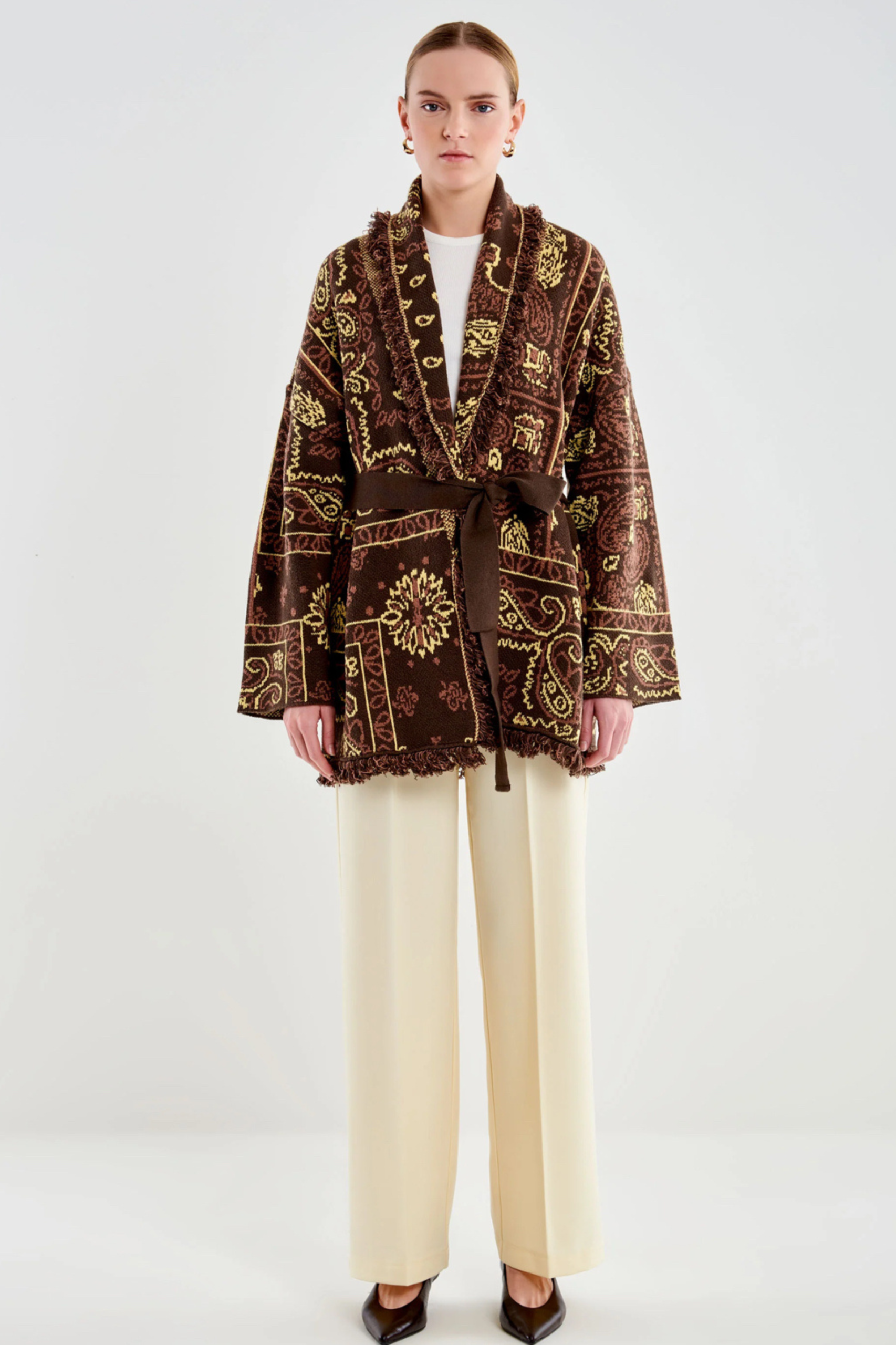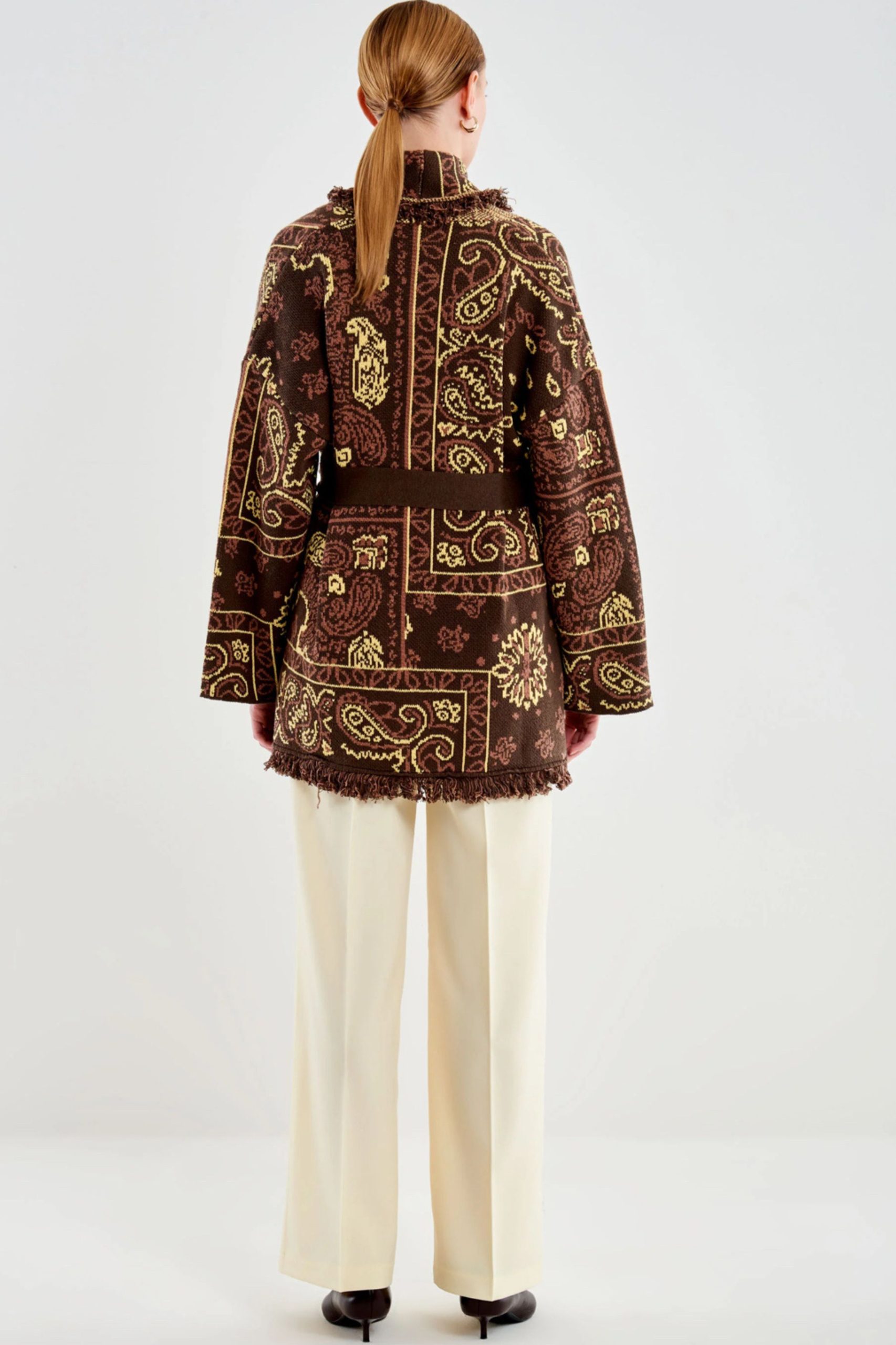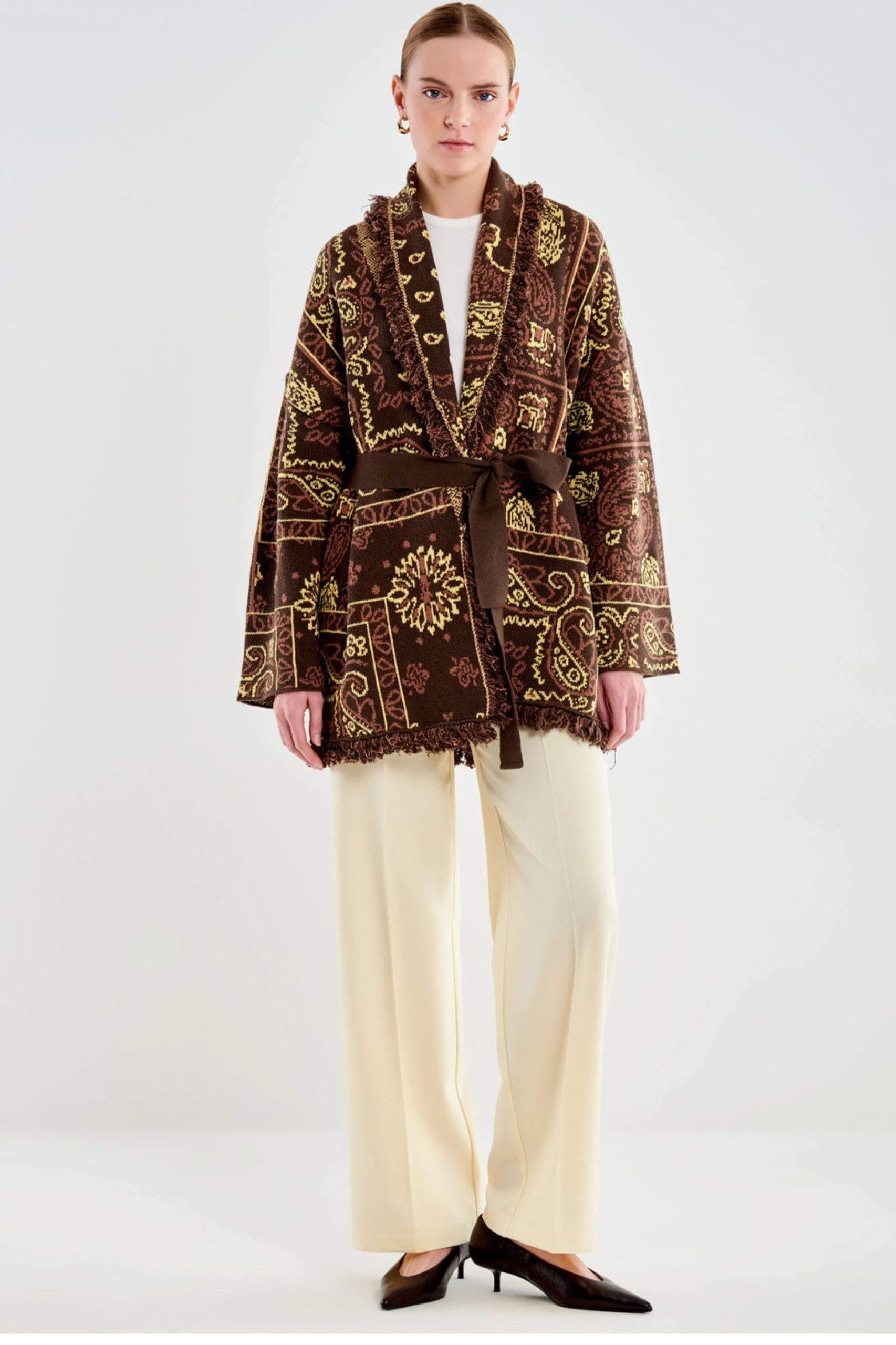 Maxi ζακέτα με σχέδιο ζακάρ μπαντάνα, μακριά μανίκια και γιακά με πέτο. Λεπτομέρεια με κρόσσια στο στρίφωμα και τον γιακά. Διαθέτει αποσπώμενη ζώνη.
