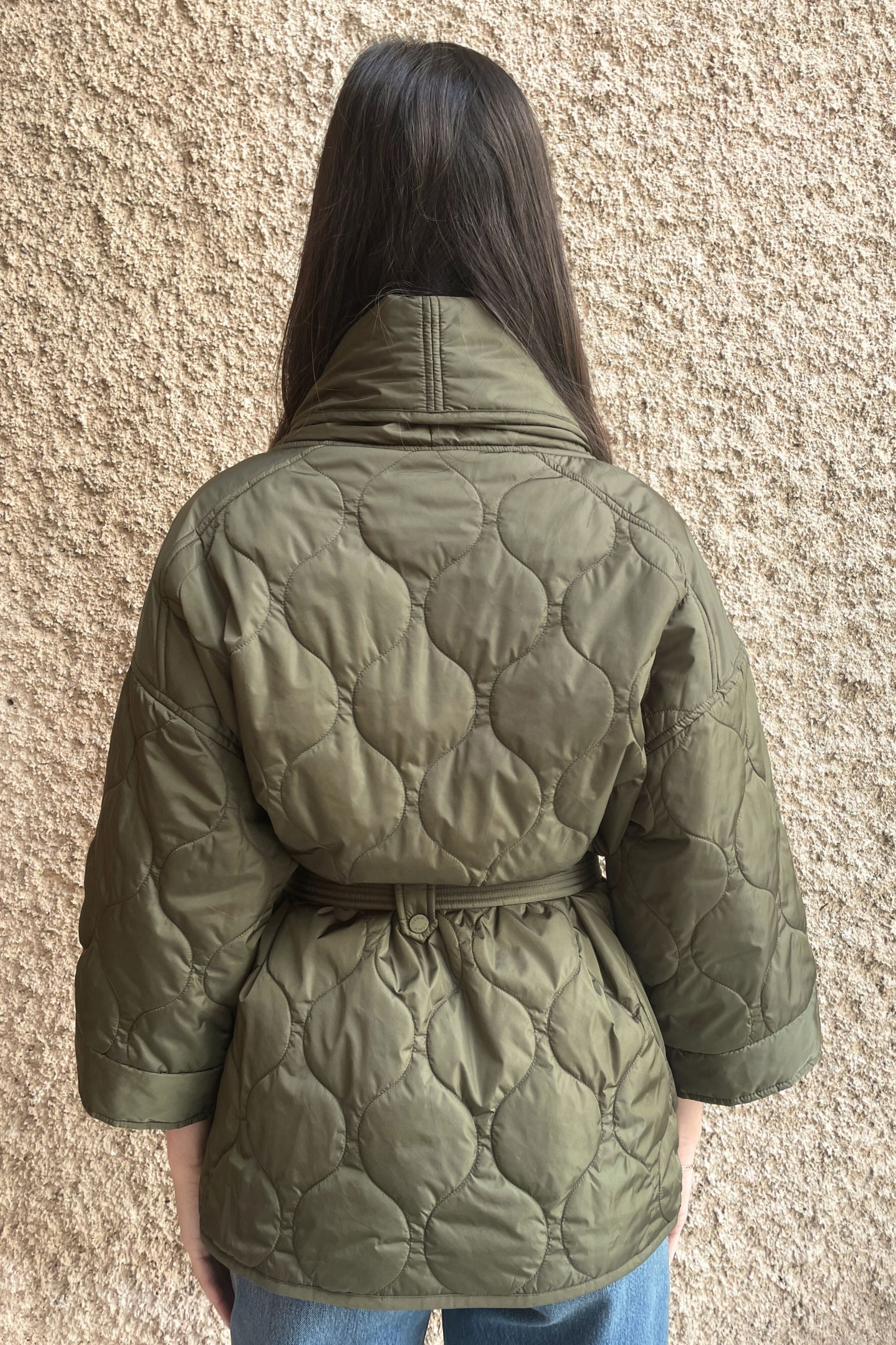 Καπιτονέ τζάκετ τύπου κιμονό. Διαθέτει φαρδιά μανίκια που ενισχύουν τη relaxed αισθητική του και ζώνη στη μέση για ρυθμιζόμενη εφαρμογή. Το καπιτονέ ύφασμα προσφέρει ελαφριά ζεστασιά χωρίς βάρος.