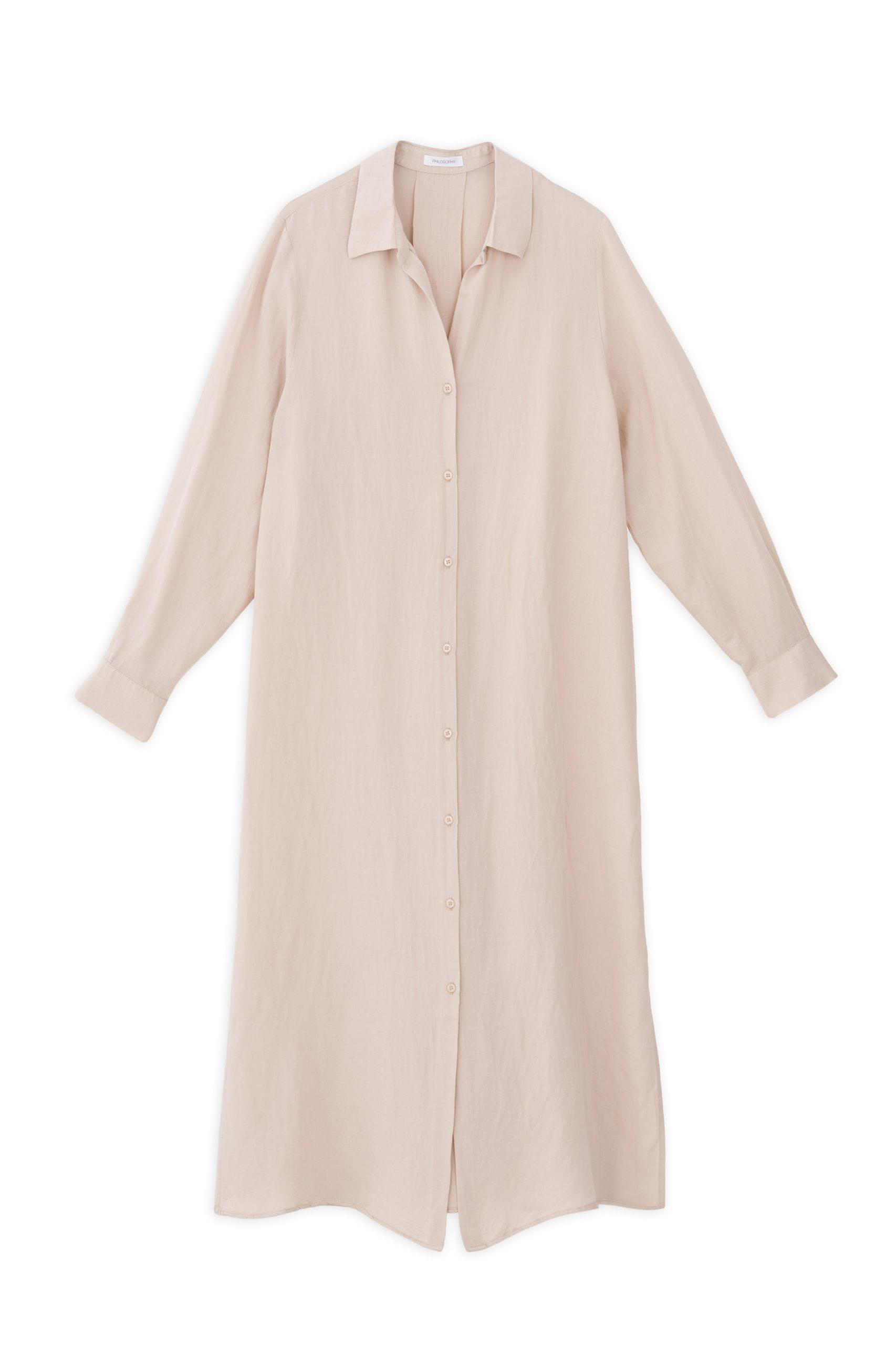 Μακρύ πουκάμισο λινό σε χαλαρή γραμμή με διακριτικό γιακά και minimal κλείσιμο.