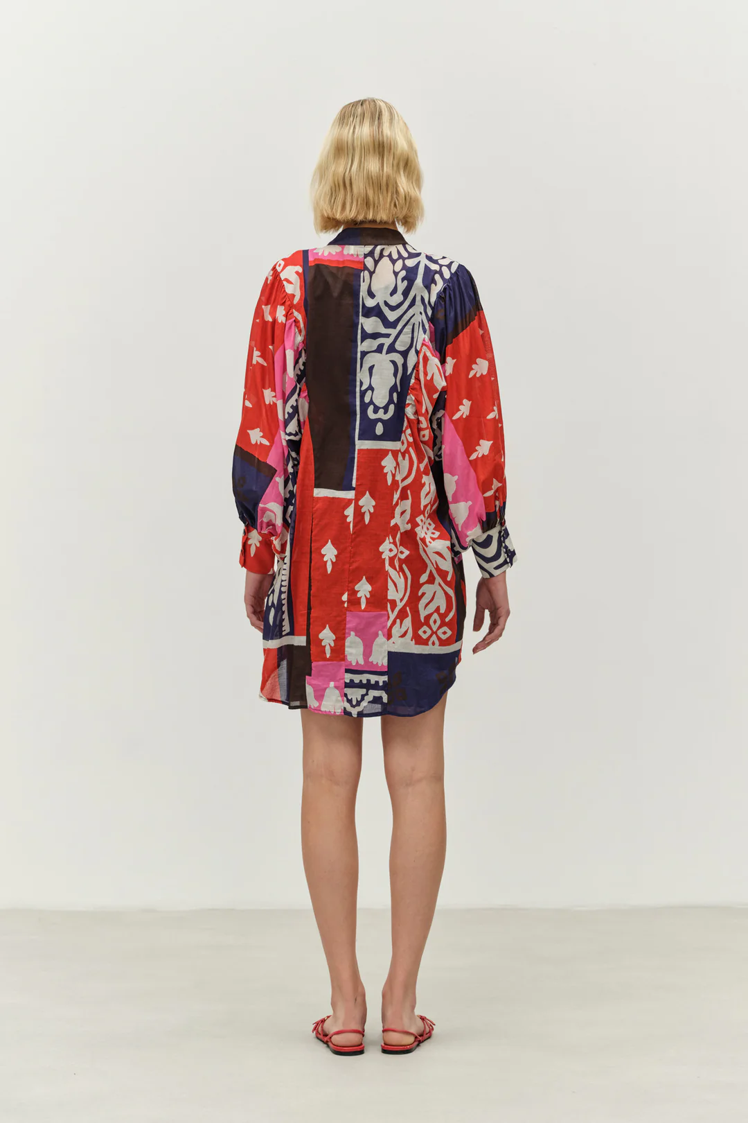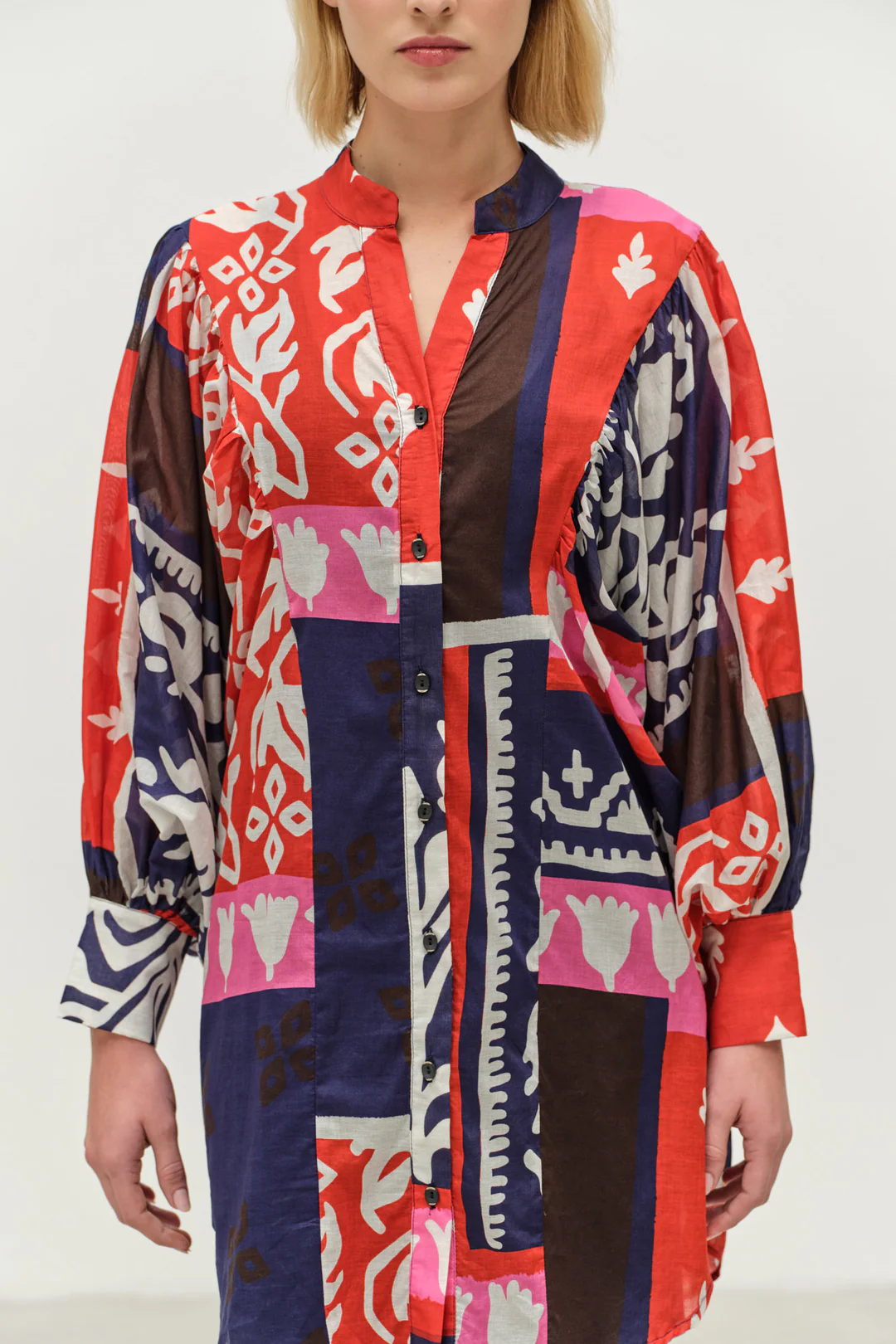 Κοντό βαμβακερό φόρεμα με μακριά χέρια, V-λαιμόκοψη και mao γιακά.