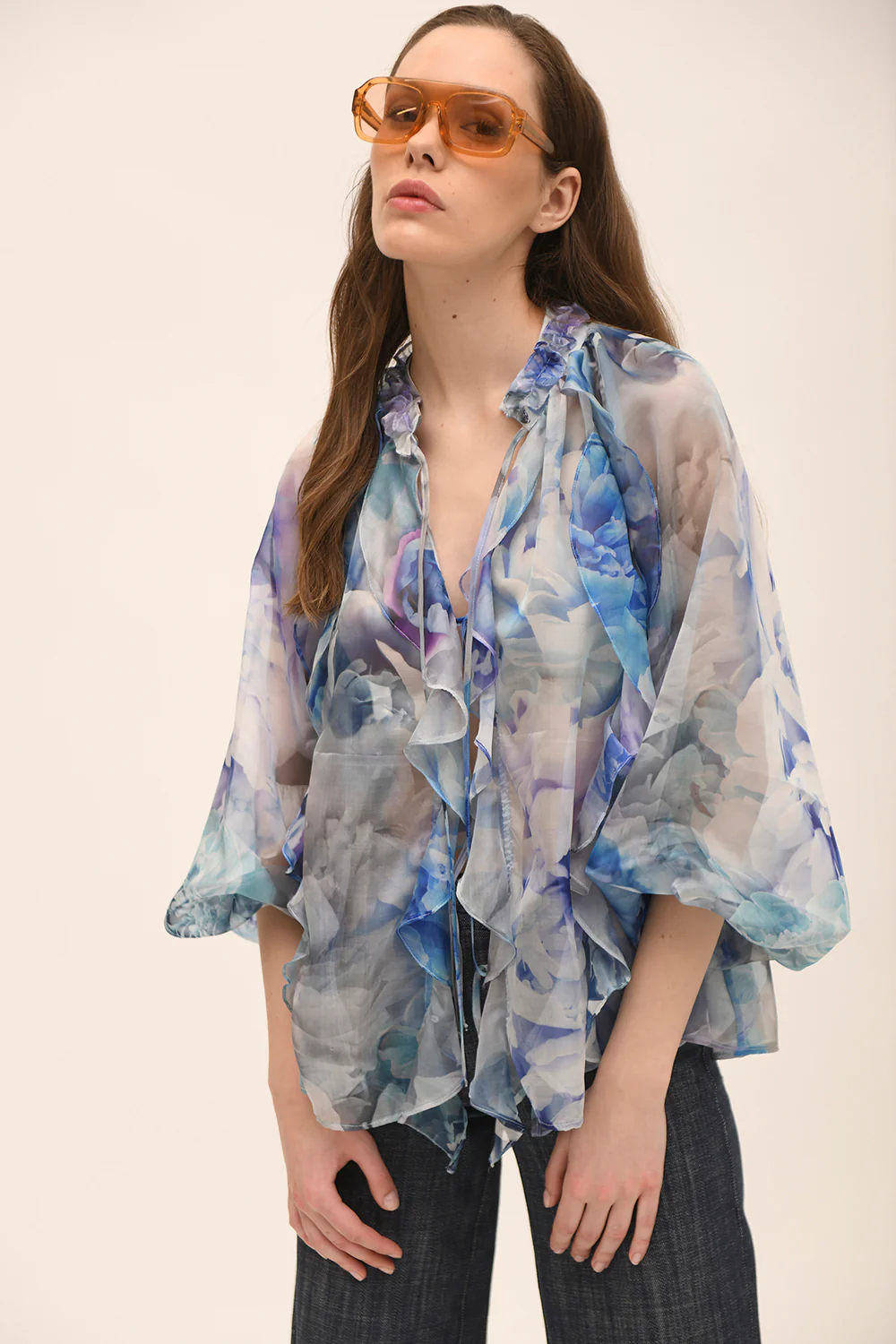 Statement μπλούζα print! Κατασκευασμένη από ανάλαφρο, διαφανές ύφασμα που χαρίζει αέρινη αίσθηση και άψογη εφαρμογή. Οι ρομαντικές λεπτομέρειες με βολάν στο ντεκολτέ και τα μανίκια προσθέτουν θηλυκότητα και κίνηση, ενώ το διαχρονικό print την καθιστά ιδανική για day-to-night εμφανίσεις.