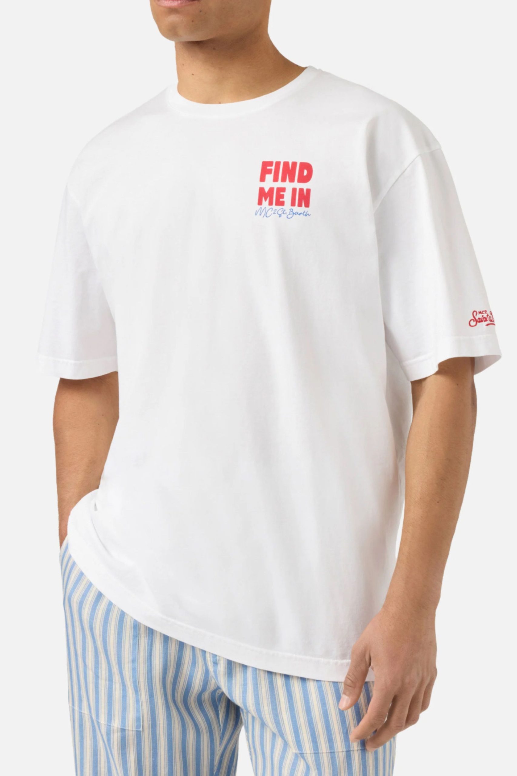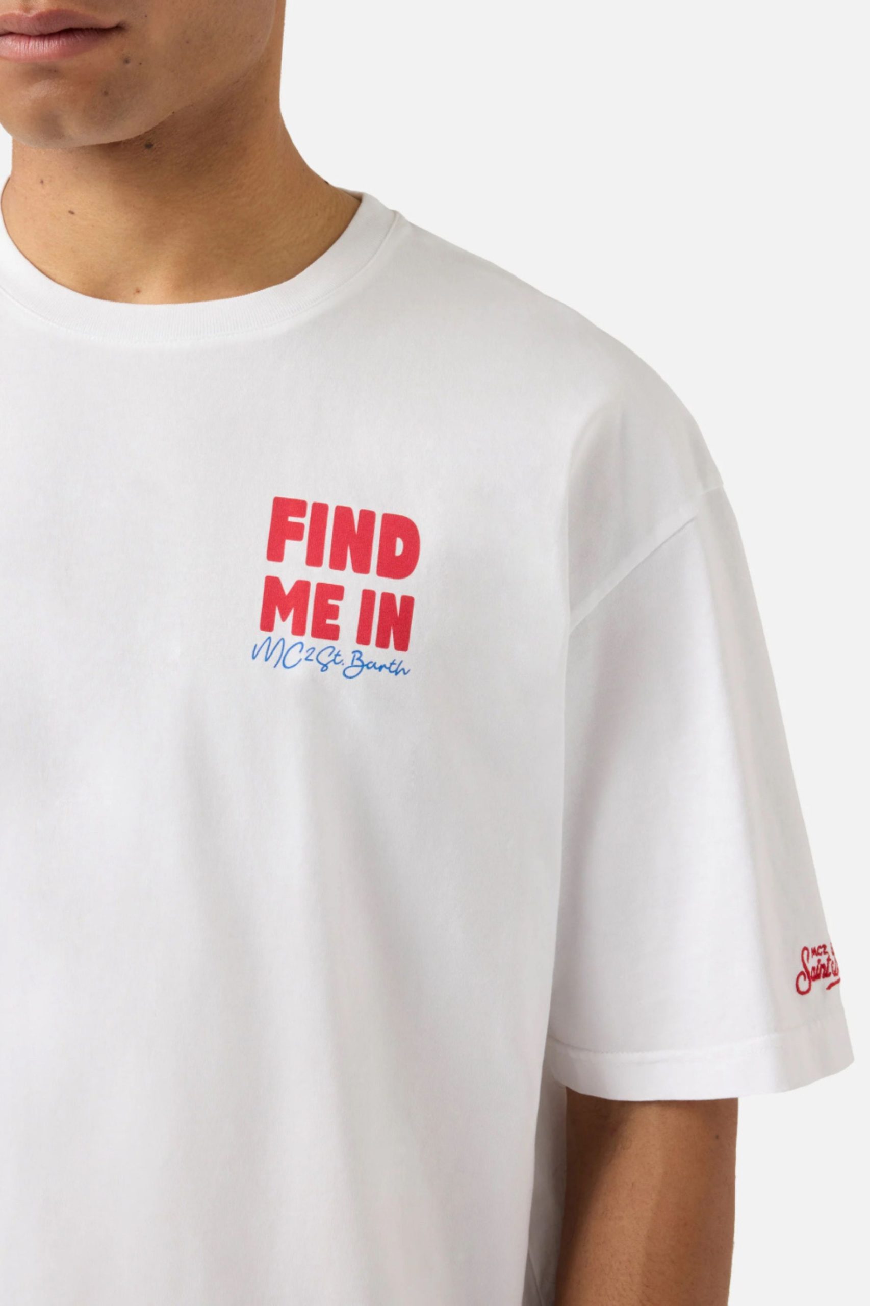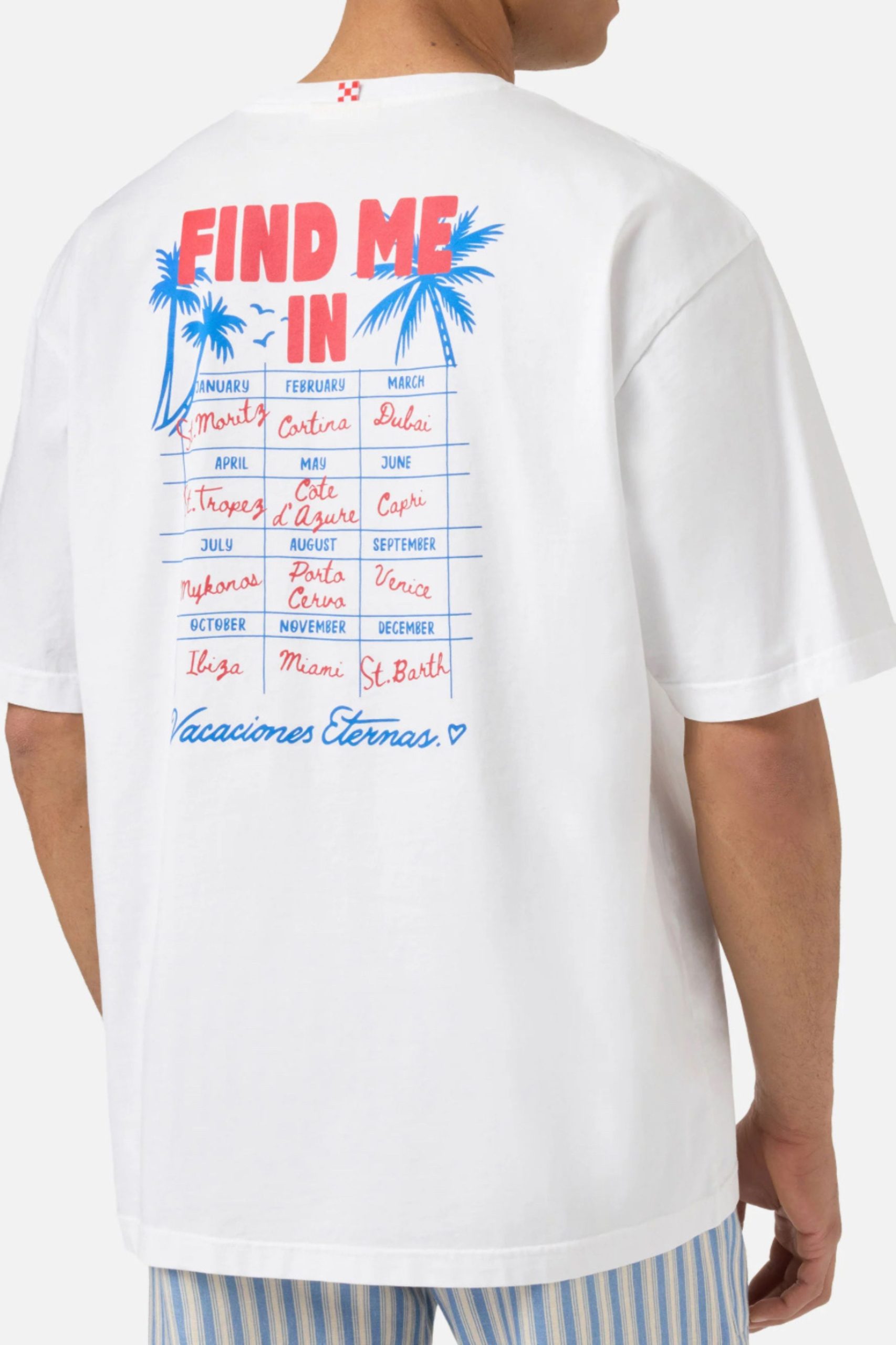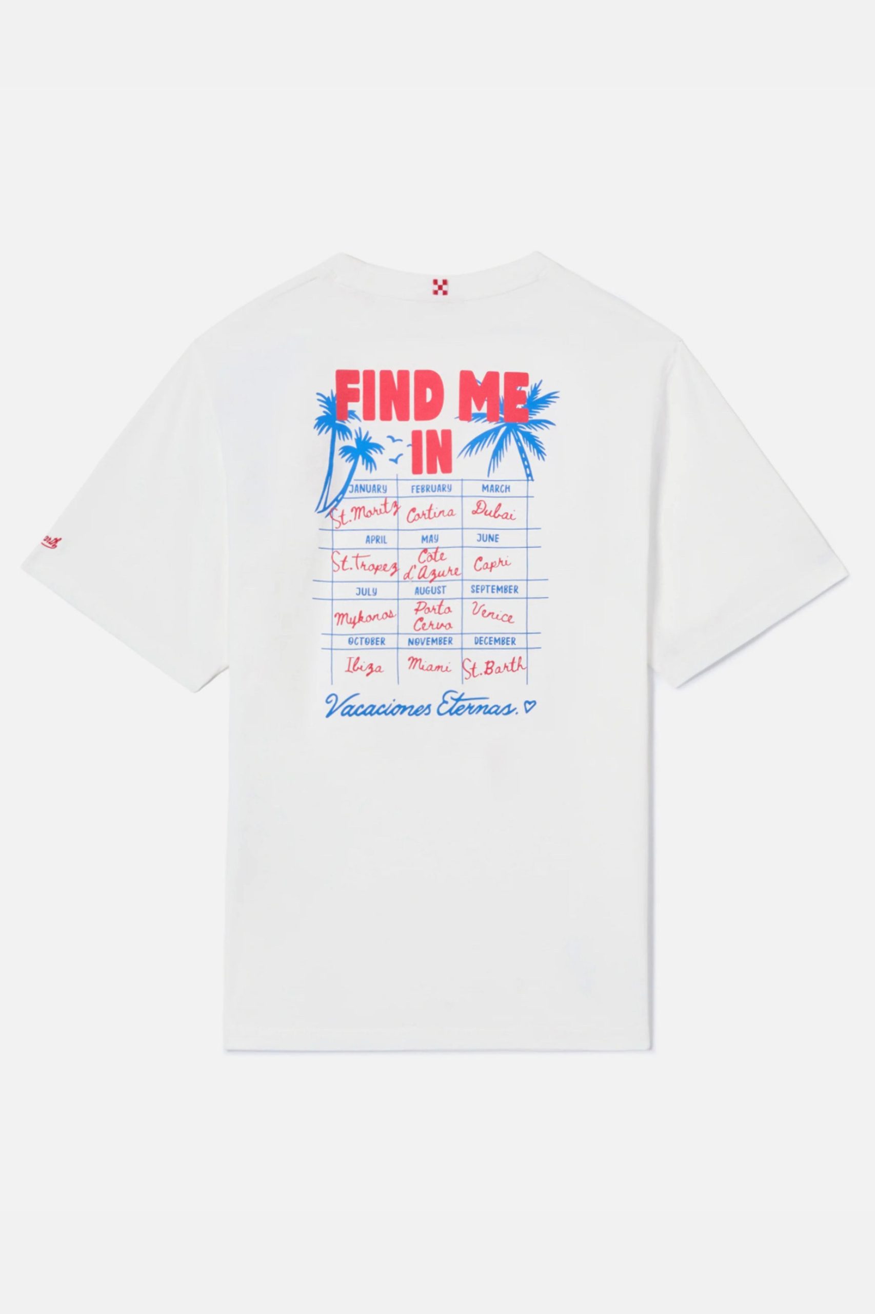 Το μπλουζάκι Delmar είναι κατασκευασμένο από καθαρό βαμβάκι, σχεδιασμένο για να προσφέρει άνεση και φυσική αίσθηση στο δέρμα. Το λευκό μονόχρωμο σχέδιο αναδεικνύει την απαραίτητη κατασκευή του ενδύματος. Το στυλ διαθέτει στάμπα Find Me In MC2 St. Barth στο στήθος, ενώ η πλάτη είναι εμπλουτισμένη με μια μεγάλη γραφική εκτύπωση Find Me In με εικονογράφηση ημερολογίου προορισμού, που ολοκληρώνεται με την επιγραφή Vacaciones Eternas. Το ένδυμα έχει στρογγυλή λαιμόκοψη, κοντά μανίκια και ίσια σιλουέτα με χαλαρή εφαρμογή.