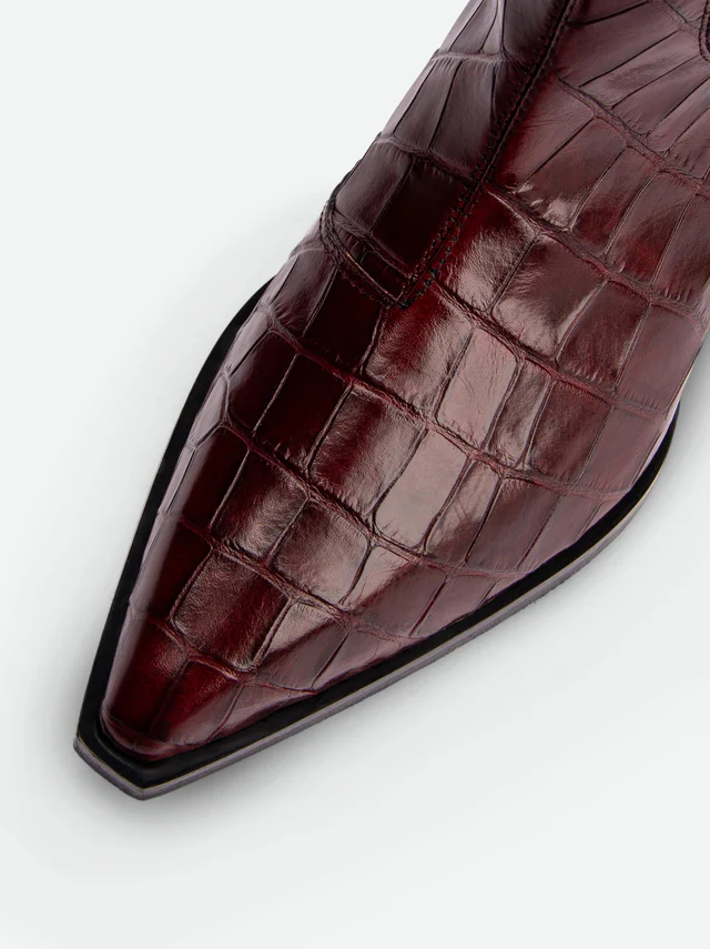 Ψηλή μπότα σε μια κομψή και άνετη γραμμή. Κατασκευασμένη από γυαλιστερό δέρμα με ανάγλυφο κροκό σε μπορντώ χρώμα. Η επιμήκης λαβή και η μυτερή μύτη δημιουργούν μια κομψή σιλουέτα. Τα λάστιχα και το φαρδύ τακούνι προσθέτουν άνεση και σταθερότητα, ενώ η δερμάτινη επένδυση και η λαστιχένια σόλα εξασφαλίζουν άνεση όλη μέρα.