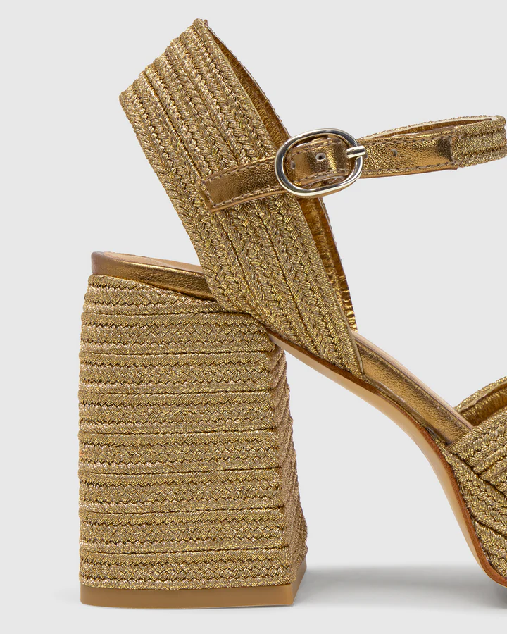 Ψηλοτάκουνα πέδιλα με χοντρό τακούνι 10 cm σε σχήμα V. Κλείνει με μπαρέτα στο ύψος του αστραγάλου.