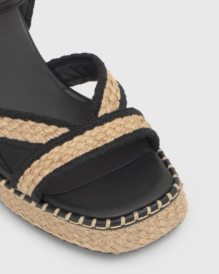 Σανδάλι Vanish από πλεγμένη γιούτα με κλείσιμο με αγκράφα, φάσα σε σχήμα V, μαλακή εσωτερική σόλα και τακούνι 10 εκατοστών επενδυμένο με ασορτί ύφασμα.