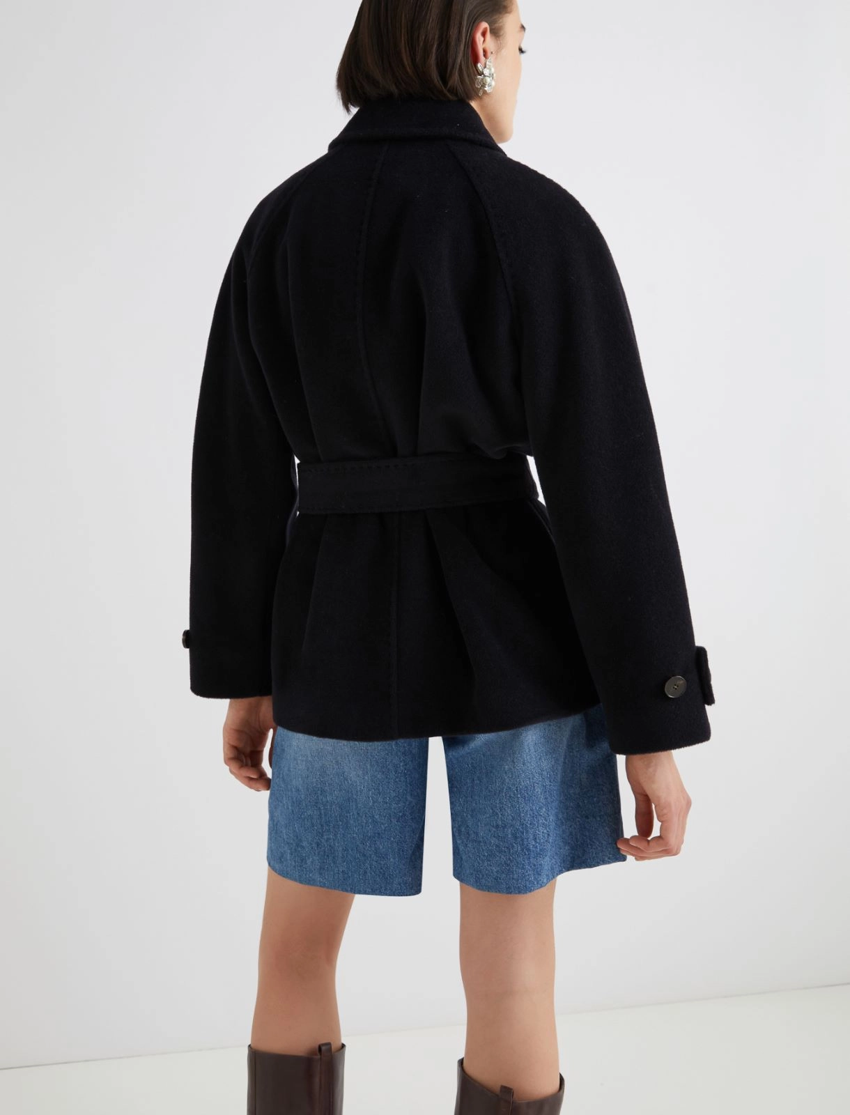 Kιμονό τζάκετ με ζώνη στη μέση. Φοδραρισμένο βαρύ μπουφάν από καθαρό μαλλί. Ίσια εφαρμογή με γιακά πουκαμίσου και διπλό κούμπωμα. Διαθέτει πλαϊνές τσέπες με ρέλι.