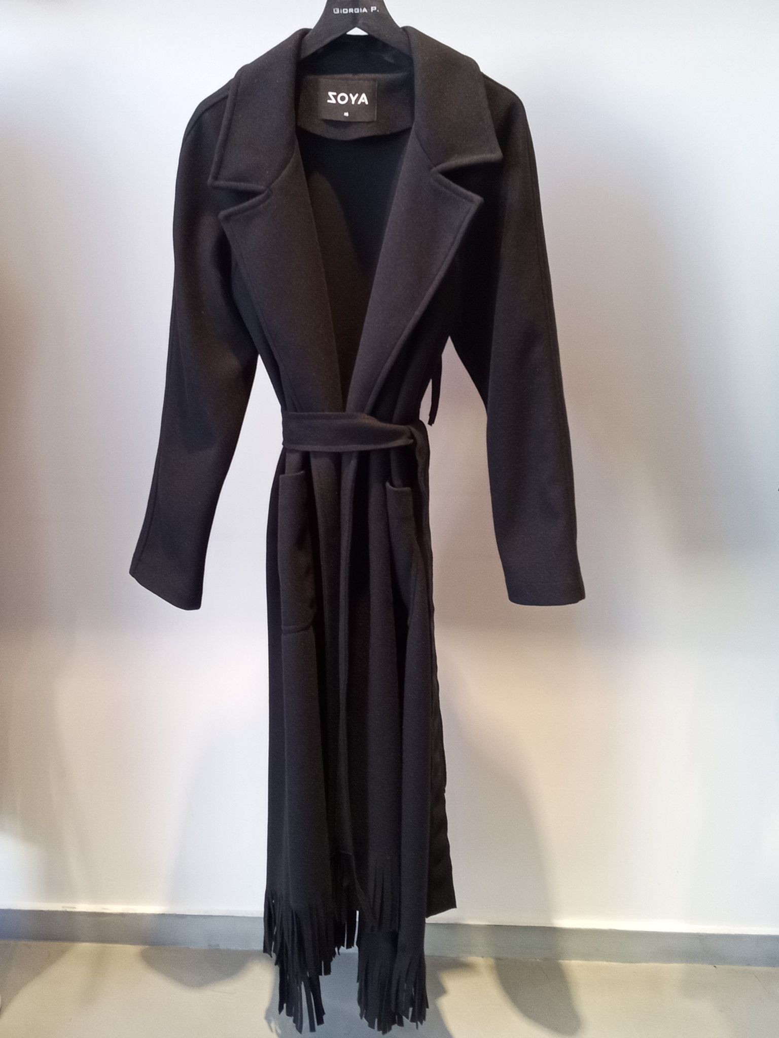 Μάξι παλτό σε μαύρη απόχρωση που συνδυάζει διαχρονική κομψότητα με μοντέρνες λεπτομέρειες. Διαθέτει ζώνη στη μέση για εφαρμογή που κολακεύει και κρόσσια στο τελείωμα και την πλάτη που προσθέτουν κίνηση και χαρακτήρα.