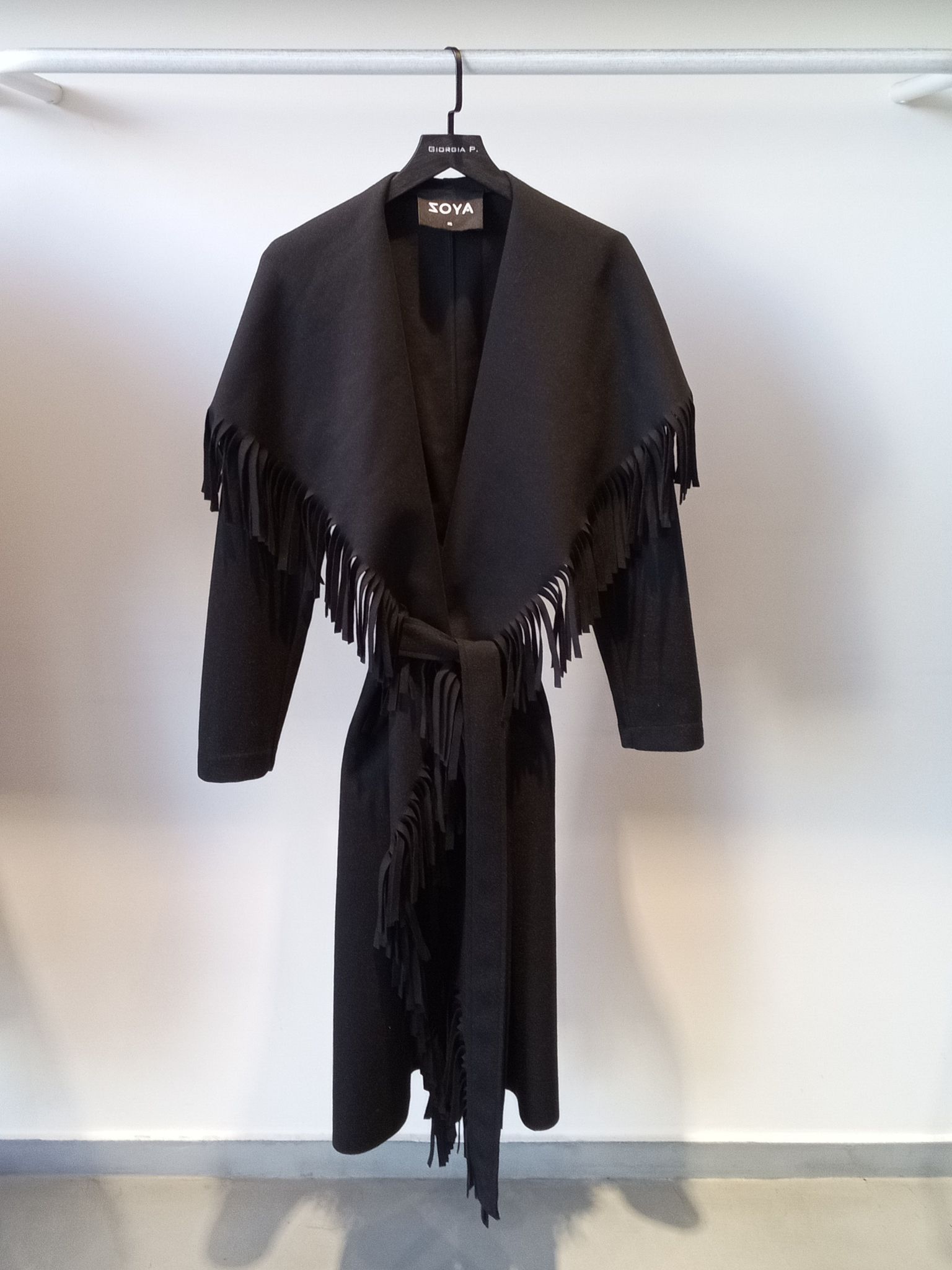 Μακρύ παλτό με εντυπωσιακό γιακά από κρόσσια. Διαθέτει ζώνη για να κλείνει που αναδεικνύει τη σιλουέτα. Η υφή του είναι ζεστή και απαλή.