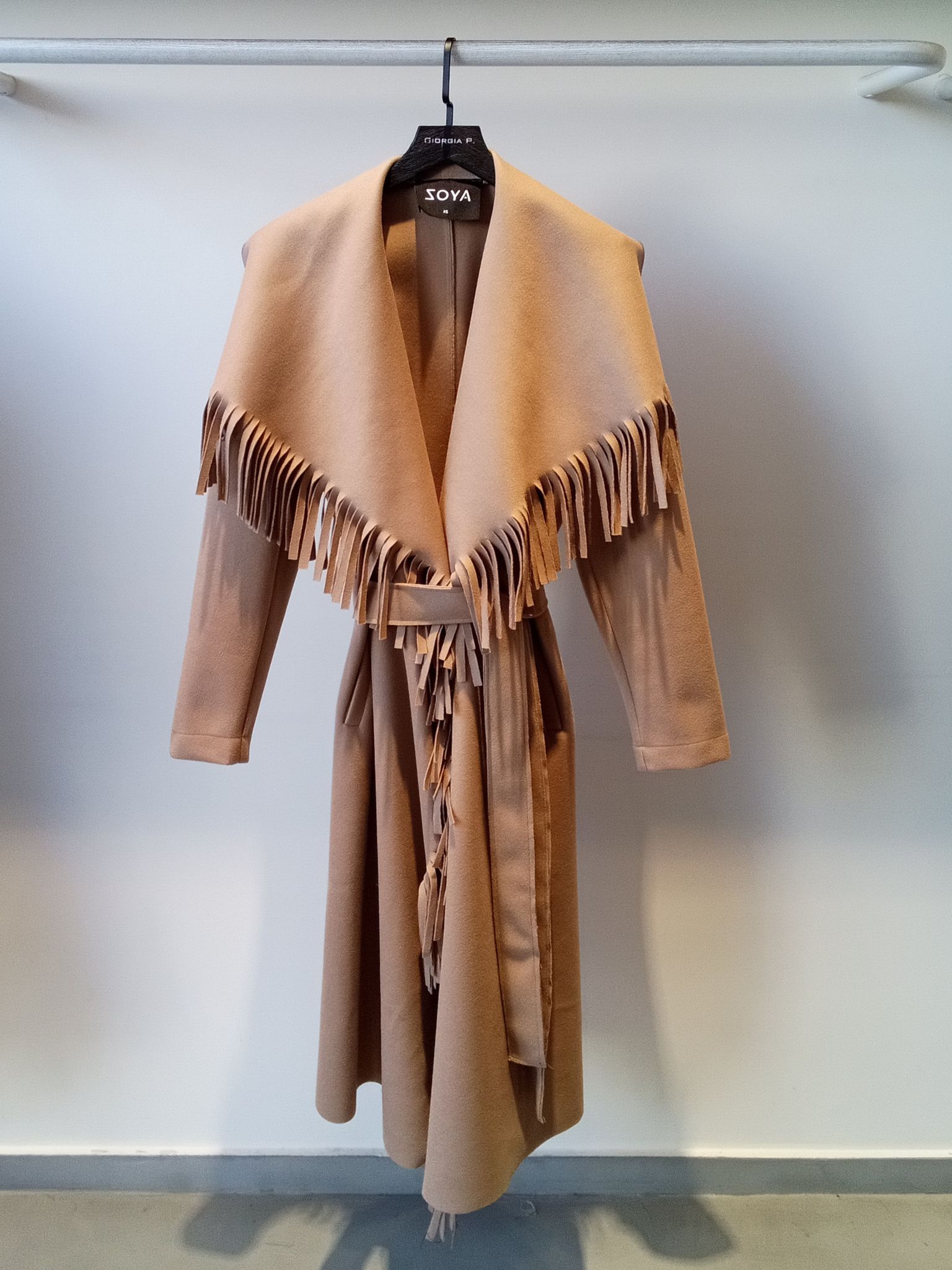 Μακρύ παλτό με εντυπωσιακό γιακά από κρόσσια. Διαθέτει ζώνη για να κλείνει που αναδεικνύει τη σιλουέτα. Η υφή του είναι ζεστή και απαλή.