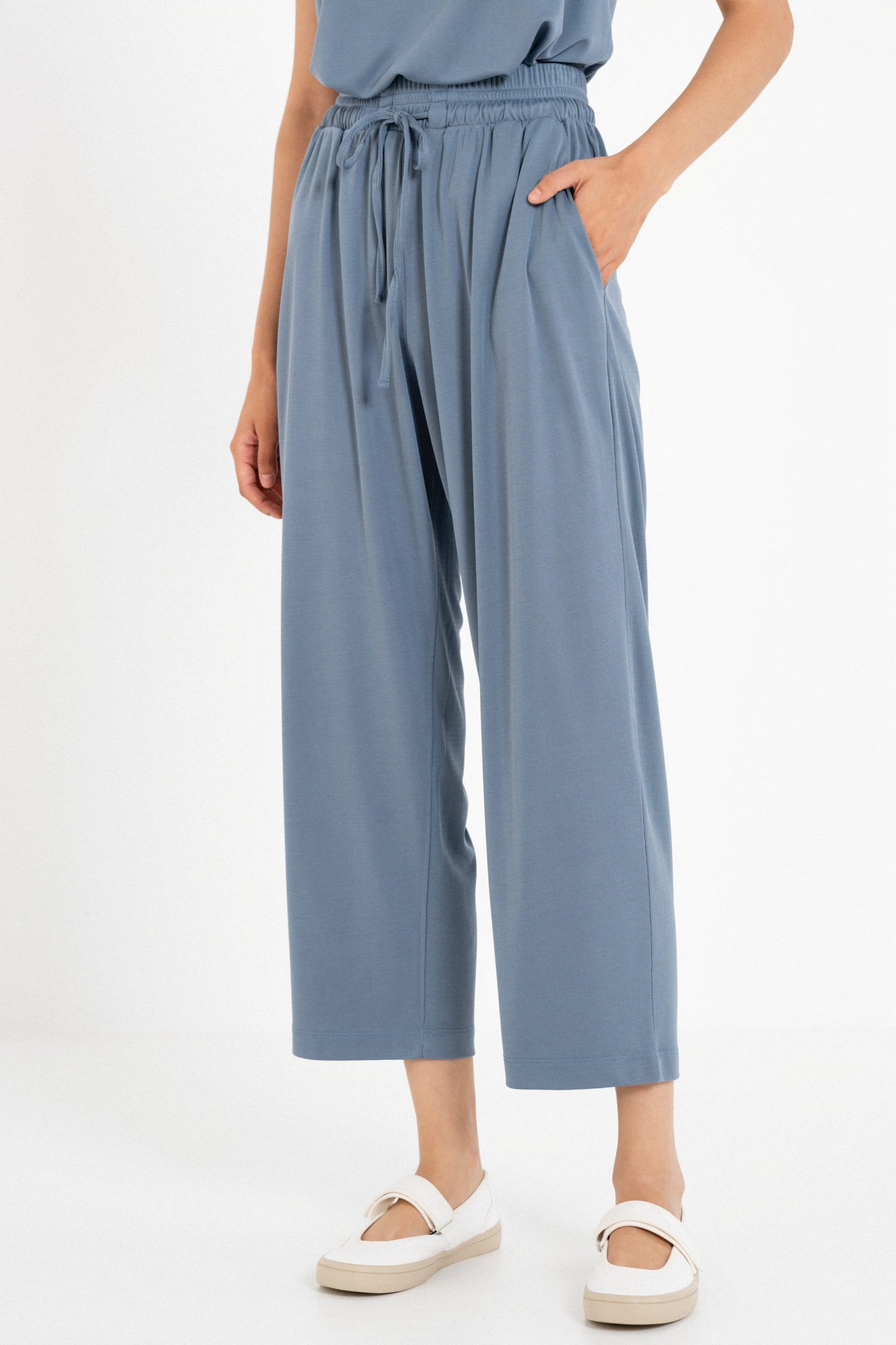 Ριπ παντελόνι ως τον αστράγαλο με λάστιχο στη μέση και πλαϊνές τσέπες.
