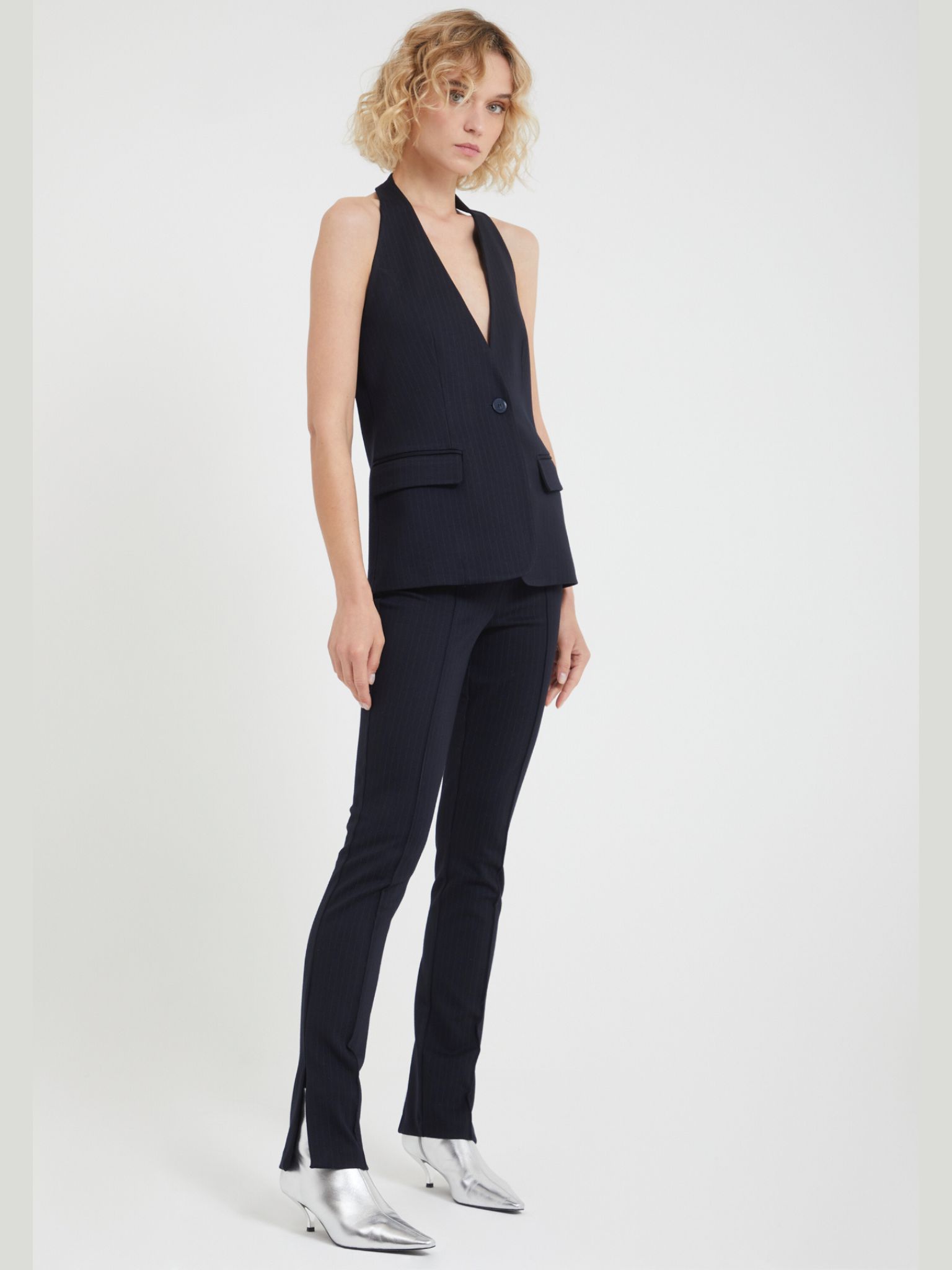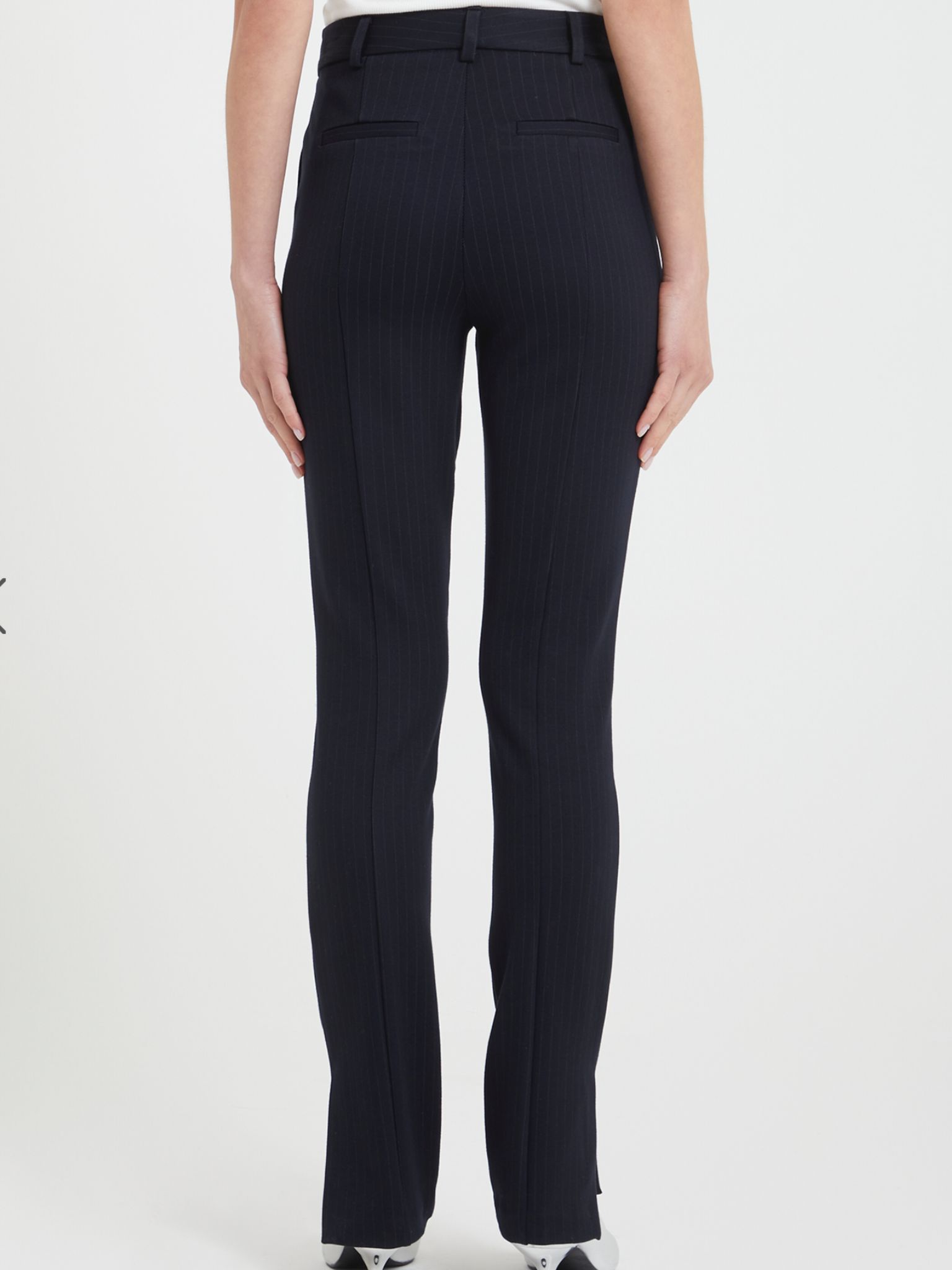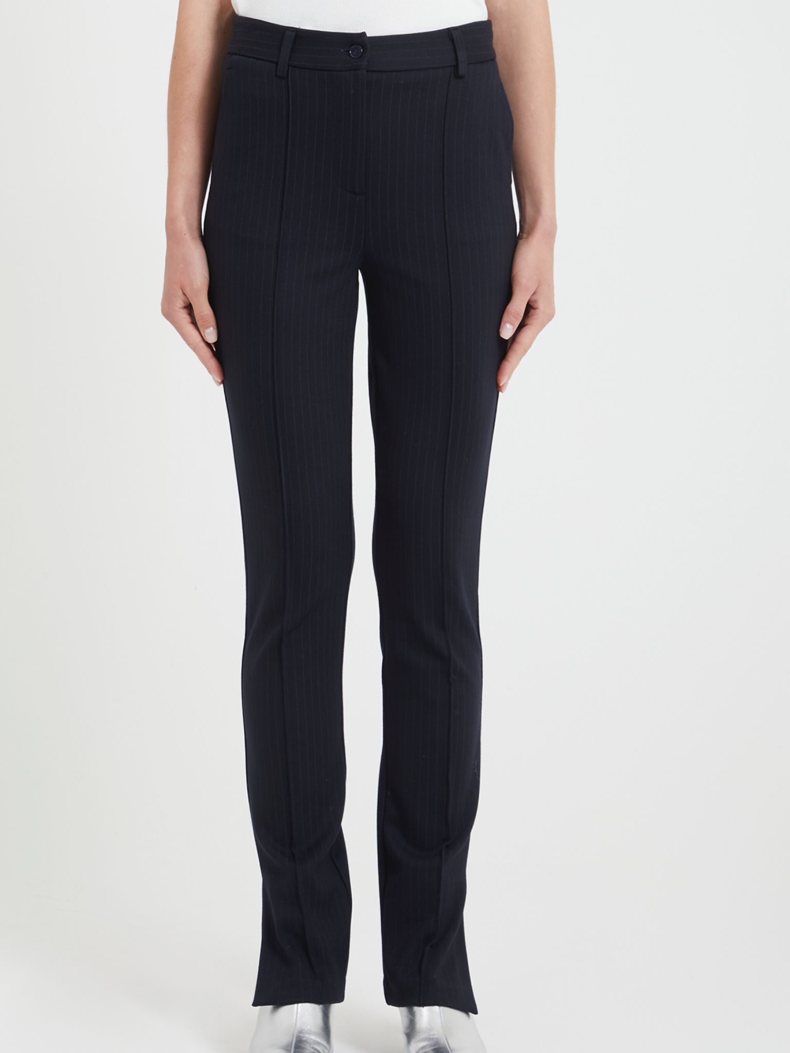 Εφαρμοστό και κομψό παντελόνι με ελαστικότητα σε σκούρο μπλε χρώμα και διακριτική ρίγα. Διαθέτει κλασική μέση, θηλάκια για ζώνη και ίσια γραμμή που αγκαλιάζει το σώμα.