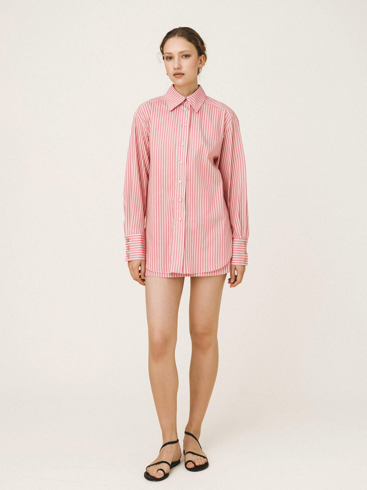 Υπερμεγέθη χαλαρή εφαρμογή με μανσέτες και κουμπιά. Κλασικός γιακάς, με χάντρες κατά μήκος των μανικιών.