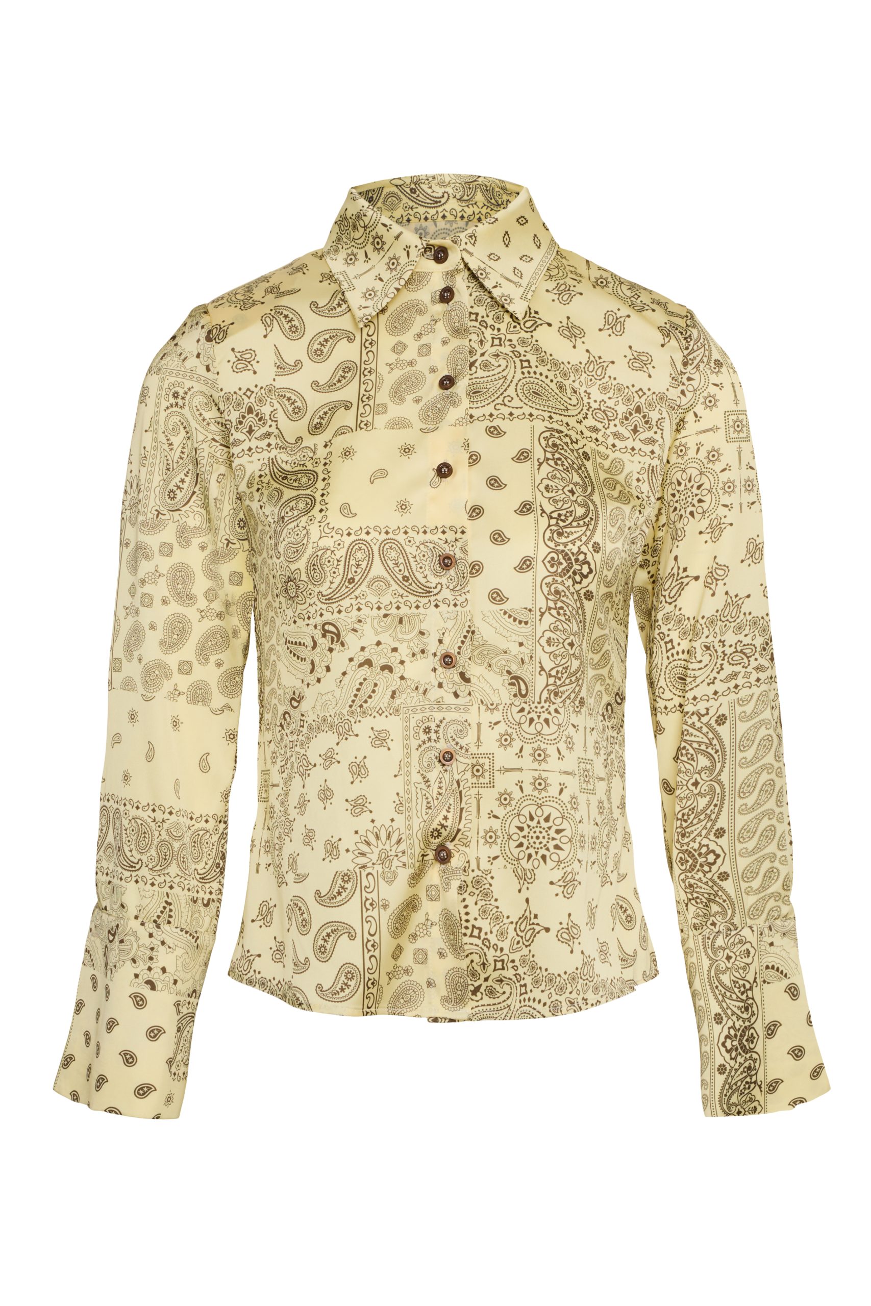 Ένα κίτρινο εφαρμοστό πουκάμισο με στάμπα μπαντάνα, που προσφέρει κομψή σιλουέτα και έντονο, κομψό μοτίβο για μια ξεχωριστή εμφάνιση. Διαθέτει κλασικό γιακά