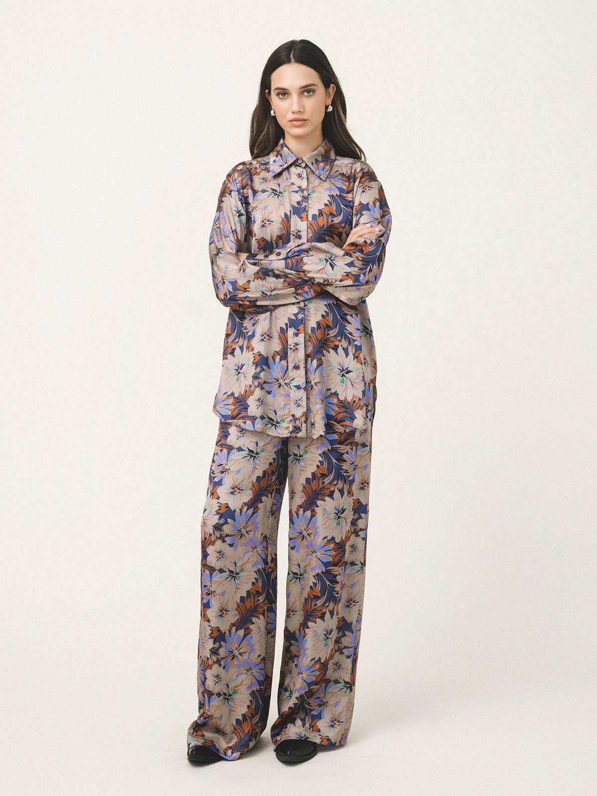 Πουκάμισο oversized με έντονο χαρακτήρα και καλλιτεχνική αισθητική. Κατασκευασμένο από σατινέ υφή, προσφέρει κίνηση και διακριτική λάμψη. Το εντυπωσιακό του μοτίβο σε αποχρώσεις του μπλε, του μωβ και του χαλκού δημιουργεί έναν δυναμικό συνδυασμό