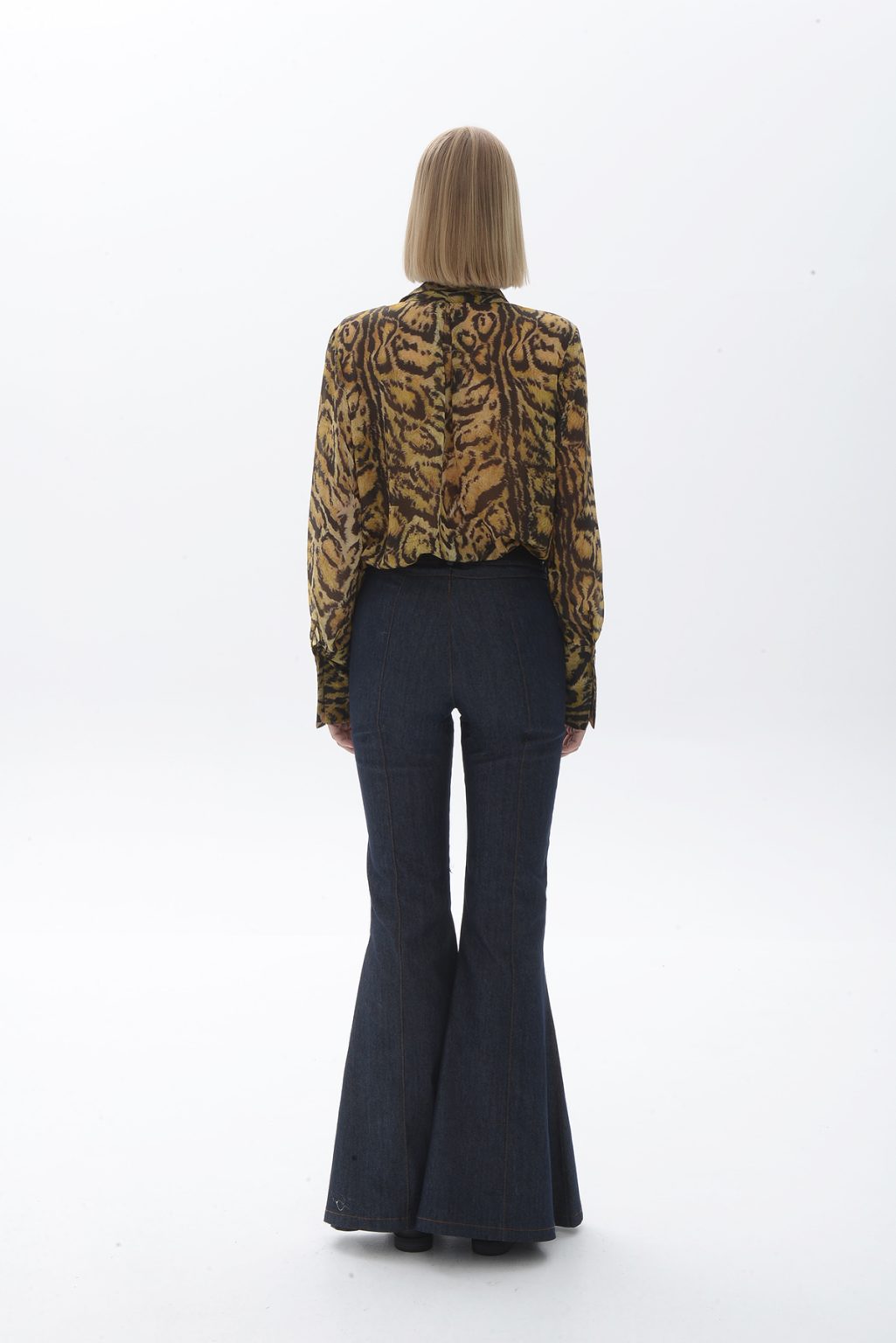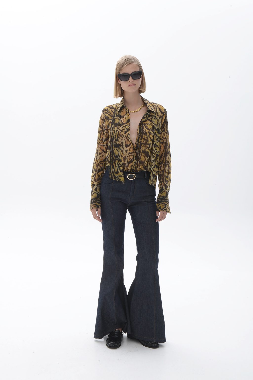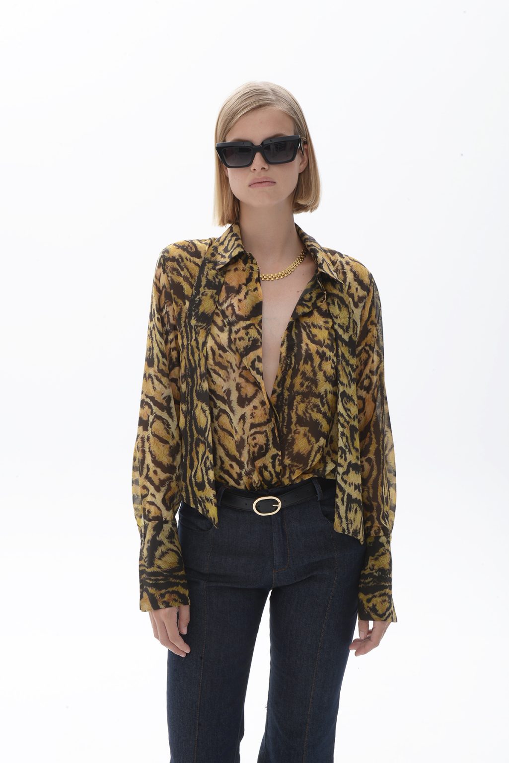 Το πουκάμισο Serena είναι ένα τολμηρό αλλά και ευέλικτο κομμάτι, σχεδιασμένο με εντυπωσιακό τύπωμα σε χρυσαφί καφέ και μαύρο χρώμα. Η χαλαρή εφαρμογή του, ο μυτερός γιακάς και τα μακριά μανίκια το καθιστούν μια αβίαστα κομψή επιλογή τόσο για casual όσο και για εκλεπτυσμένες εμφανίσεις.