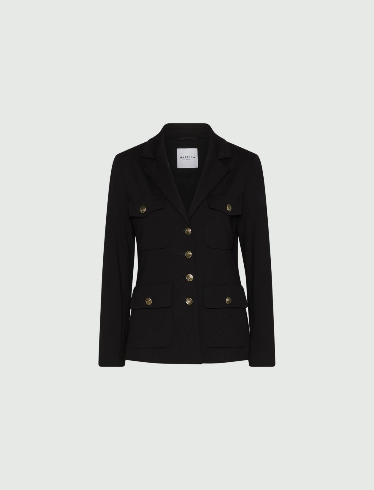 Σακάκι με ίσιο μπούστο, εμβληματικές τσέπες με patch και απαλό ζέρσεϊ ύφασμα που τονώνει ολόκληρο το ρούχο. Το κύριο ύφασμα περιέχει πρώτες ύλες που προέρχονται από κυτταρίνη ξύλου, μια ίνα που λαμβάνεται με τρόπο βιώσιμο από δασικούς πόρους. Διαθέτει ίσια εφαρμογή, γιακά με πέτο και κλείσιμο με κουμπιά.