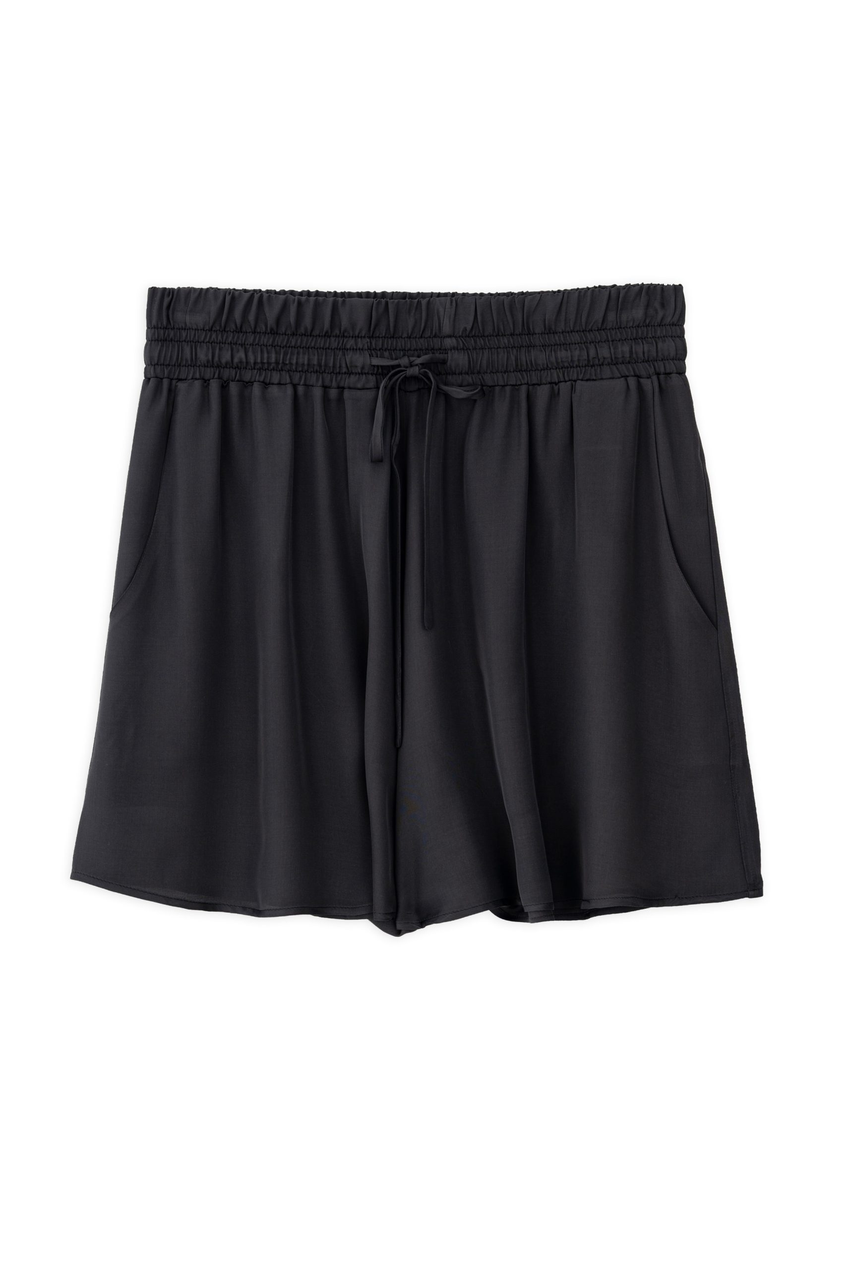 Ψηλόμεσο σορτς με σατέν υφή και τσέπες στο πλάι. Διαθέτει φαρδύ λάστιχο στη μέση και κορδόνι για μεγαλύτερη άνεση και καλύτερη εφαρμογή.
