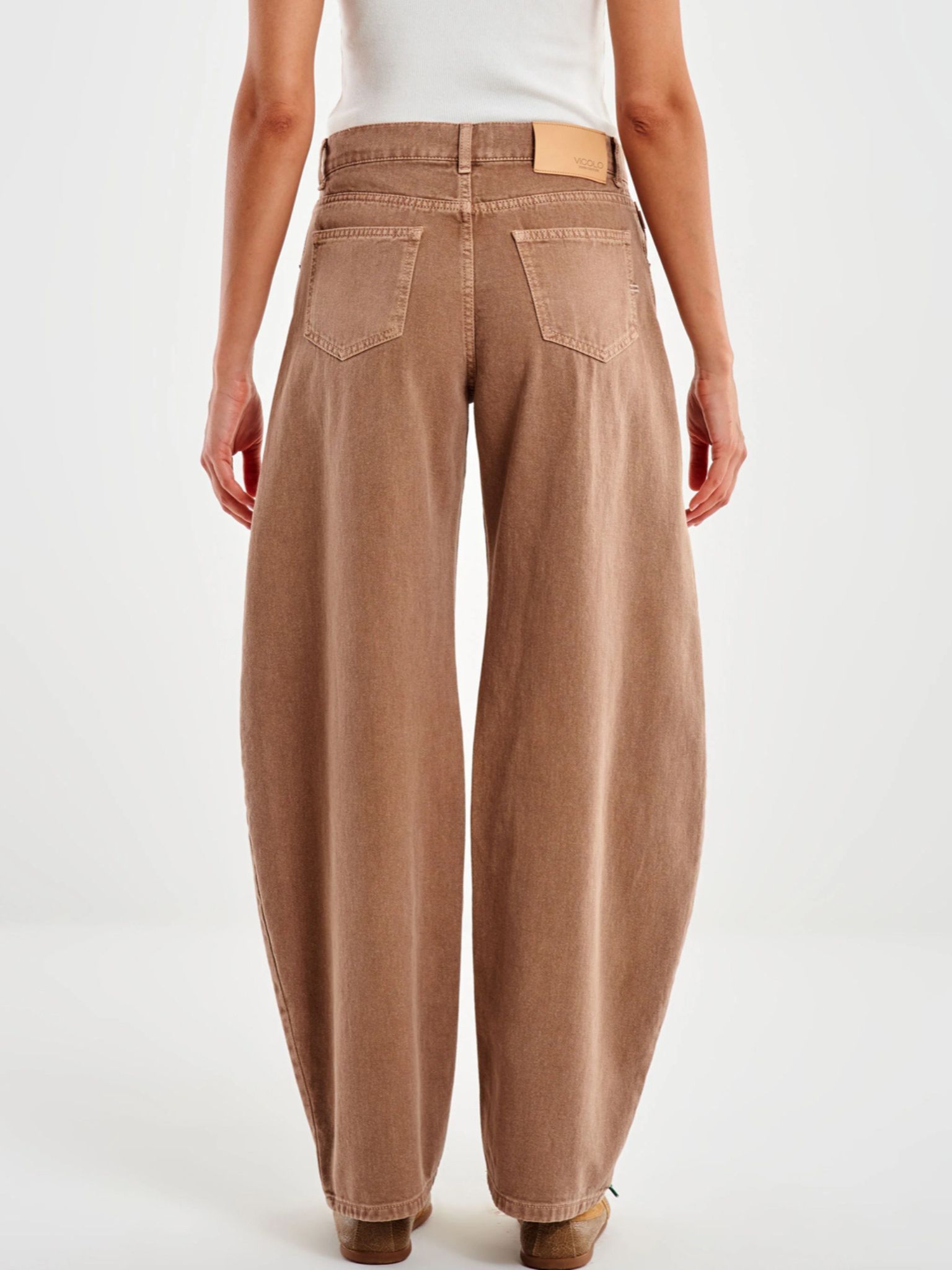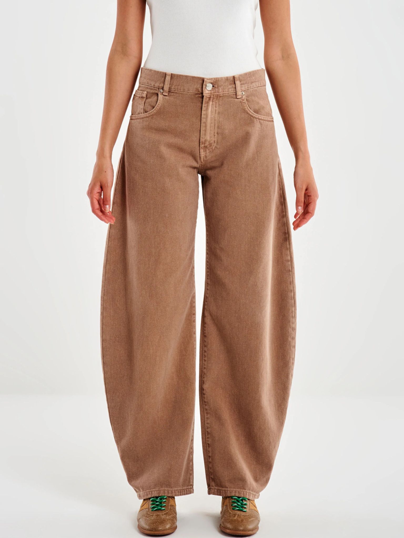 Βαμβακερό τζιν Barrel σε μπεζ απόχρωση. Διαθέτει πέντε τσέπες και κλείσιμο με φερμουάρ και κουμπί για ασφαλή εφαρμογή. Σχεδιασμένο με ψηλή μέση και άνετη φαρδιά γραμμή, που προσφέρει κομψότητα και άνεση.