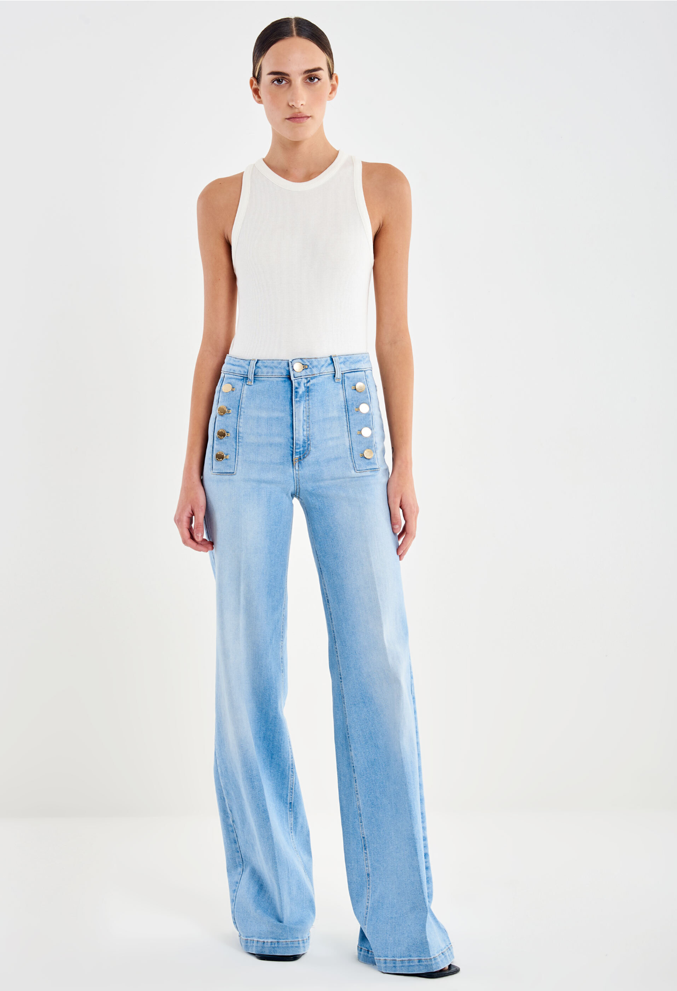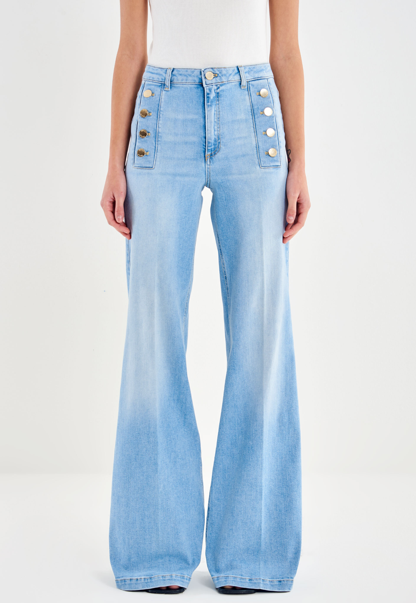Ελαστικό τζιν Giudith με ψηλή μέση, φαρδιά γραμμή και ελαφριά καμπάνα. Κλείσιμο με φερμουάρ μπροστά και μεταλλικά κουμπιά. Λεπτομέρεια με χρυσά κουμπιά στις τσέπες.
