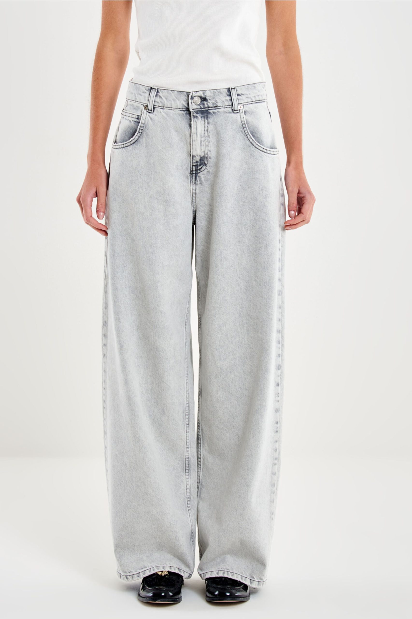 Ψηλόμεσο τζιν σε ίσια-φαρδιά γραμμή, που επιμηκύνει τη σιλουέτα. Διαθέτει πέντε τσέπες και κλείνει με κουμπί και φερμουάρ.