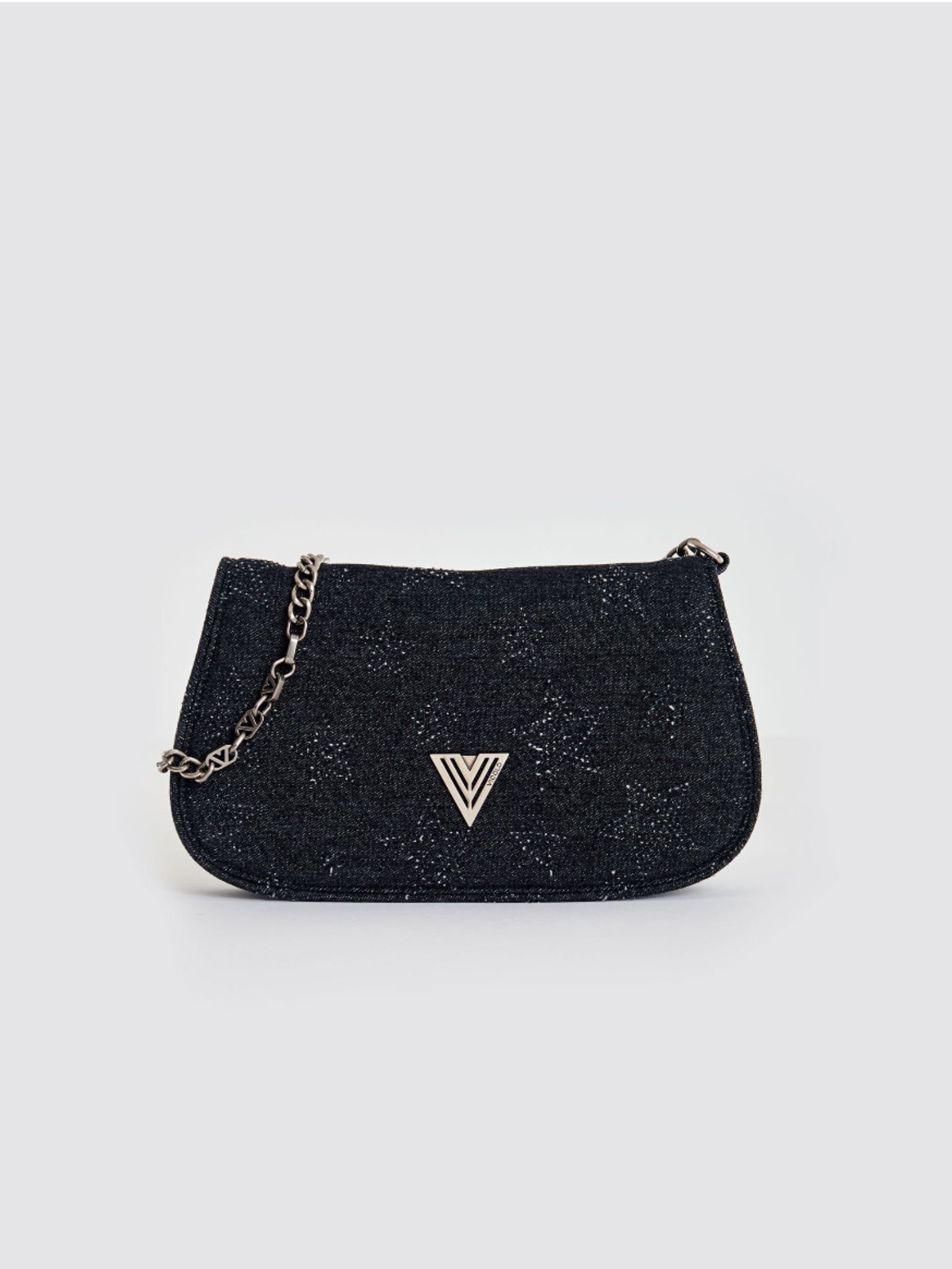 Τσάντα ώμου denim που προσδίδει μια ανεπιτήδευτη και σύγχρονη αισθητική. Το denim υλικό είναι σταθερό αλλά ευέλικτο, διατηρώντας το σχήμα της τσάντας. Η ασημί αλυσίδα λειτουργεί ως statment λεπτομέρεια, δίνοντας ένταση και σε συνδυασμό με το μεταλλικό έμβλημα στο κέντρο ολοκληρώνει την εικόνα με minimal κομψότητα.