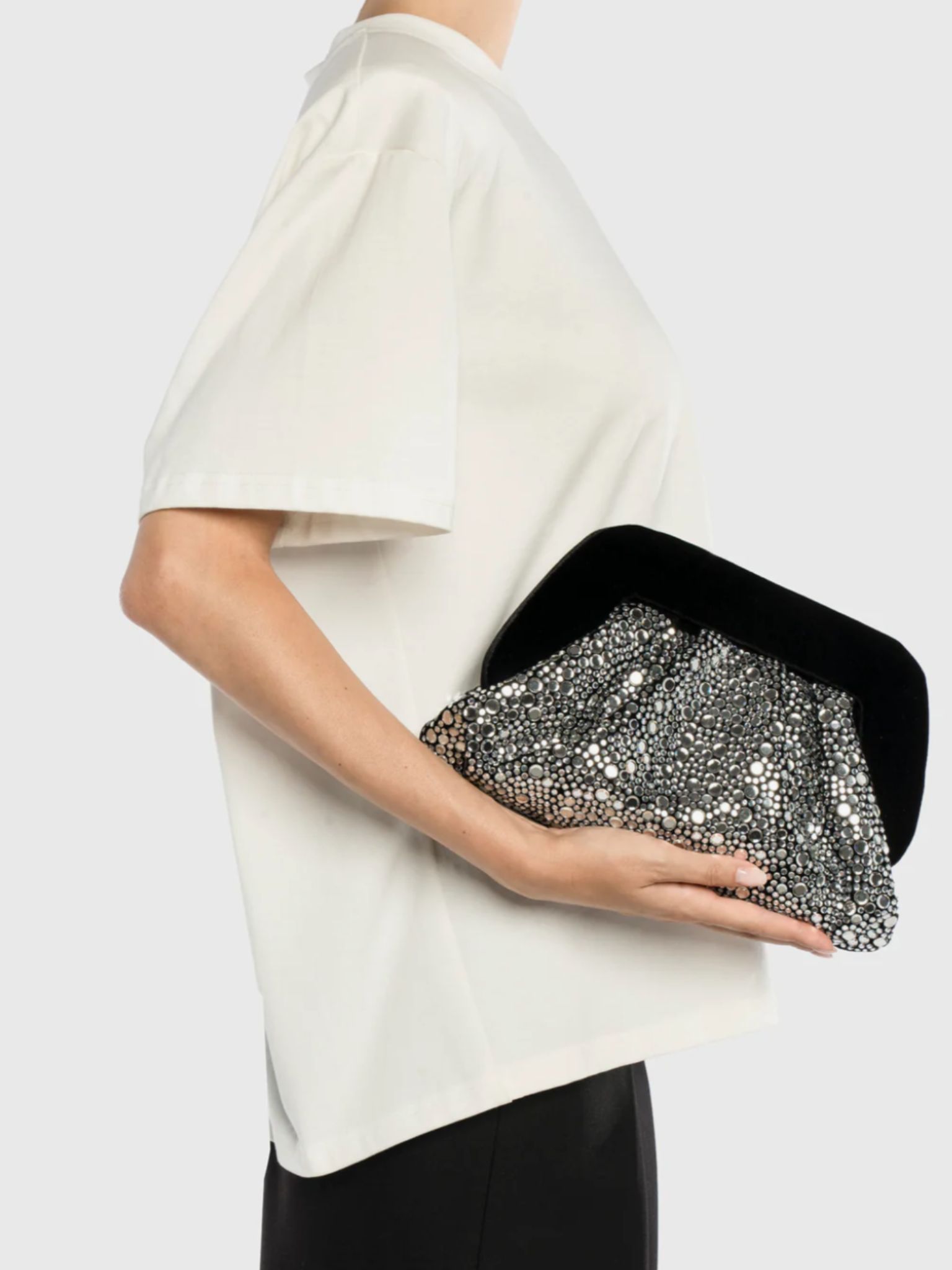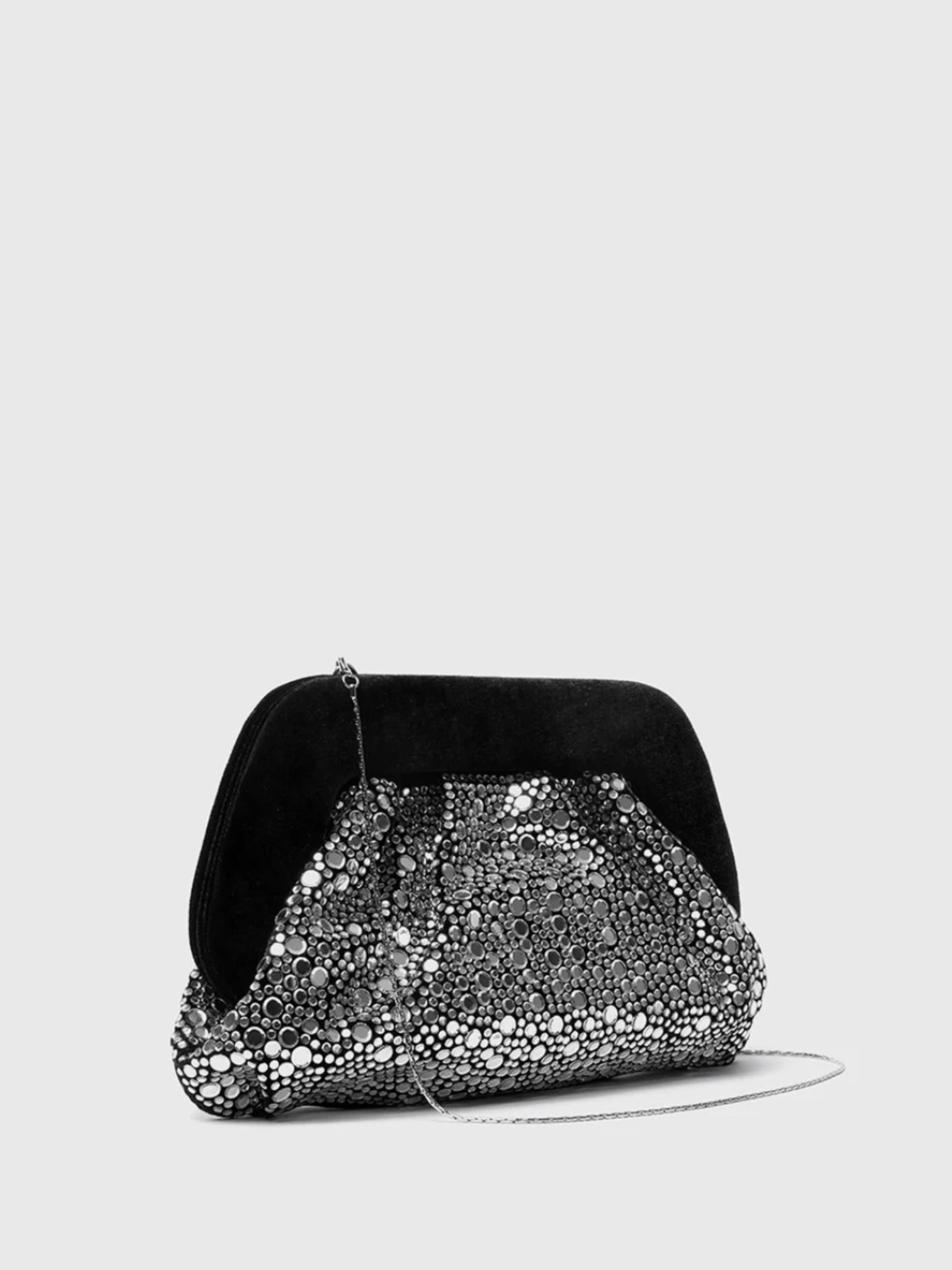 Λαμπερό τσαντάκι με βελούδινη λαβή και σχέδιο καθρέφτη. Διαθέτει αφαιρούμενο μεταλλικό λουράκι ώμου.