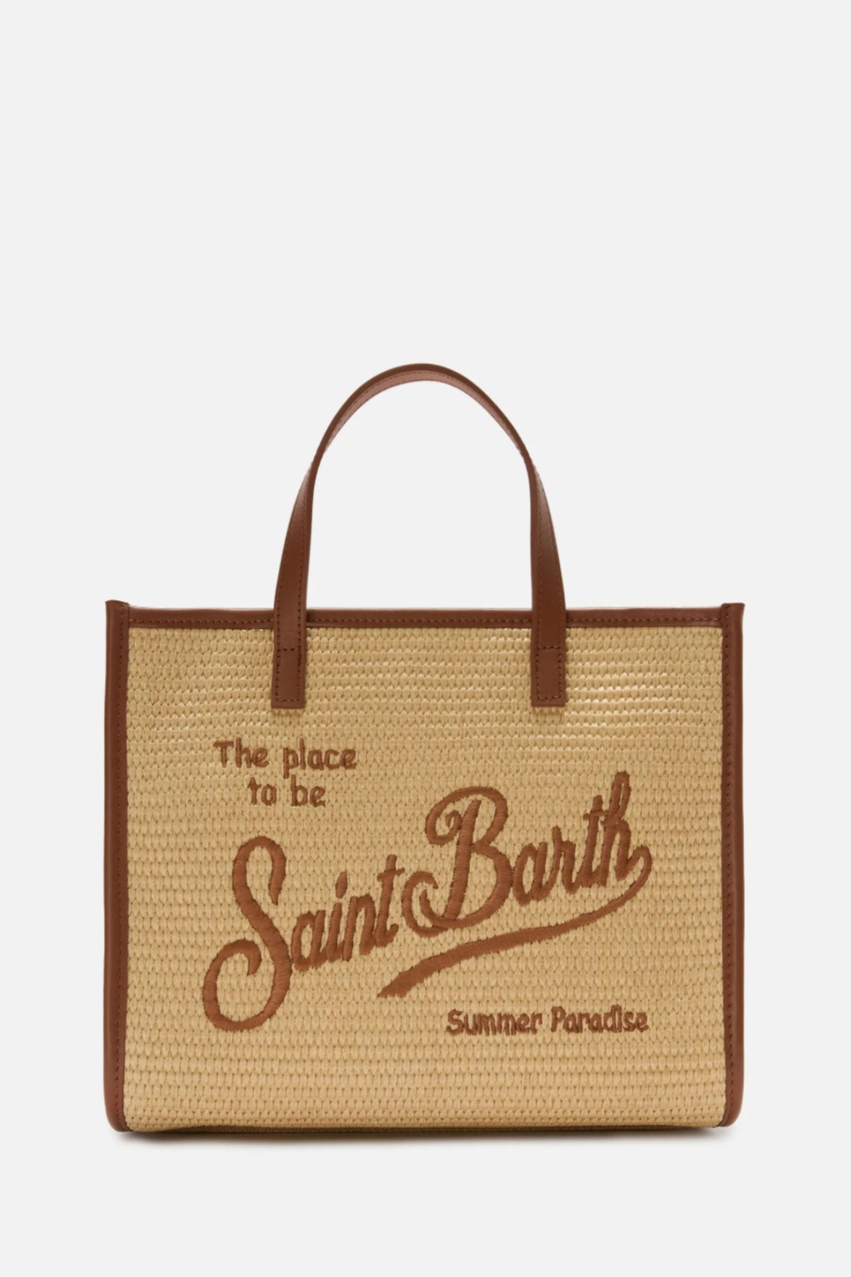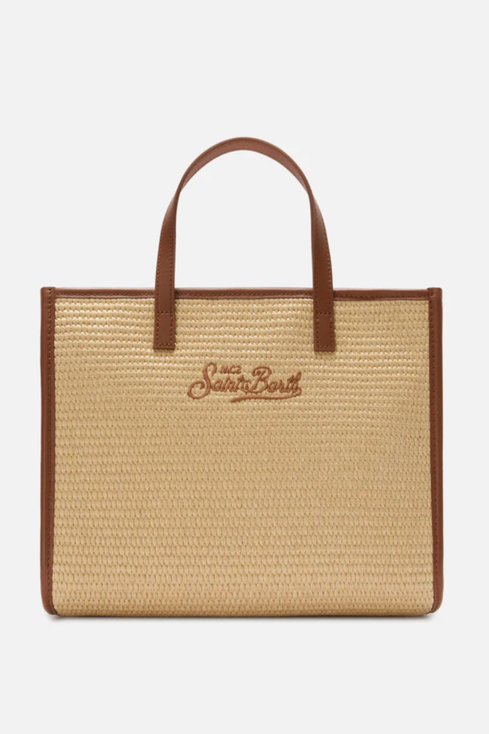 Τσάντα Vivian μεσαίου μεγέθους σε εφέ ψάθας με καφέ κεντημένο λογότυπο