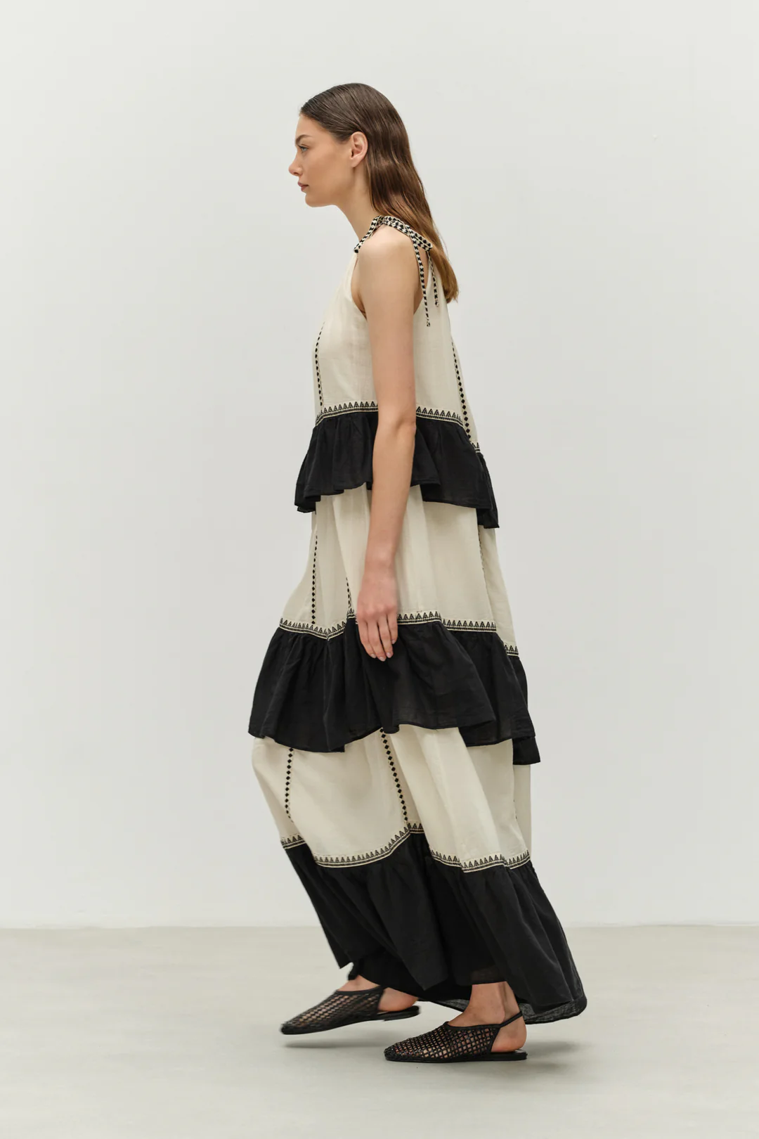Αιθέριο και εντυπωσιακό, αυτό το μάξι φόρεμα σε ζακάρ ύφανση συνδυάζει το διαχρονικό off-white με κομψές μαύρες λεπτομέρειες, δημιουργώντας ένα αποτέλεσμα που αποπνέει φινέτσα και στυλ. Οι παρτοί ώμοι αναδεικνύουν διακριτικά τη σιλουέτα, προσφέροντας θηλυκότητα με μια μοντέρνα νότα. Η μακριά γραμμή του αγκαλιάζει το σώμα με αέρινη κίνηση, ενώ η πλούσια υφή του ζακάρ υφάσματος προσδίδει βάθος και χαρακτήρα.