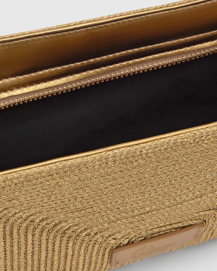 Τσάντα clutch με χρυσό αποσπώμενο αλυσιδάκι. Διαθέτει λουράκι καρπού, εσωτερική επένδυση και κλείσιμο με φερμουάρ που εξασφαλίζει ασφάλεια.
