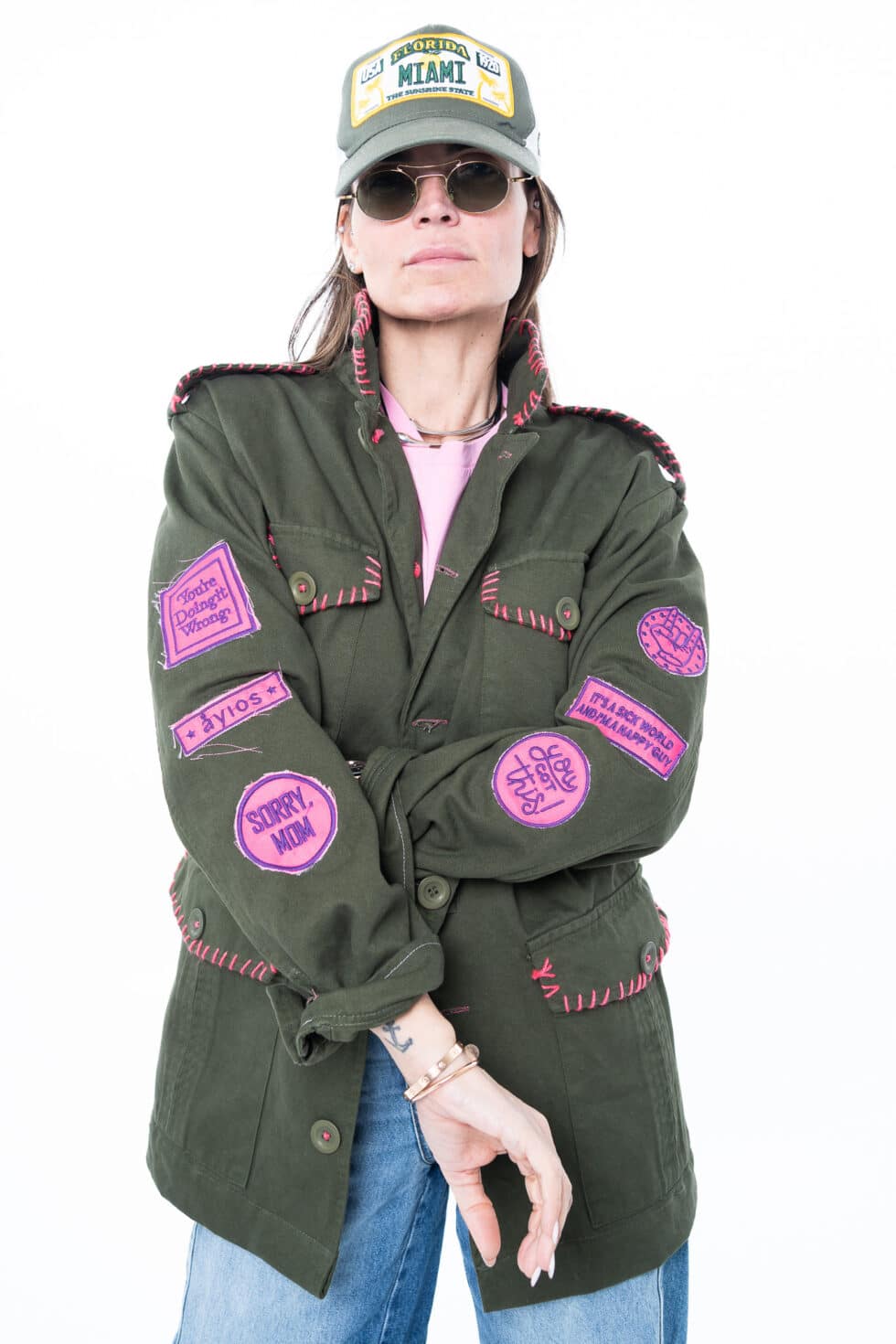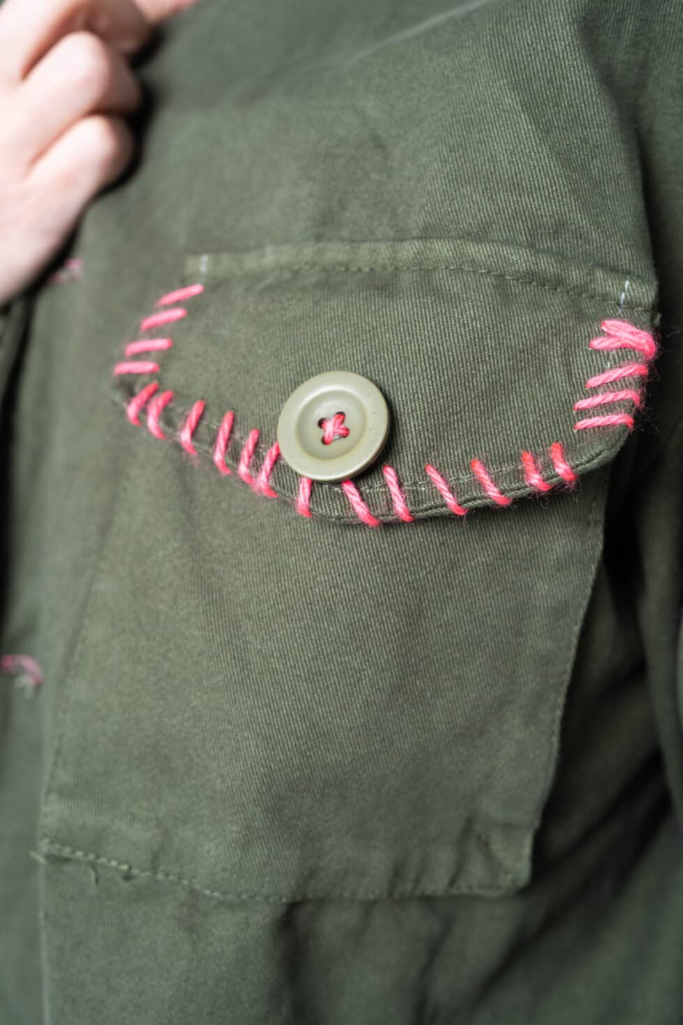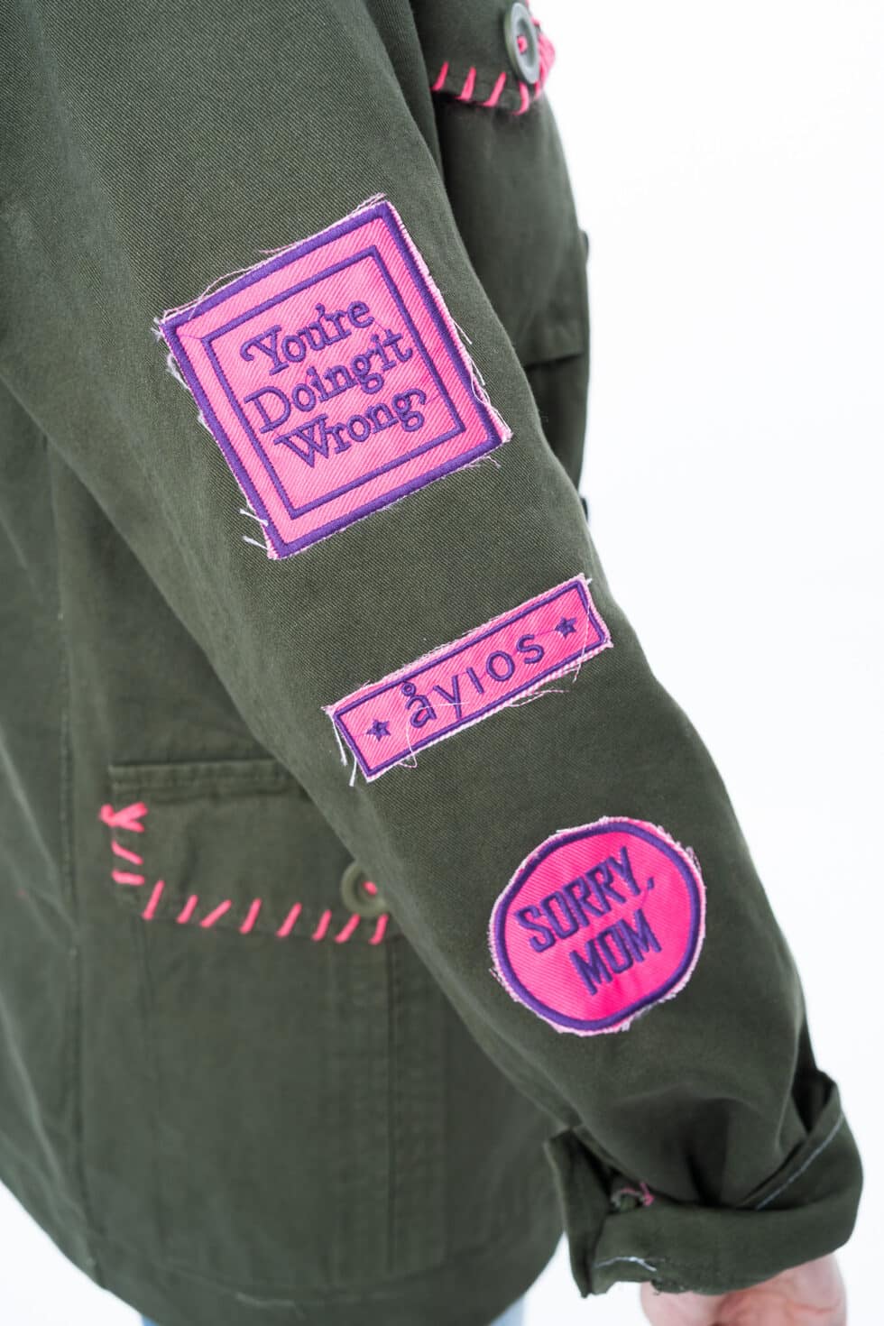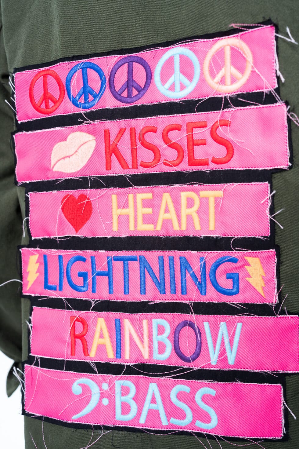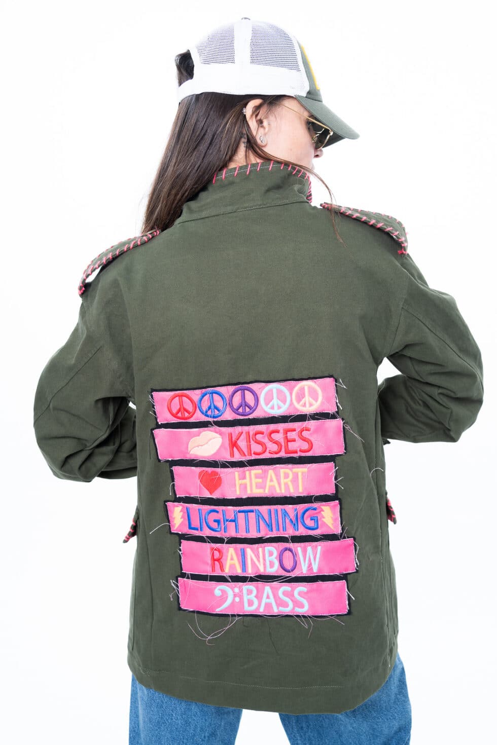 Χειροποίητο τζάκετ με funky διακοσμητικά patches, γιακά και τσέπες. Έχει χαλαρή, ίσια γραμμή.