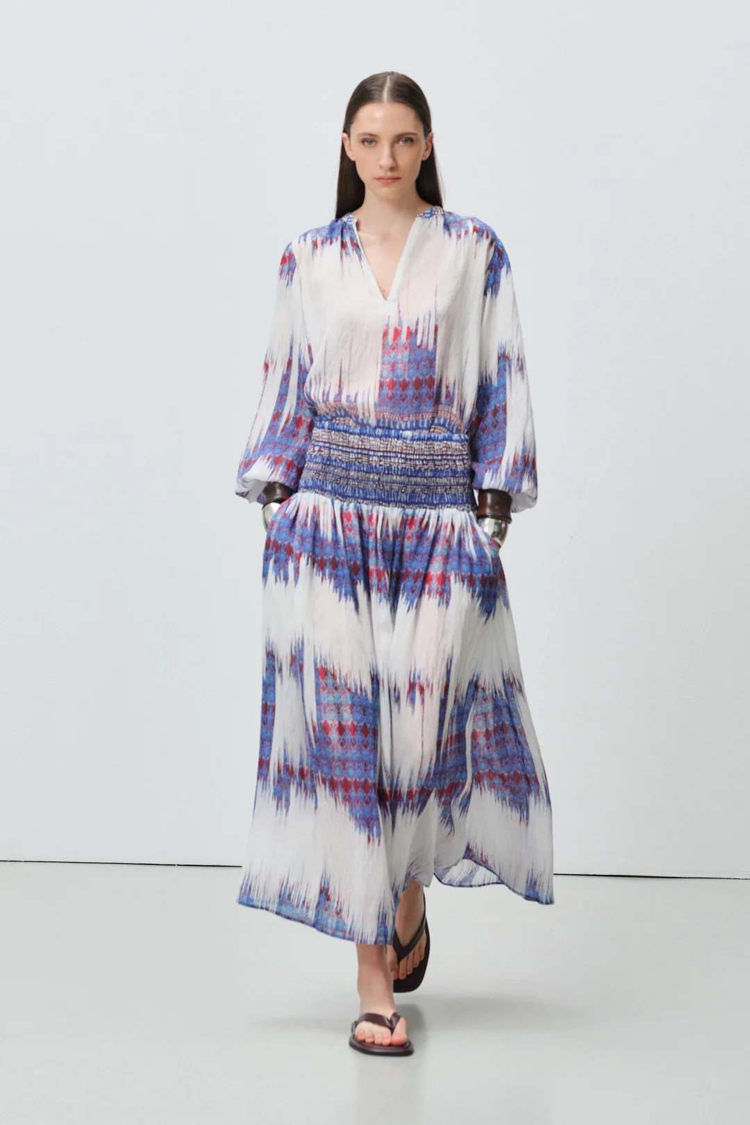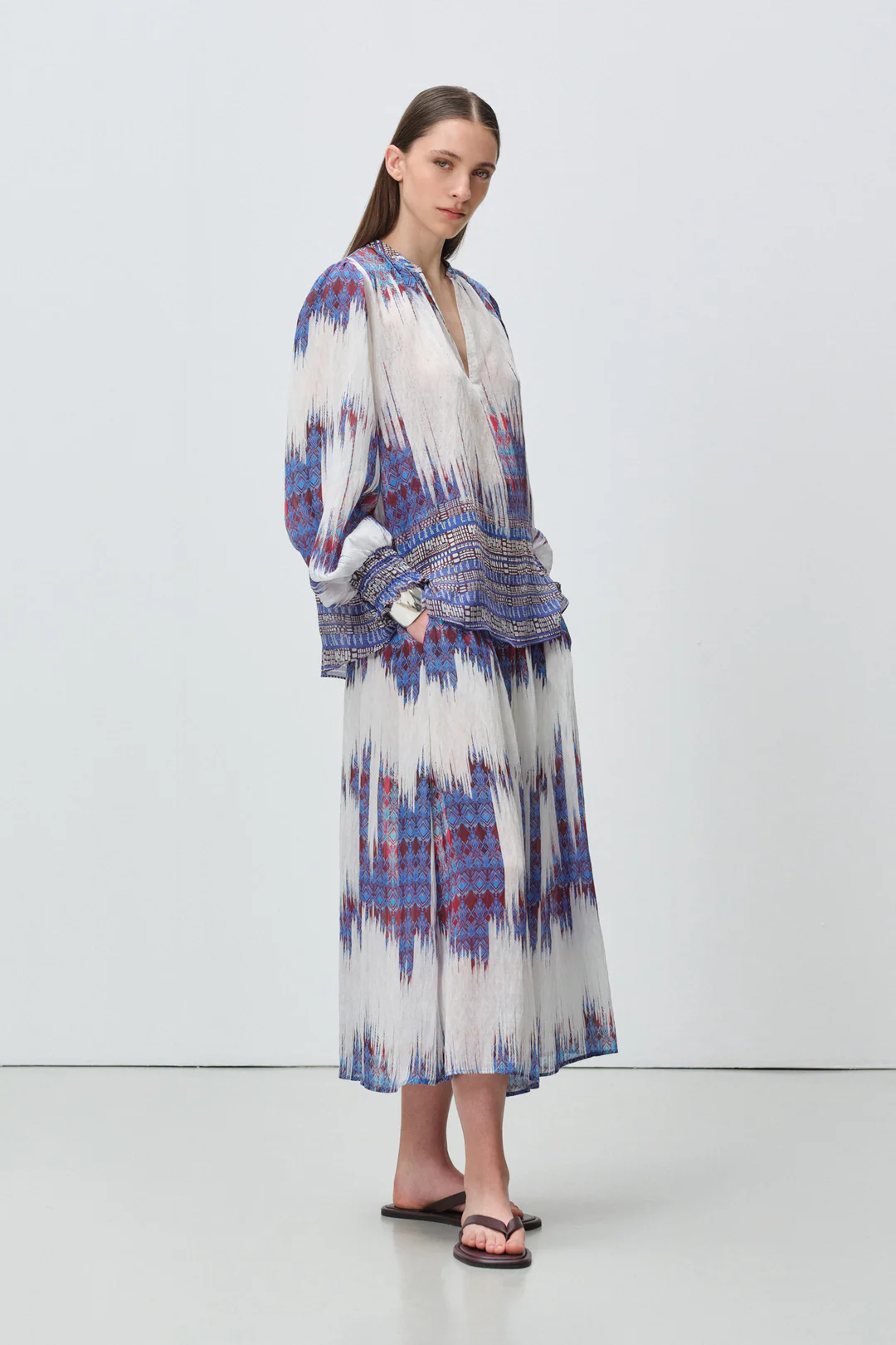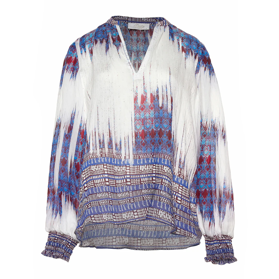 Χαλαρή oversized εφαρμογή με απαλή ντραπέ σιλουέτα Βαθύ ντεκολτέ V. Μακριά ογκώδη μανίκια με ελαστικές μανσέτες , αφηρημένο tie-dye και μποέμ τελείωμα σε όλη την επιφάνεια σε λευκή βάση με indigo, μπορντό και γήινες λεπτομέρειες Ελαστικό στρίφωμα που δημιουργεί ένα απαλό εφέ μπλούζας
