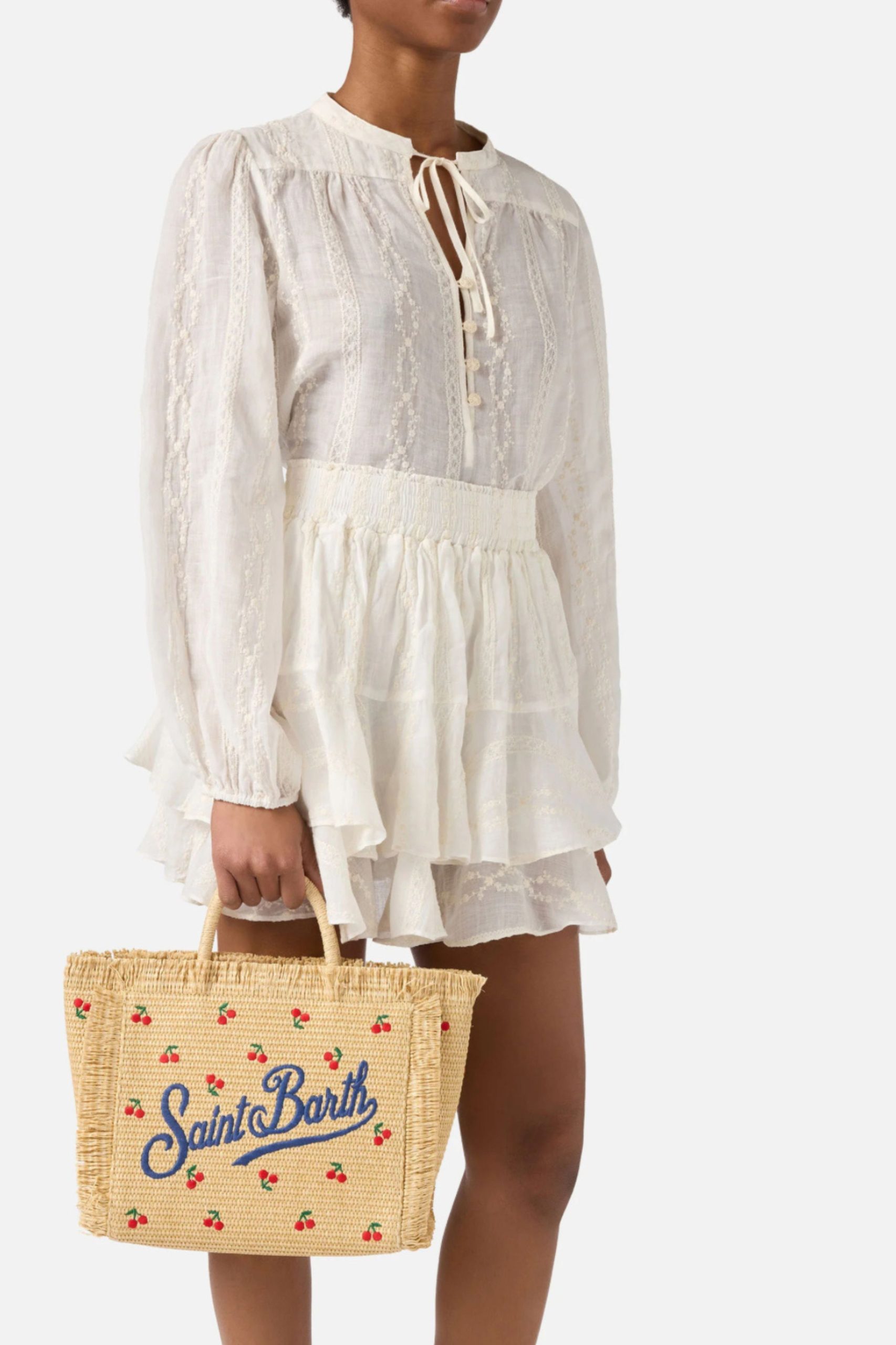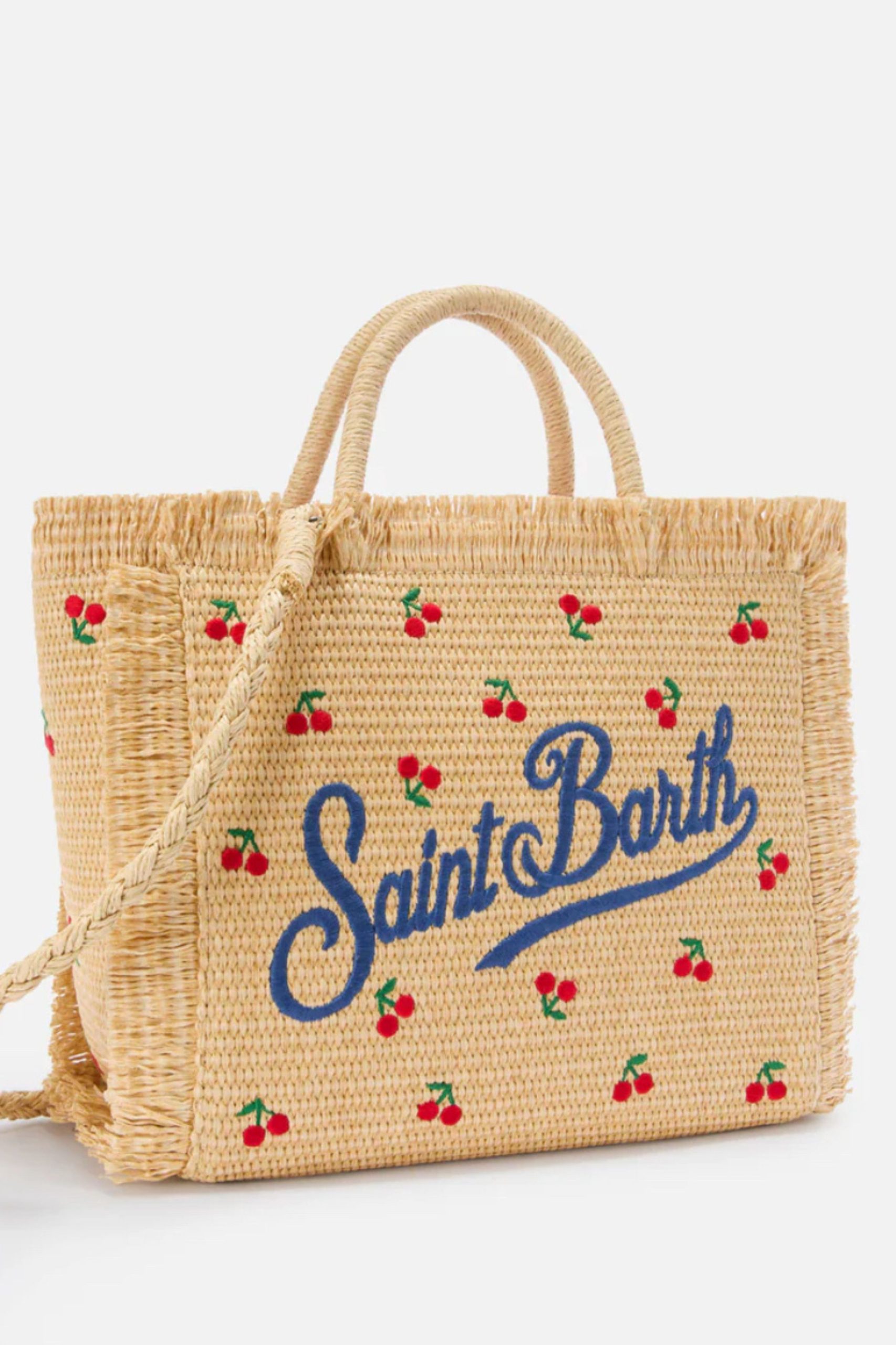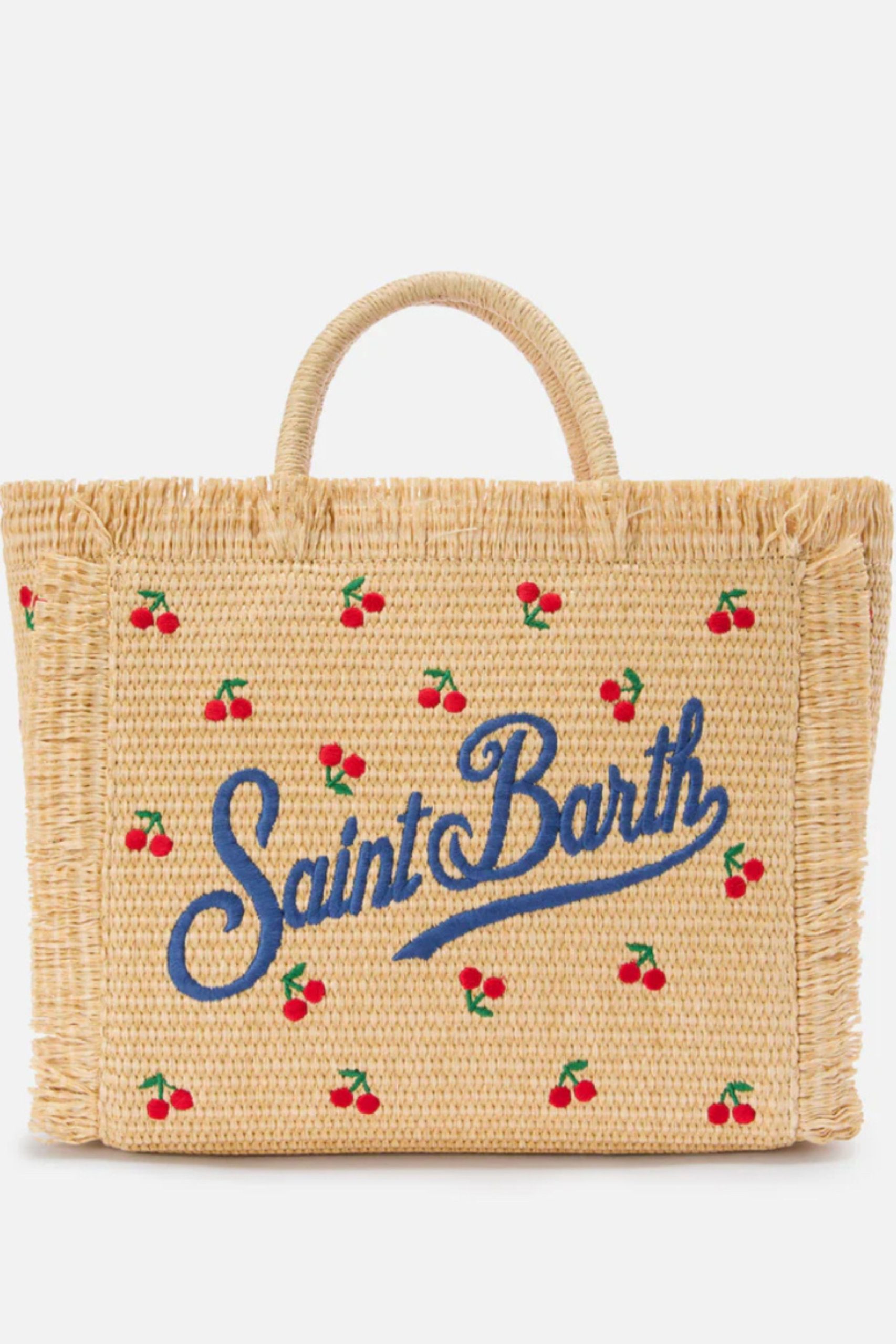 Ύφασμα με εφέ άχυρου Φυσικό Κέντημα κερασιάς σε όλη την επιφάνεια, κεντημένο λογότυπο στο μπροστινό μέρος, ρυθμιζόμενο και αφαιρούμενο λουράκι, διπλές λαβές στο πάνω μέρος, κλείσιμο με φερμουάρ στο πάνω μέρος, Εσωτερική τσέπη.
