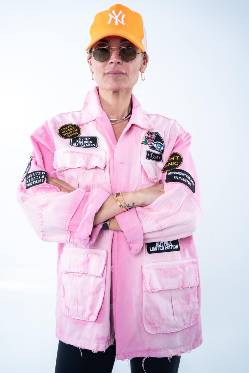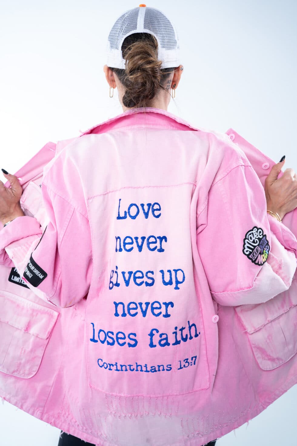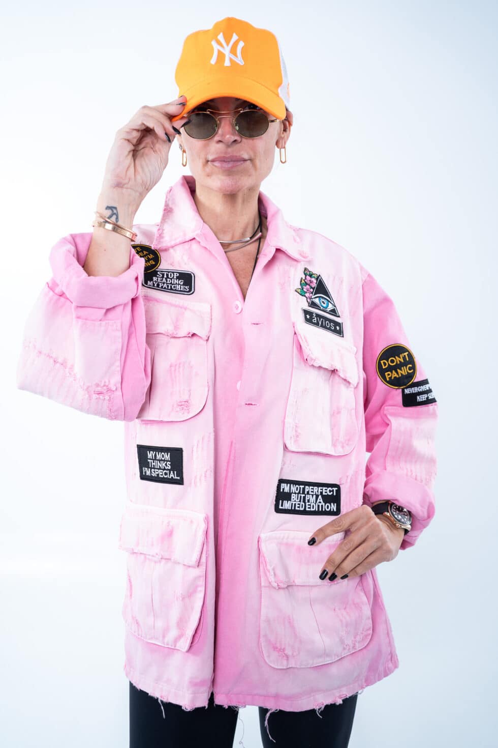Χειροποίητο τζάκετ με funky διακοσμητικά patches, γιακά και τσέπες. Έχει χαλαρή, ίσια γραμμή.