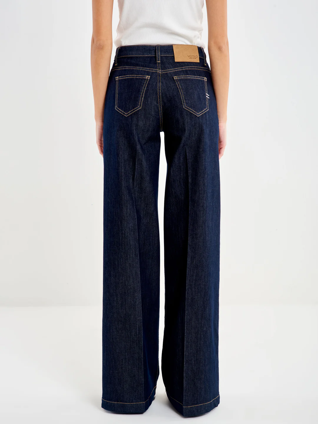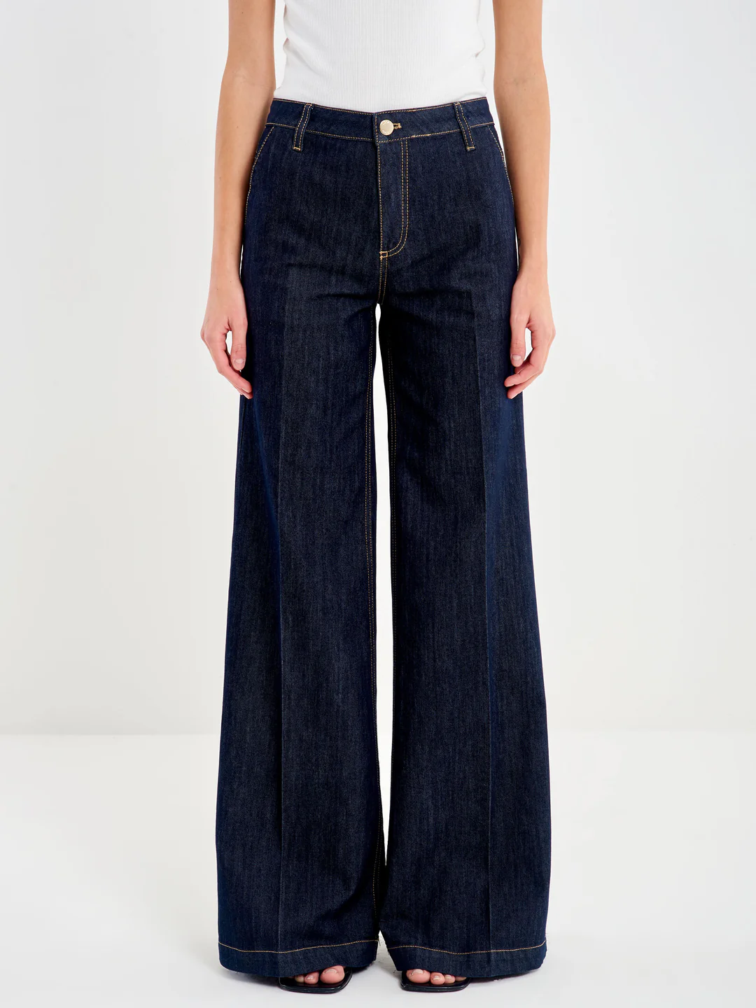 Τζιν Elena με ψηλόμεσο φαρδύ μπατζάκι. Κλείσιμο μπροστά με μεταλλικό κουμπί και φερμουάρ. Τσέπες γαλλικού τύπου. Λεπτομέρεια με πιέτες μπροστά και πίσω στο κέντρο του ποδιού. Τζιν με σκούρο ξέβγαλμα