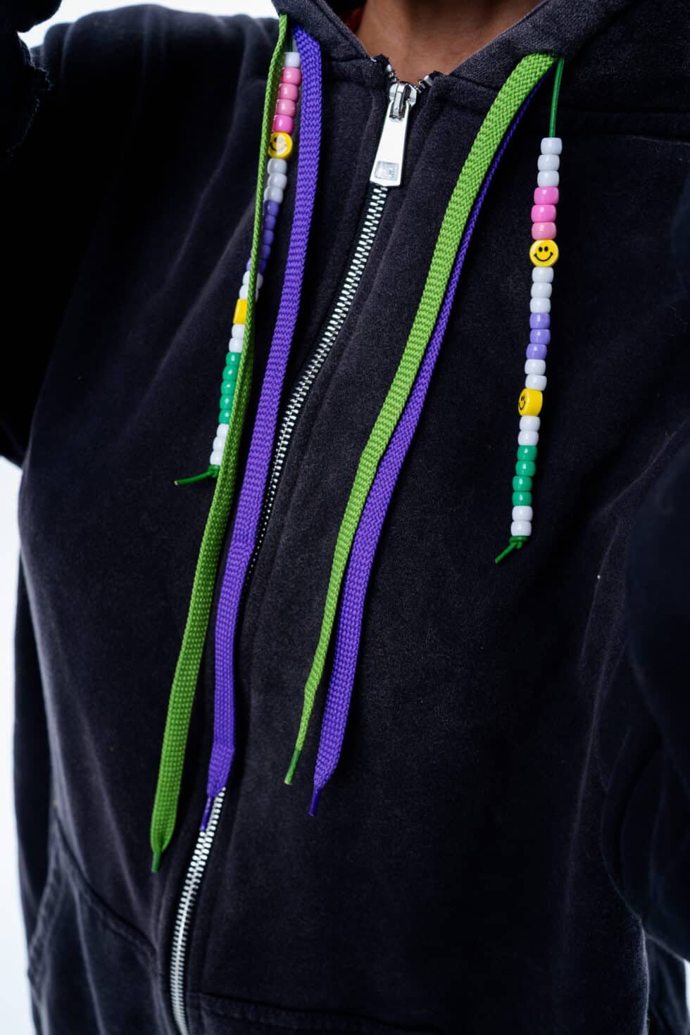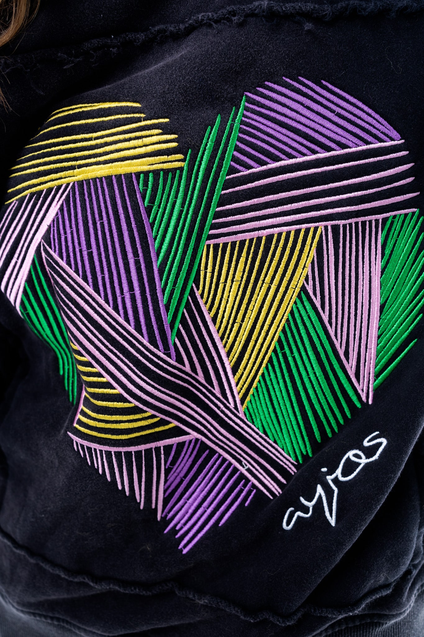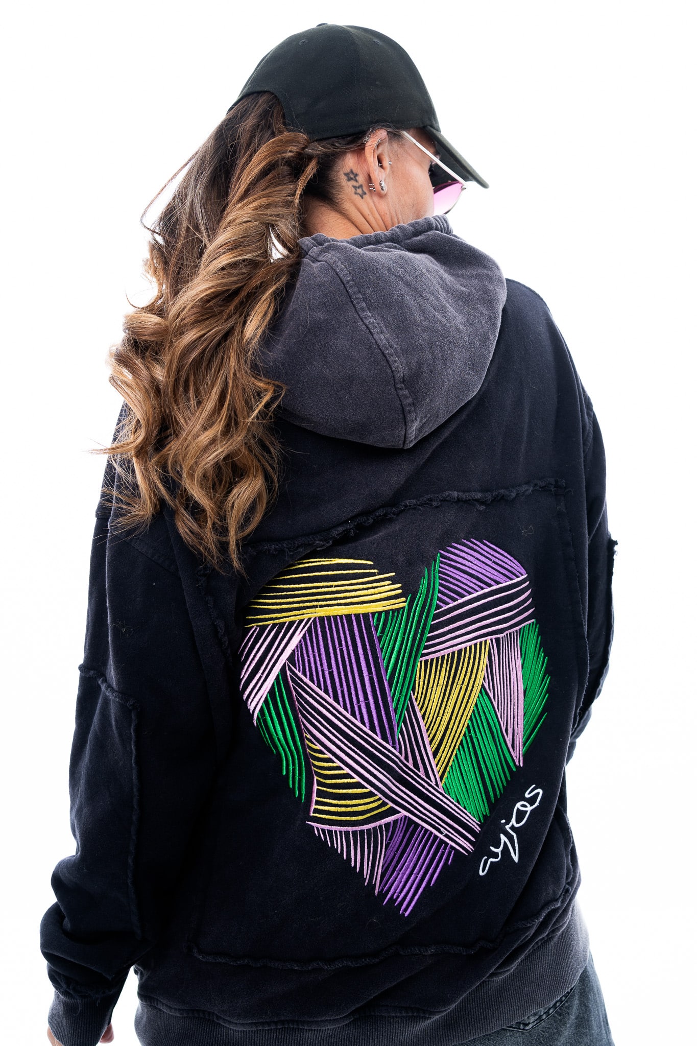 Ζακέτα σε χαλαρή γραμμή με κουκούλα σε off black ξεβαμμένη απόχρωση . Κλείνει με φερμουάρ και διαθέτει ένα μεγάλο κεντητό σχέδιο καρδιάς στο πίσω μέρος.
