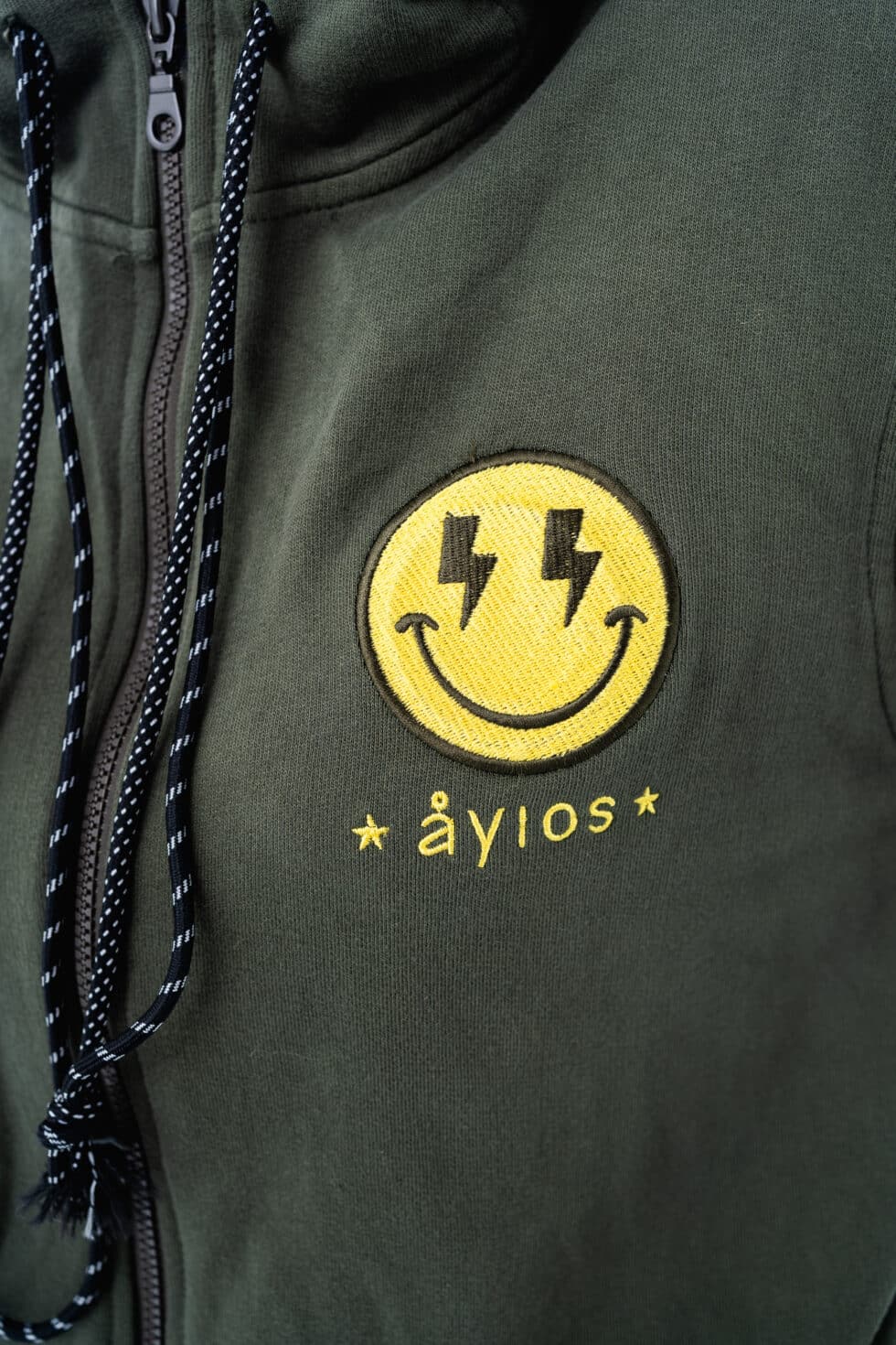 Ζακέτα φούτερ με φερμουάρ, κατασκευασμένη από μαλακό και ζεστό ύφασμα για απόλυτη άνεση και στυλ. Στο μπροστινό μέρος ξεχωρίζει το AYIOS smiley logo σε έντονο κίτρινο, ενώ στο πίσω μέρος την παράσταση κλέβει το εντυπωσιακό smiley patch σε έντονο κίτρινο χρώμα.