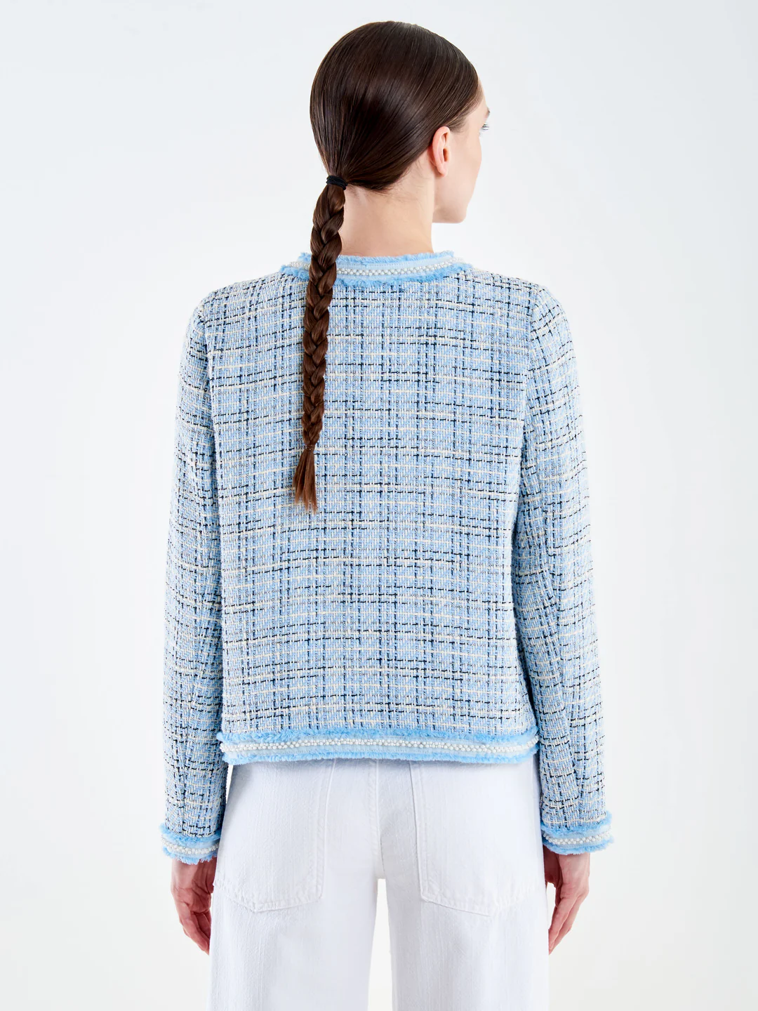 Κοντή ζακέτα με σχέδια και μακριά μανίκια. Τσέπες μπροστά με μπαλώματα. Λεπτομέρειες στο τελείωμα εμπλουτισμένες με κέντημα με χάντρες και κρόσσια.