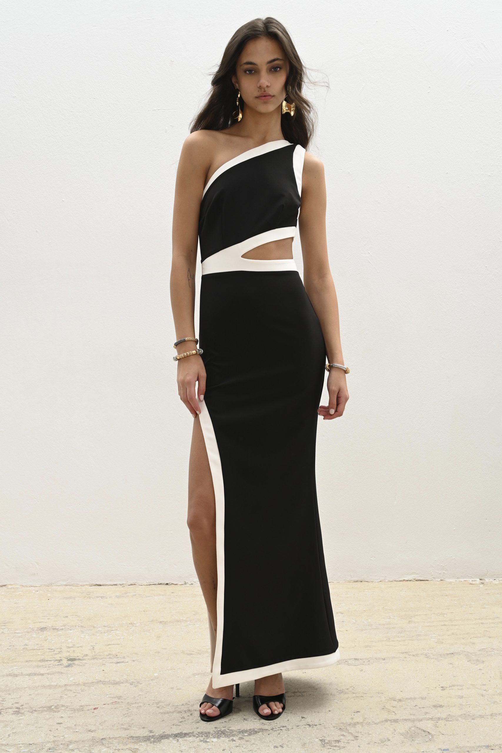 Μαύρο μάξι φόρεμα με κολακευτικό κόψιμο στη μέση και κομψό πλαϊνό σκίσιμο, ενισχυμένο με λευκές λεπτομέρειες σε αντίθεση. Ένα τολμηρό και κομψό κομμάτι που δημιουργεί μια κομψή, μοντέρνα σιλουέτα – ιδανικό για ξεχωριστές βραδινές εμφανίσεις.