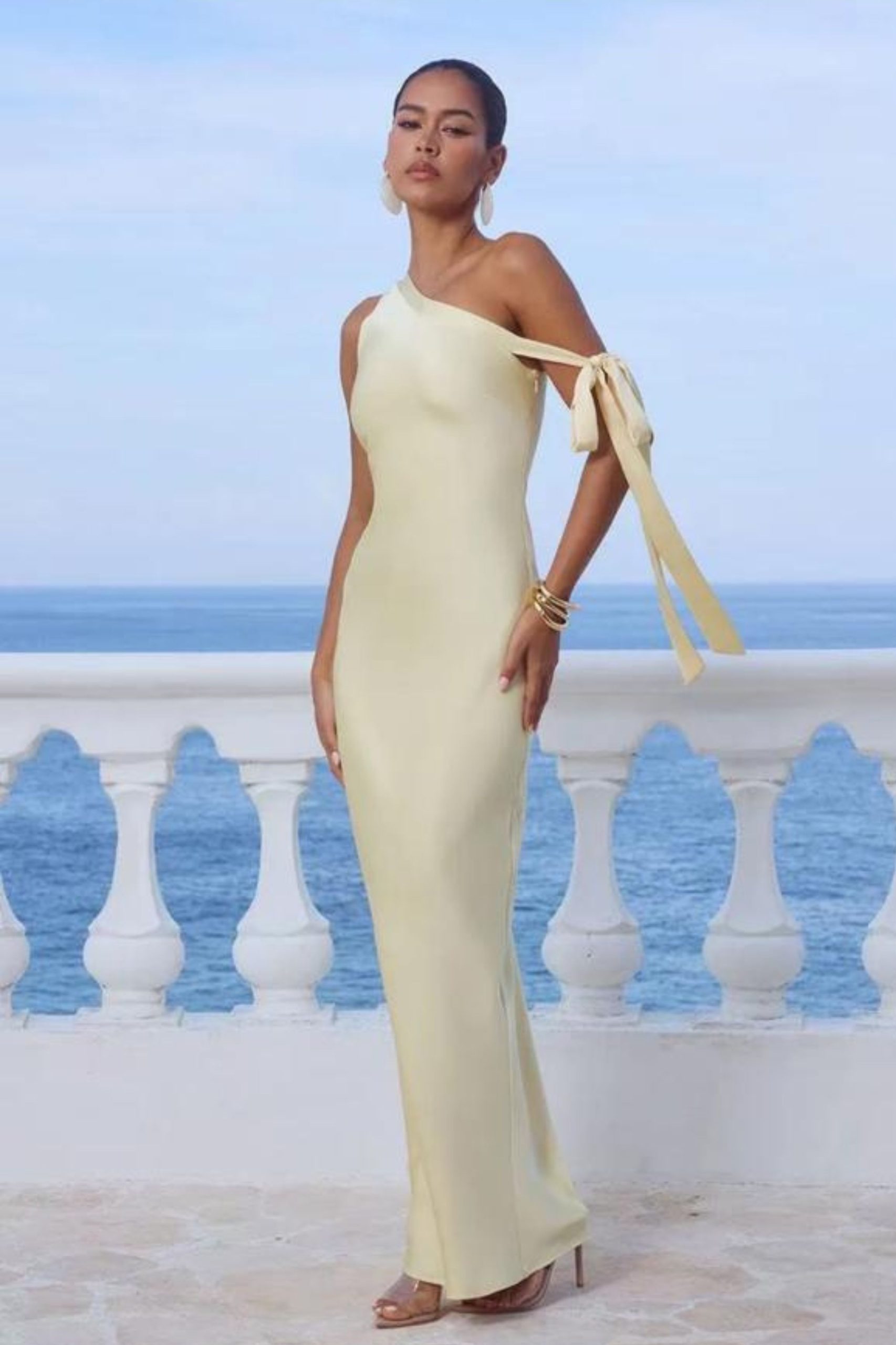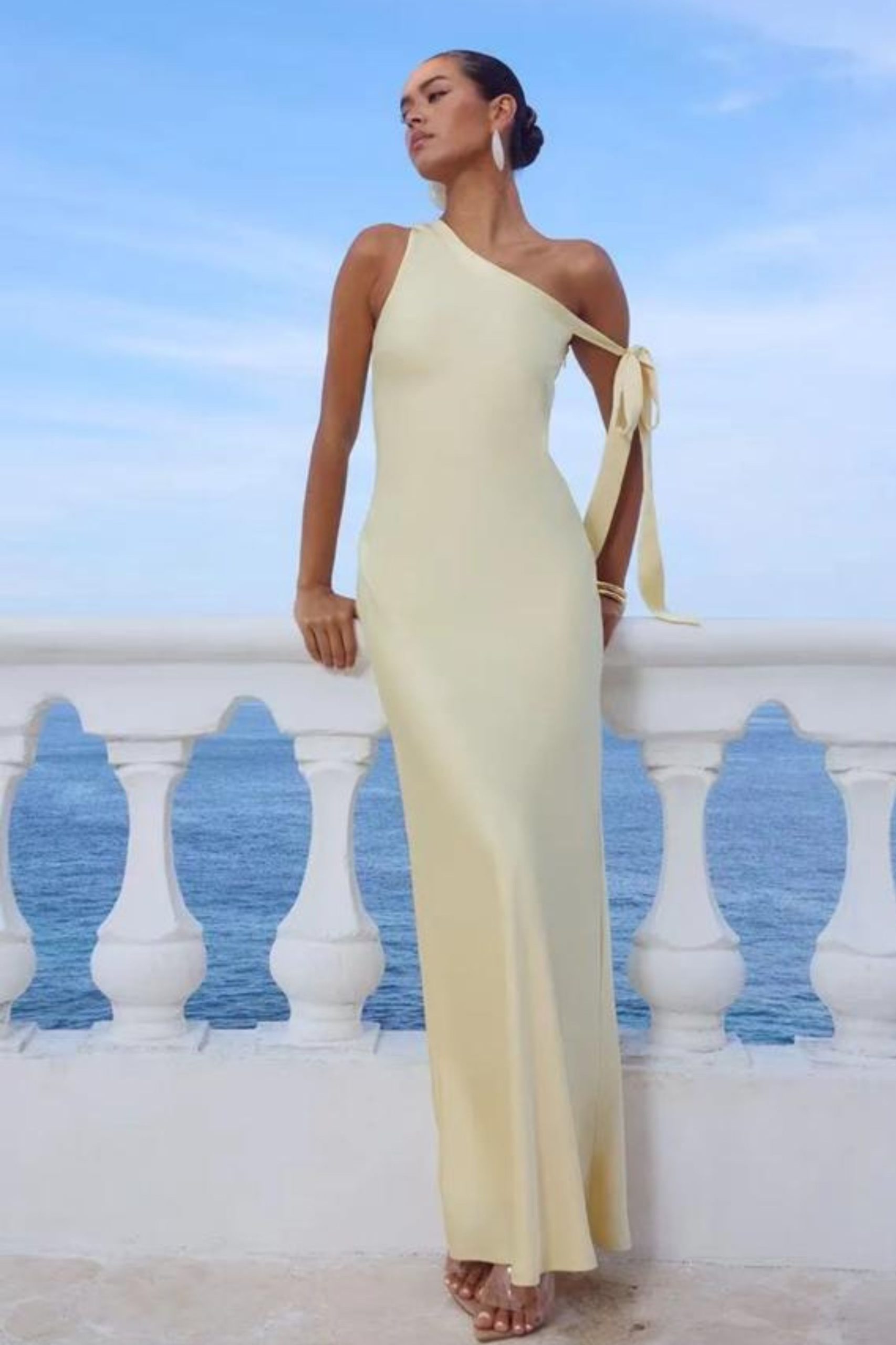Maxi minimal φόρεμα one shoulder σε ίσια γραμμή. Η ασύμμετρη λεπτομέρεια με δέσιμο στο μανίκι προσθέτει κίνηση και ρομαντικό χαρακτήρα. Κλείνει με κρυφό φερμουάρ στο πλάι.