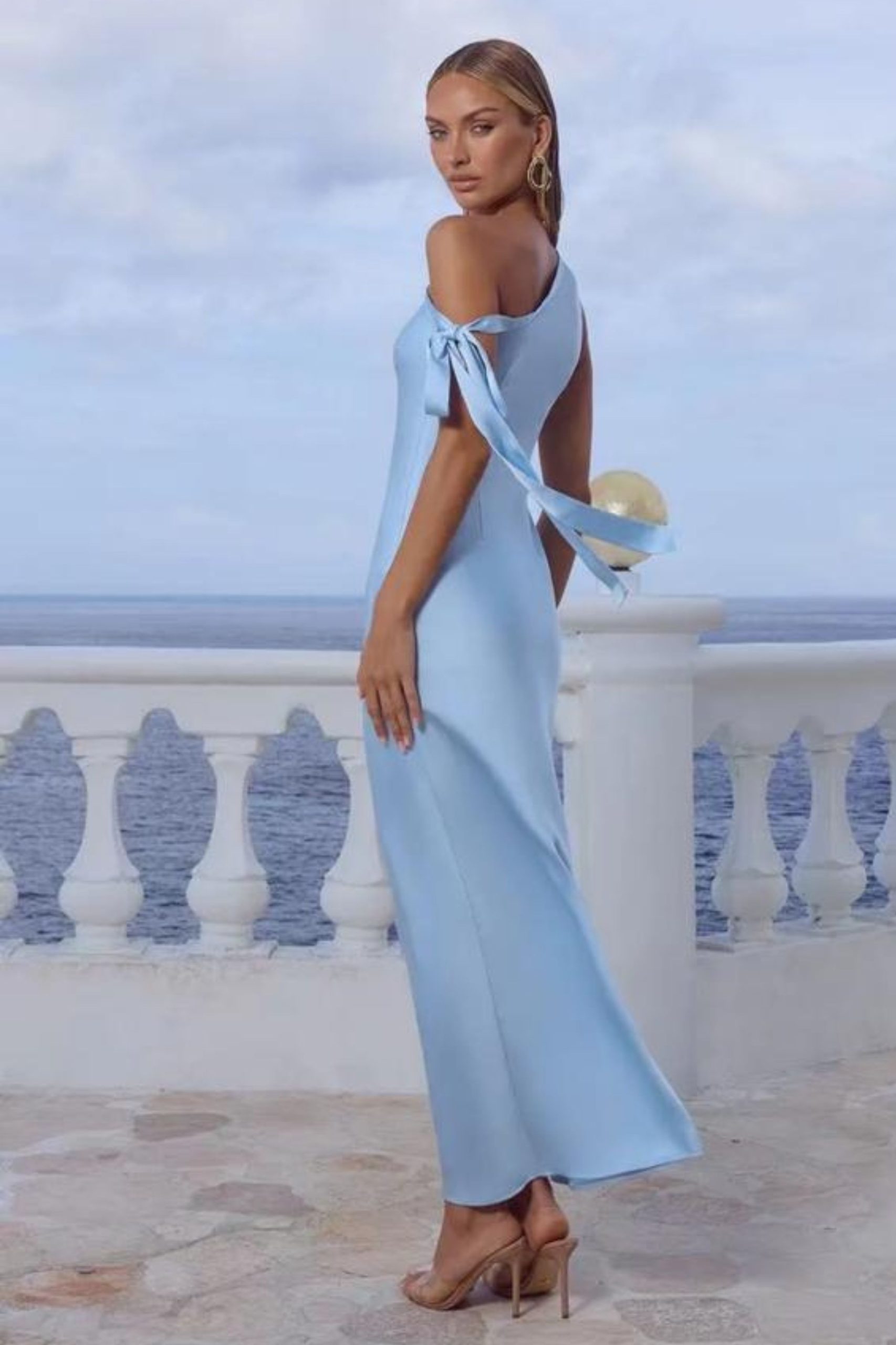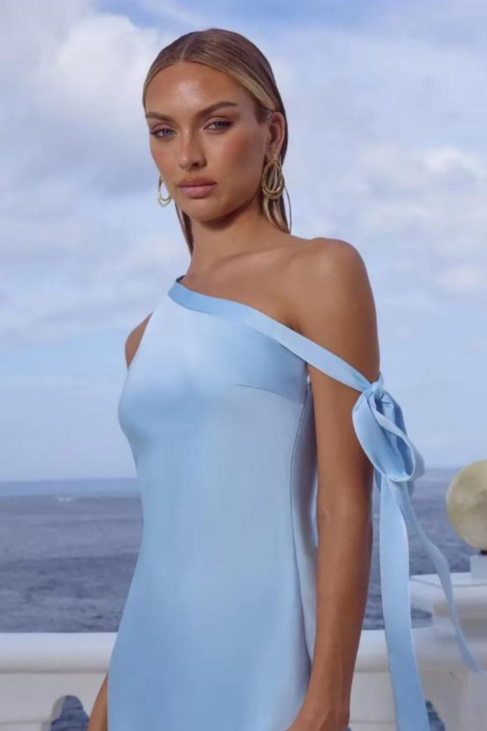 Maxi minimal φόρεμα one shoulder σε ίσια γραμμή. Η ασύμμετρη λεπτομέρεια με δέσιμο στο μανίκι προσθέτει κίνηση και ρομαντικό χαρακτήρα. Κλείνει με κρυφό φερμουάρ στο πλάι.