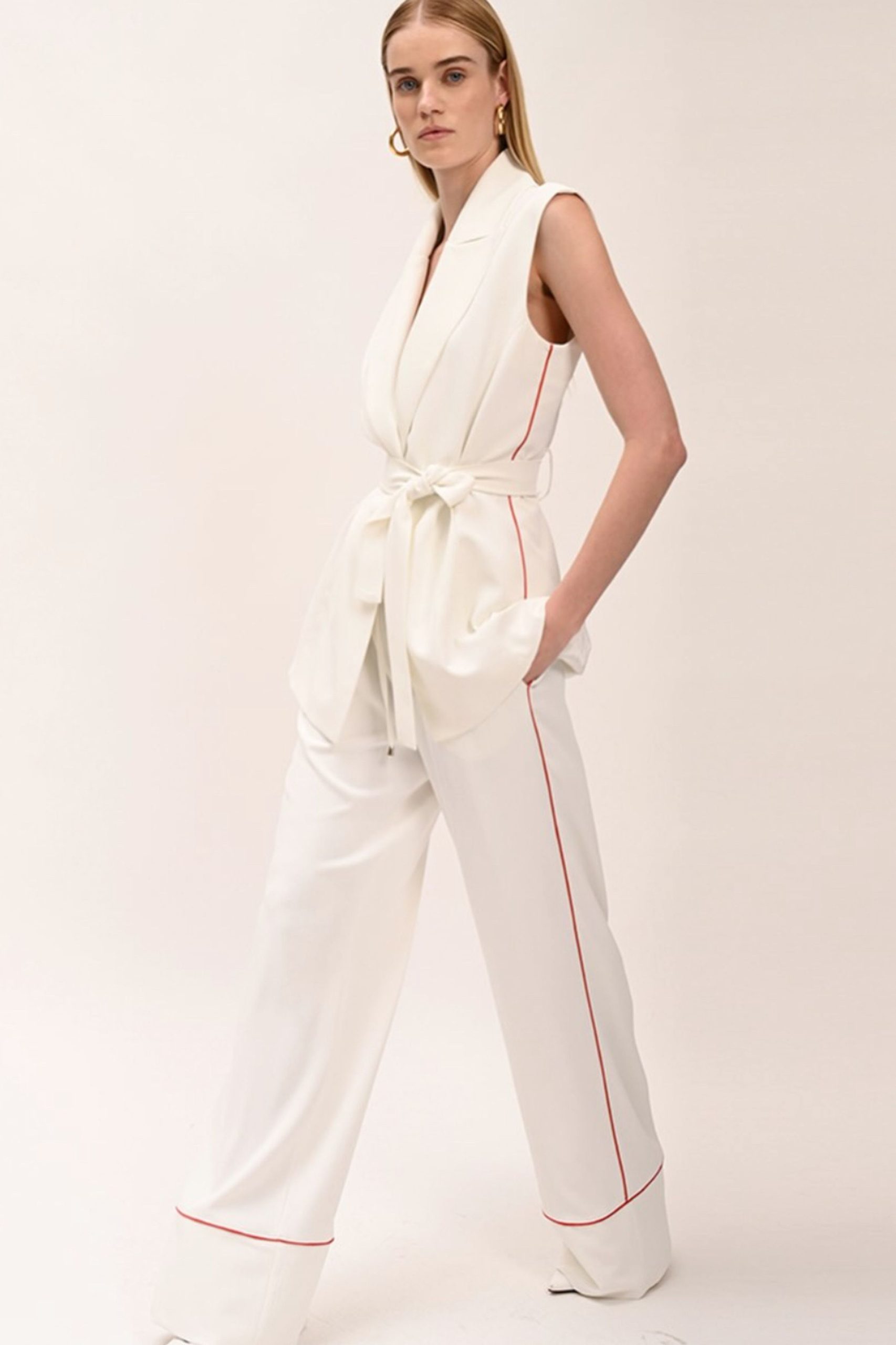 Αμάνικο γιλέκο με ζώνη και γιακά. Διαθέτει εσωτερική φόδρα.