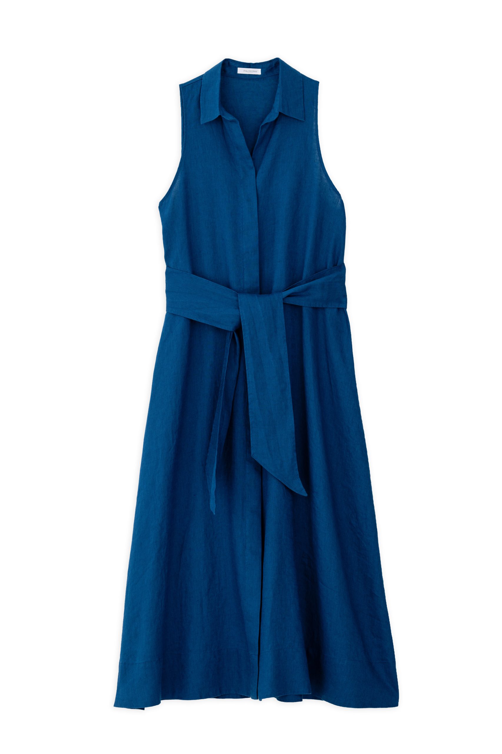 Μίντι αμάνικο φόρεμα με κλασικό γιακά και διακριτικό V ντεκολτέ από 100% λινό ύφασμα. Διαθέτει αποσπώμενη ζώνη και κλείνει με κρυφά κουμπιά.