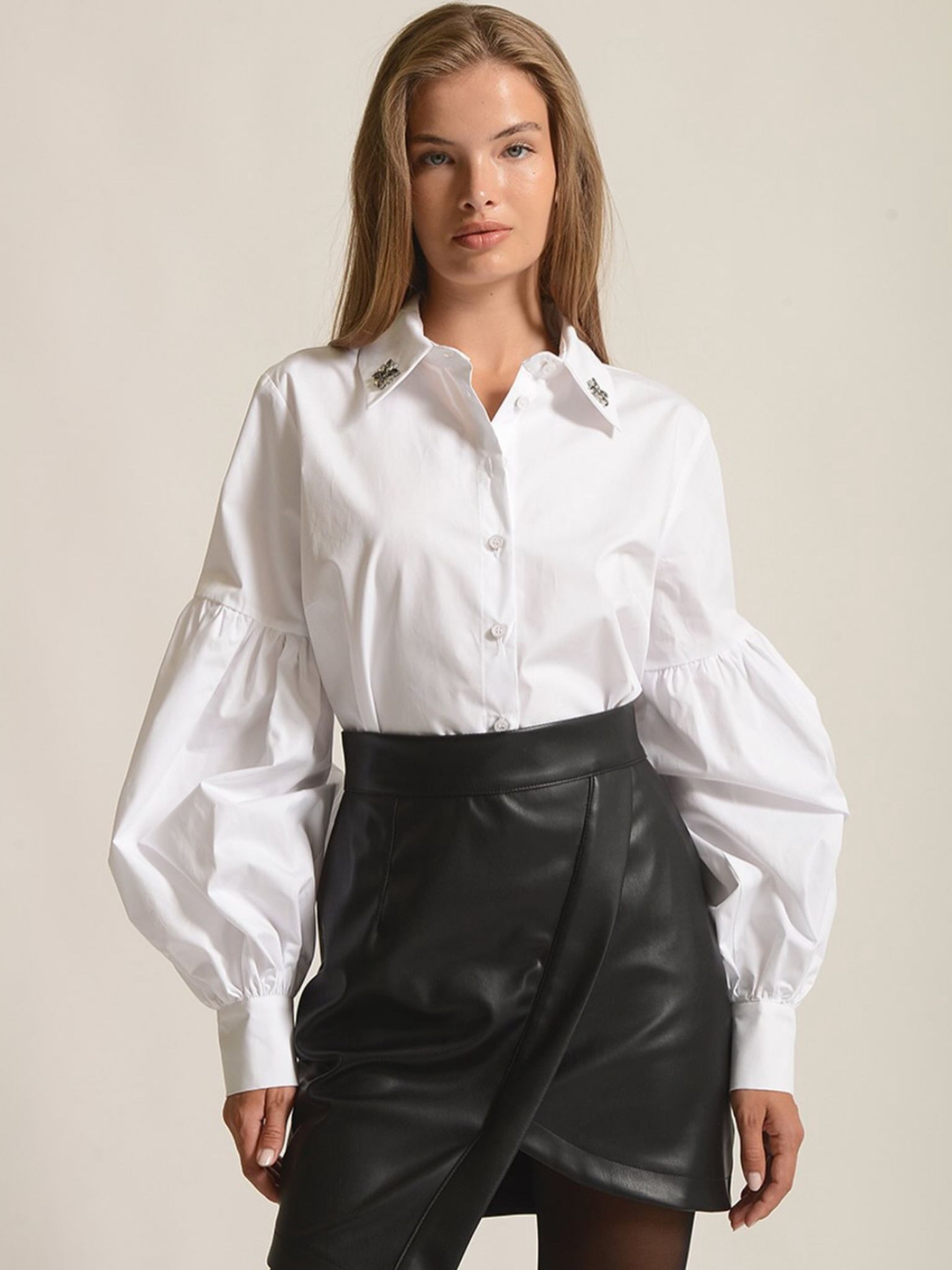 Mini φούστα με δερμάτινη υφή και ασύμμετρο μήκος. Η όψη της είναι κομψά δομημένη, με σταυρωτό κόψιμο που κάνει το ρούχο να ξεχωρίζει. Το ψηλόμεσο τελείωμα της τονίζει διακριτικά τη μέση και κλείνει με φερμουάρ.