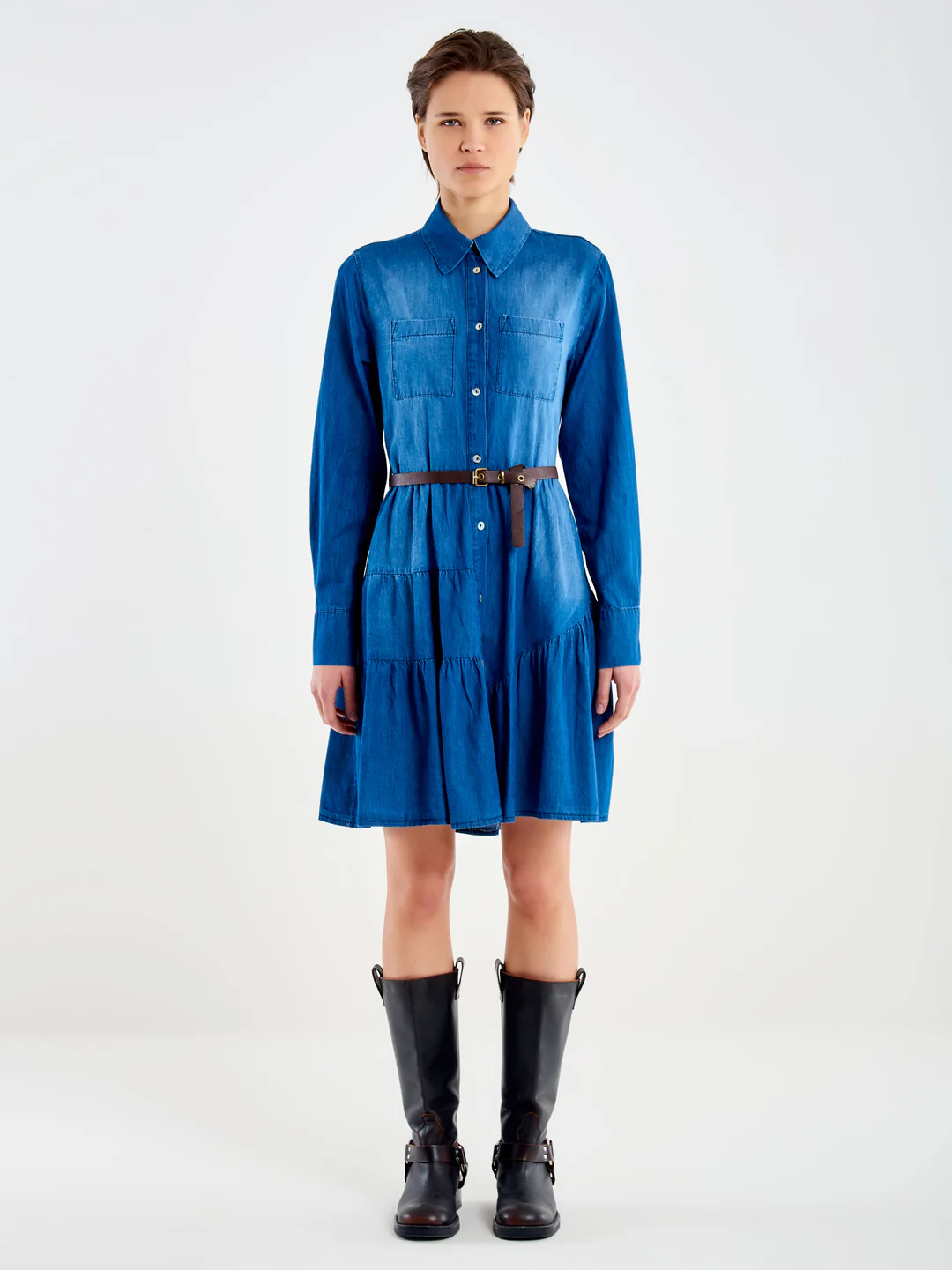 Κοντό φόρεμα με βολάν, μακριά μανίκια και κλασικό γιακά. Κλείσιμο με κουμπιά μπροστά. Βολάν στο στρίφωμα. Τσέπες με μπαλώματα στο στήθος μπροστά. Περιλαμβάνεται ζώνη.