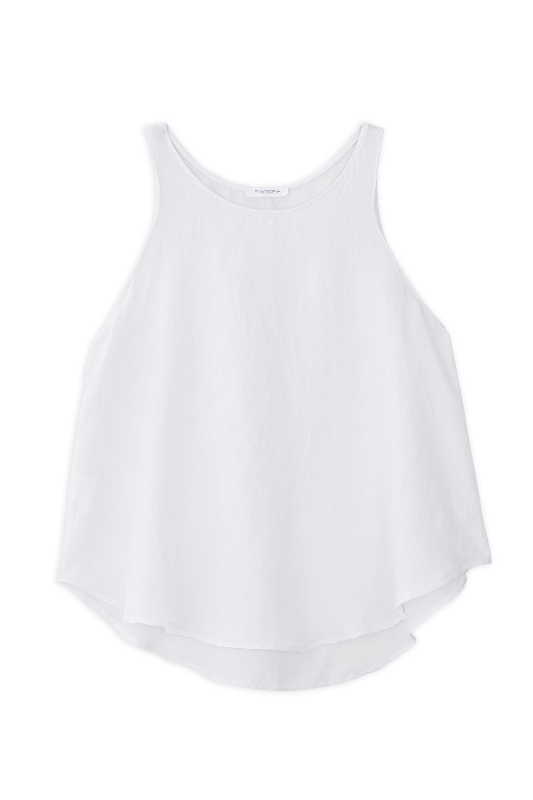 Αέρινο τοπ από 100% rayon με χαλαρή γραμμή που αγκαλιάζει το σώμα χωρίς να περιορίζει. Η στρογγυλή λαιμόκοψη και οι φαρδιές τιράντες προσφέρουν άνεση και σταθερή εφαρμογή, ενώ το ασύμμετρο μήκος κολακεύει περισσότερο τη σιλουέτα.