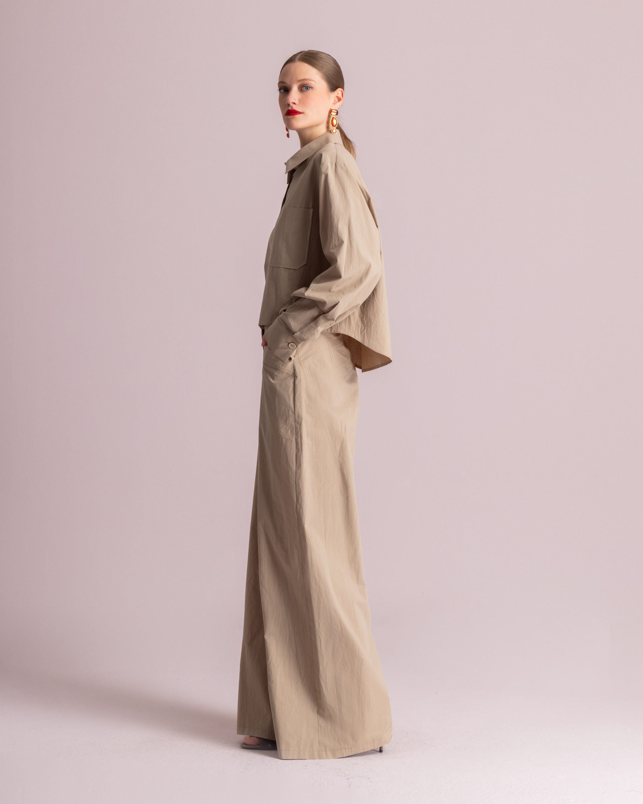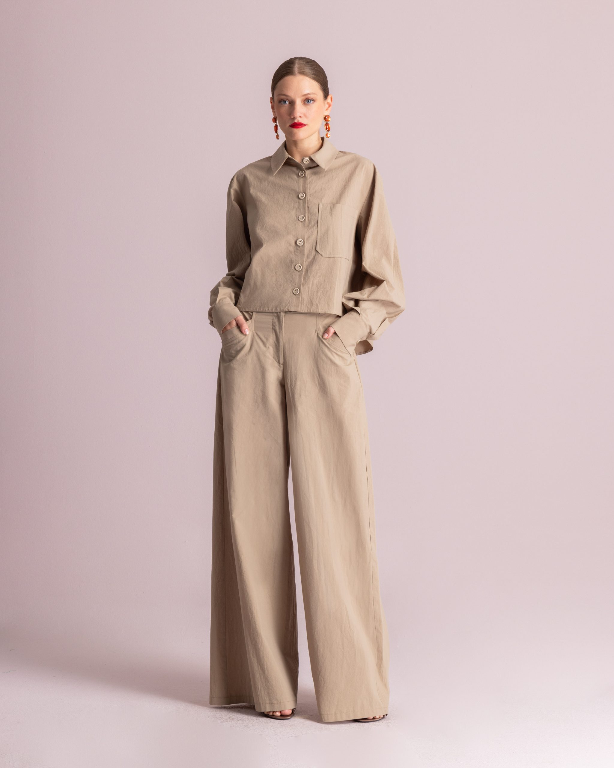Φαρδιά βαμβακερή παντελόνα από ελαφρύ ύφασμα. Διαθέτει δυο μπροστινές τσέπες, και θυλάκια για ζώνη. Κλείνει με κουμπί και φερμουάρ.